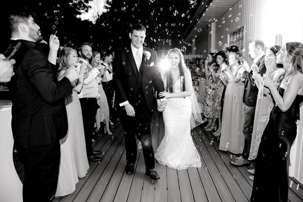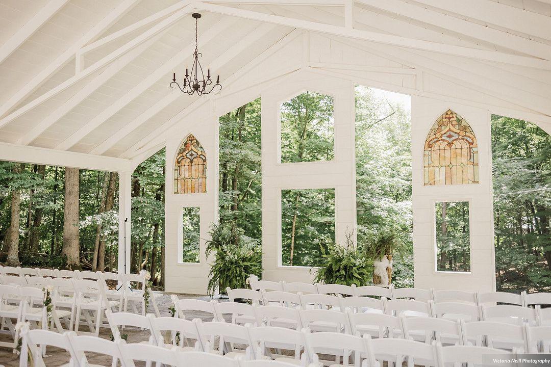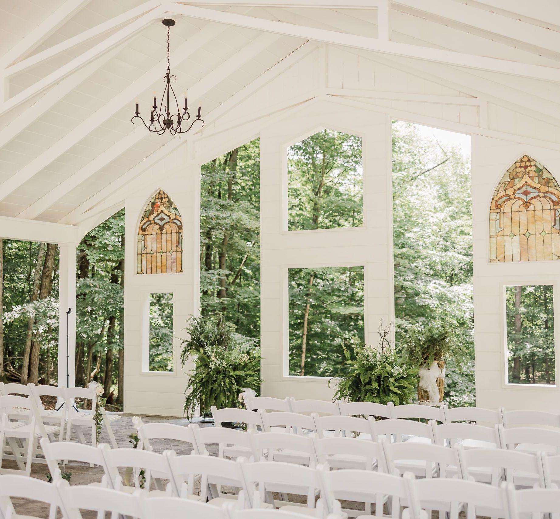 Couples love the open air chapel among the trees and next to the ornamental pond. The large indoor reception space has floor to ceiling white shiplap. Guests love the 60ft outdoor deck overlooking the open air chapel.