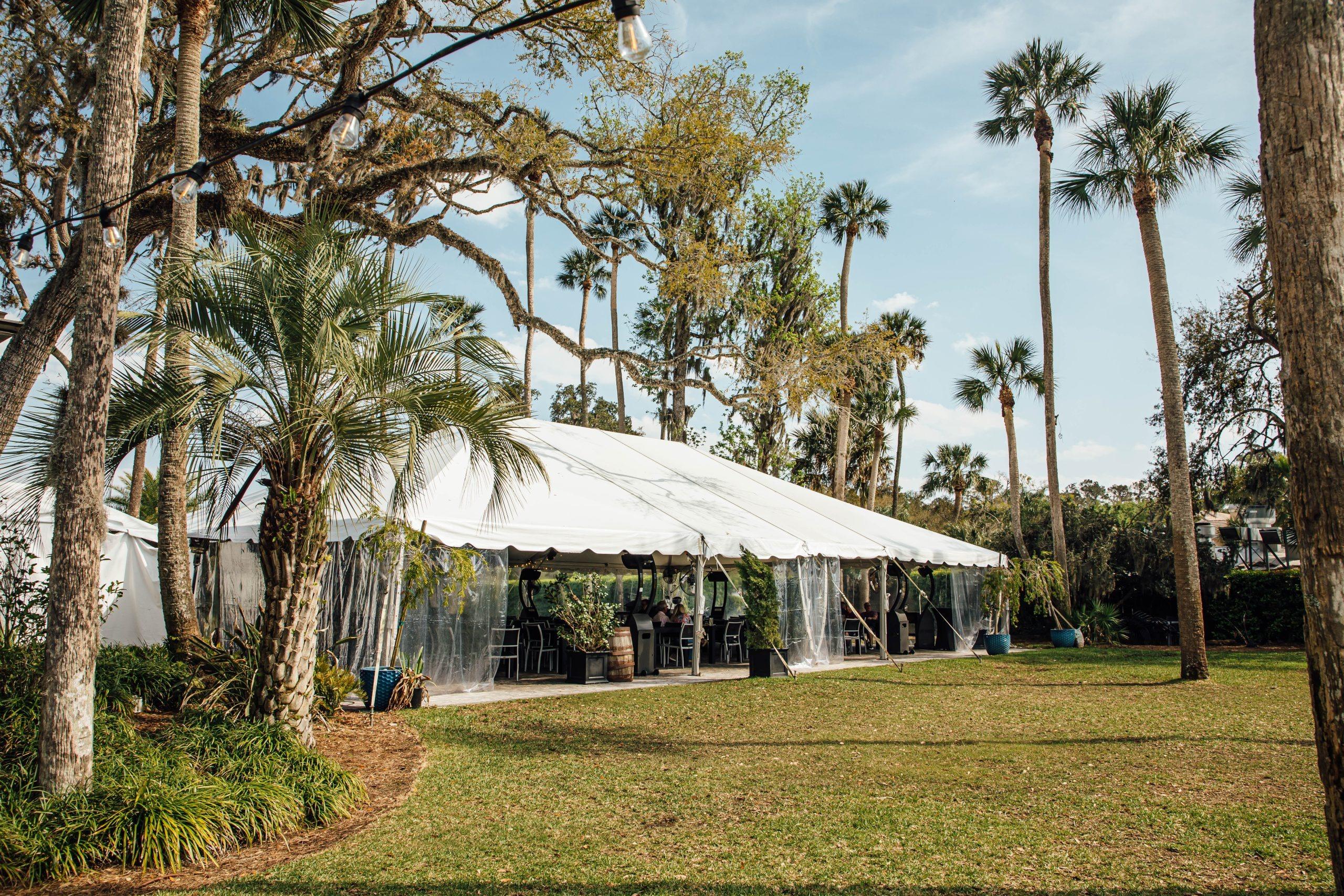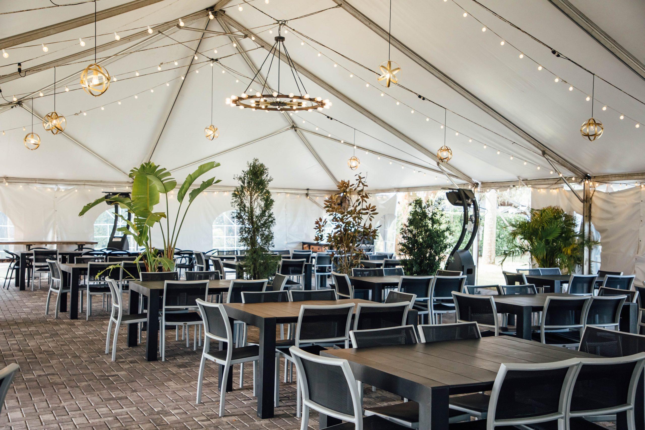 Set against a backdrop of lush greenery and water views, this expansive lawn features a large white tent with open sides, providing comfort and coverage without sacrificing the natural beauty of the surroundings. String lights and potted greenery enhance the relaxed yet refined ambiance, while ample seating beneath the tent ensures guests stay comfortable throughout your event.