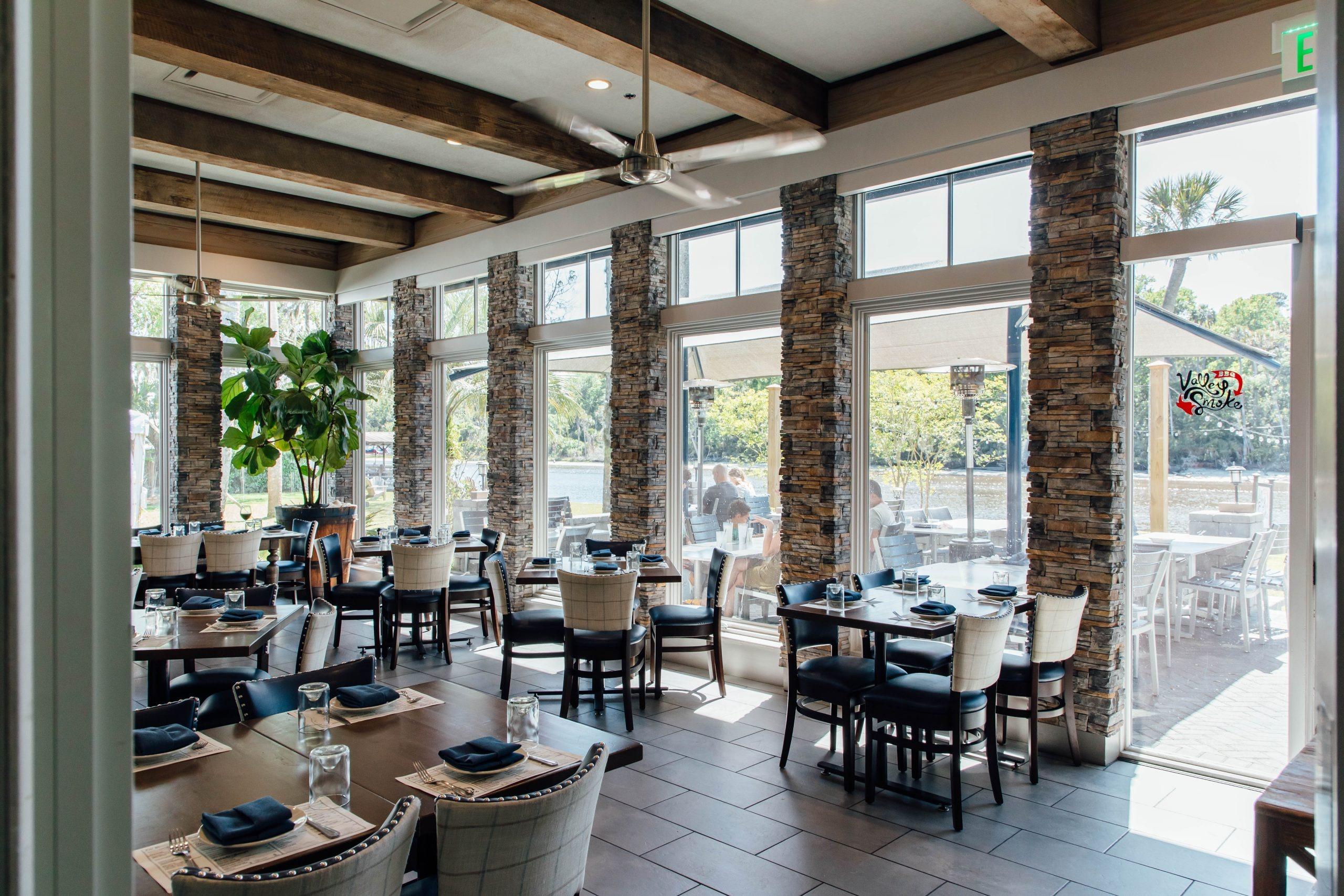 Welcome to The Porch, a beautifully appointed semi-private space that offers the perfect blend of indoor comfort and outdoor ambiance. Surrounded by floor-to-ceiling windows and natural stone accents, The Porch provides panoramic views of the scenic waterway, creating a serene yet lively backdrop for your event. Ideal for intimate gatherings, luncheons, or celebratory dinners, this space features stylish, comfortable seating and direct access to an outdoor patio, allowing your guests to enjoy the fresh air and vibrant surroundings with ease. Whether you're planning a casual affair or a more polished event, The Porch delivers an inviting, light-filled setting with flexible functionality.