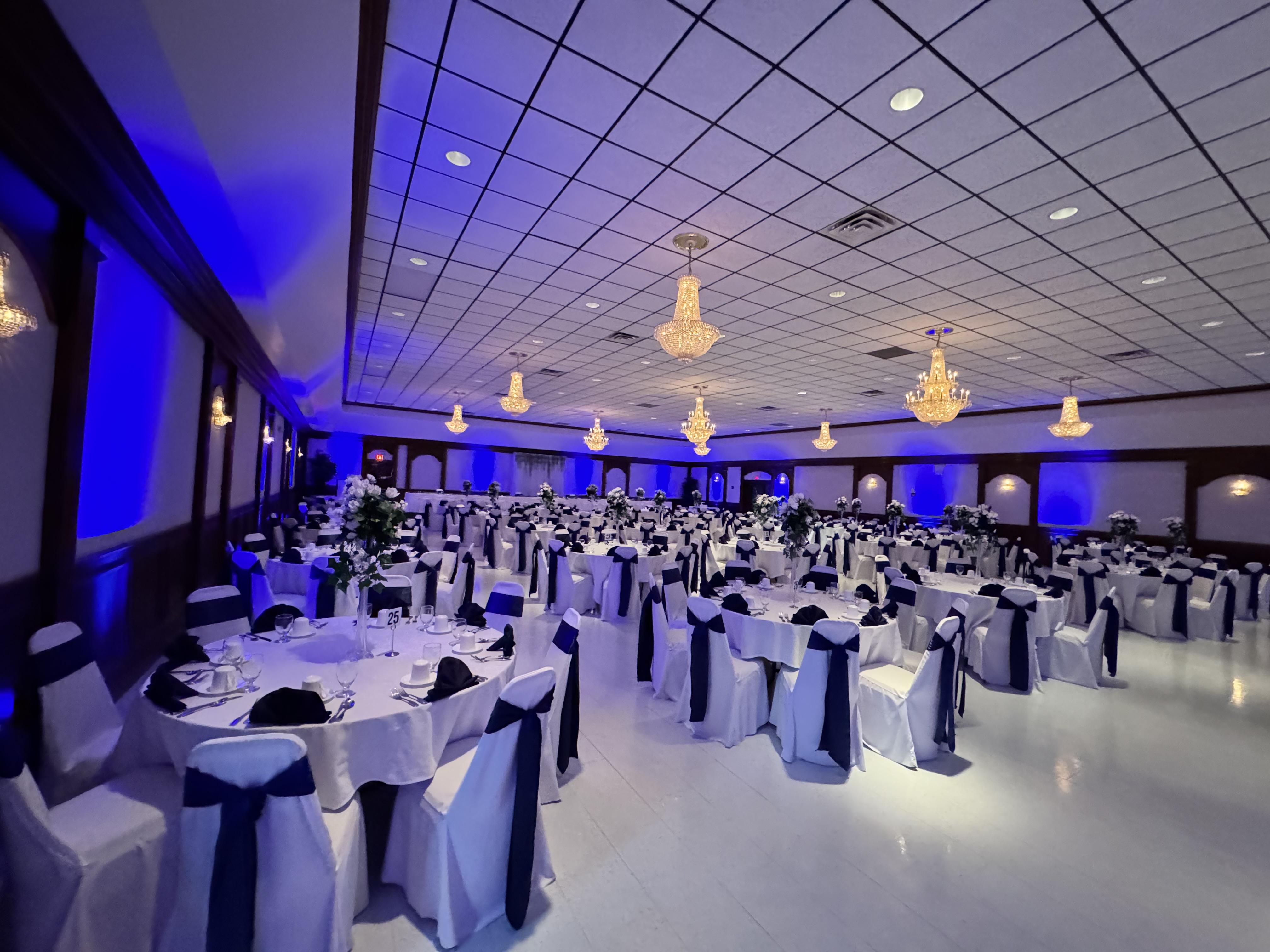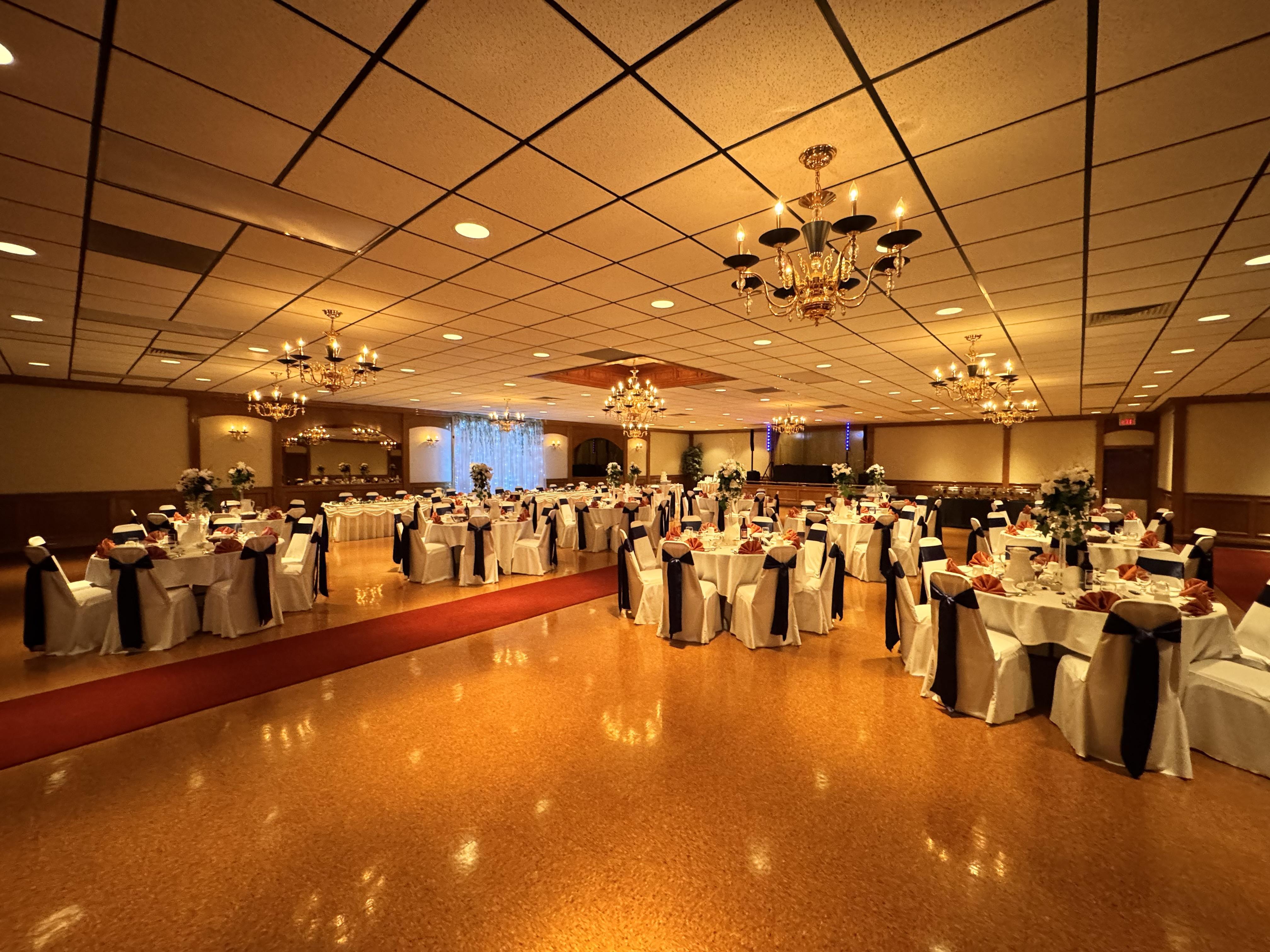 • Stage area for DJ or entertainment • Central air conditioning and heat • Bar area with coolers • Wheelchair-accessible restrooms • Ambient lighting and chandeliers • Classic wood detailing along the walls