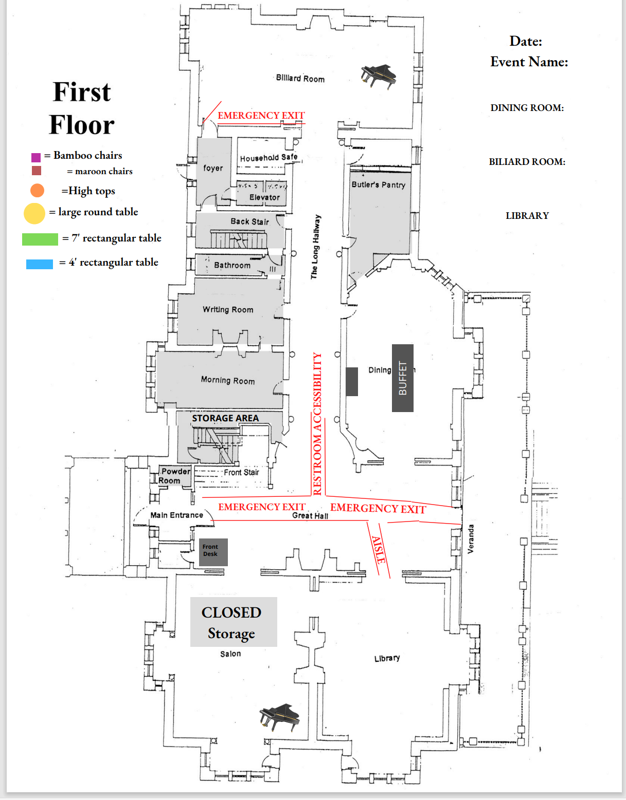 SPACES AVAILABLE: Great Hall: 50 x 25 feet Dining Room: 32 x 16 feet; buffet table (seats 12) plus 3 tables of 8 or seating for 24. Library: 31 x 25 feet Billiard Room: 18 x 40 feet Long Hallway Small Butler’s Pantry/Kitchen 13 x 18 is available for catering. Caterers may enter through the garden door.