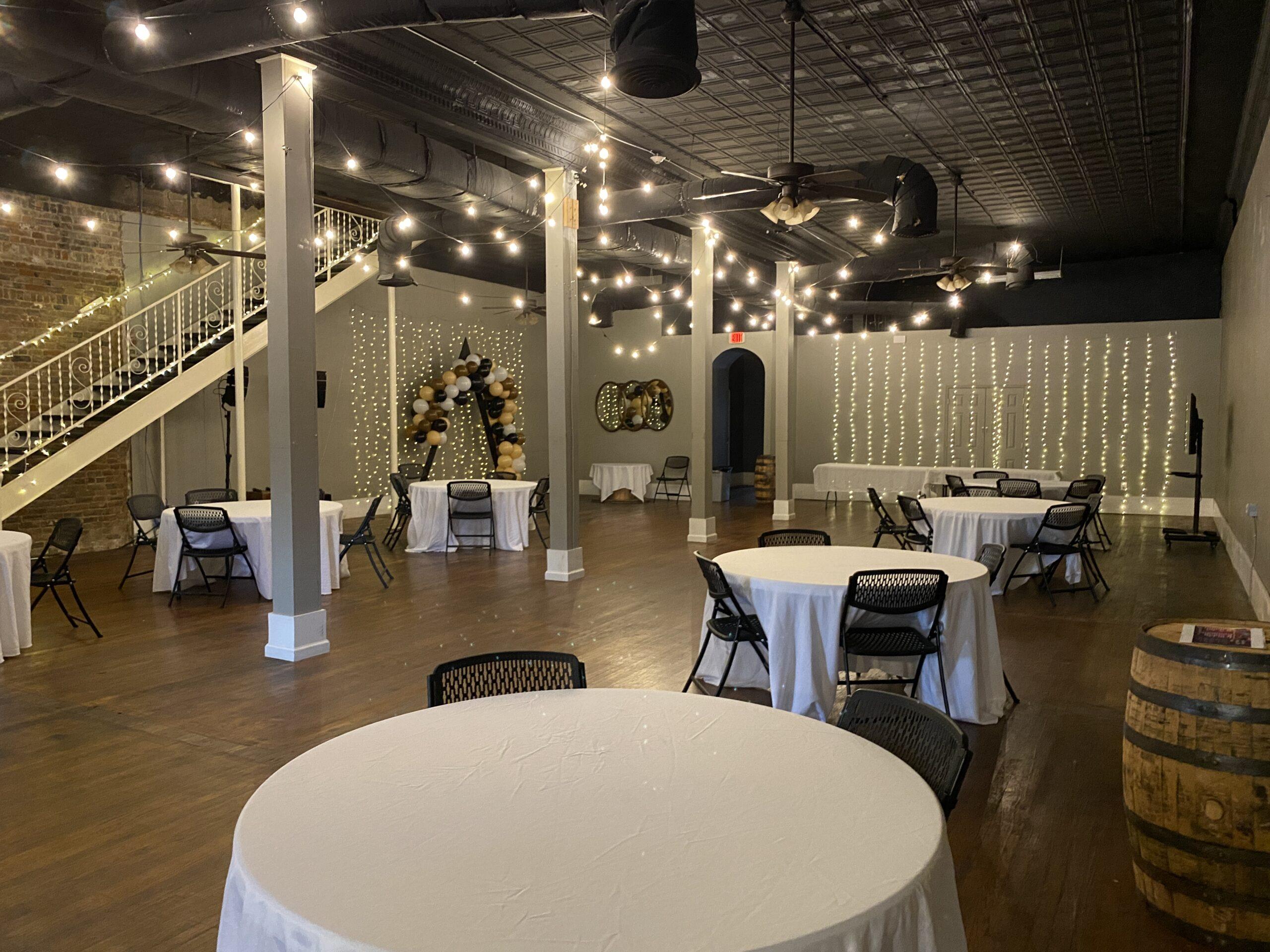 Located at 111 1st Ave North, Lewisburg TN, our historic space is the most unique and flexible event space in Lewisburg. This amazing venue features a unique look that is sure to fit well with any event that you choose to host. Our building dates back to 1908 and is a true staple to the town's history. As your guests enter the space and walk onto the beautiful original wooden floors, they will walk towards the main event room which features striking lighting decor that will surely make your celebration an unforgettable affair. You can rent the entire space for a party of up to 150 people.