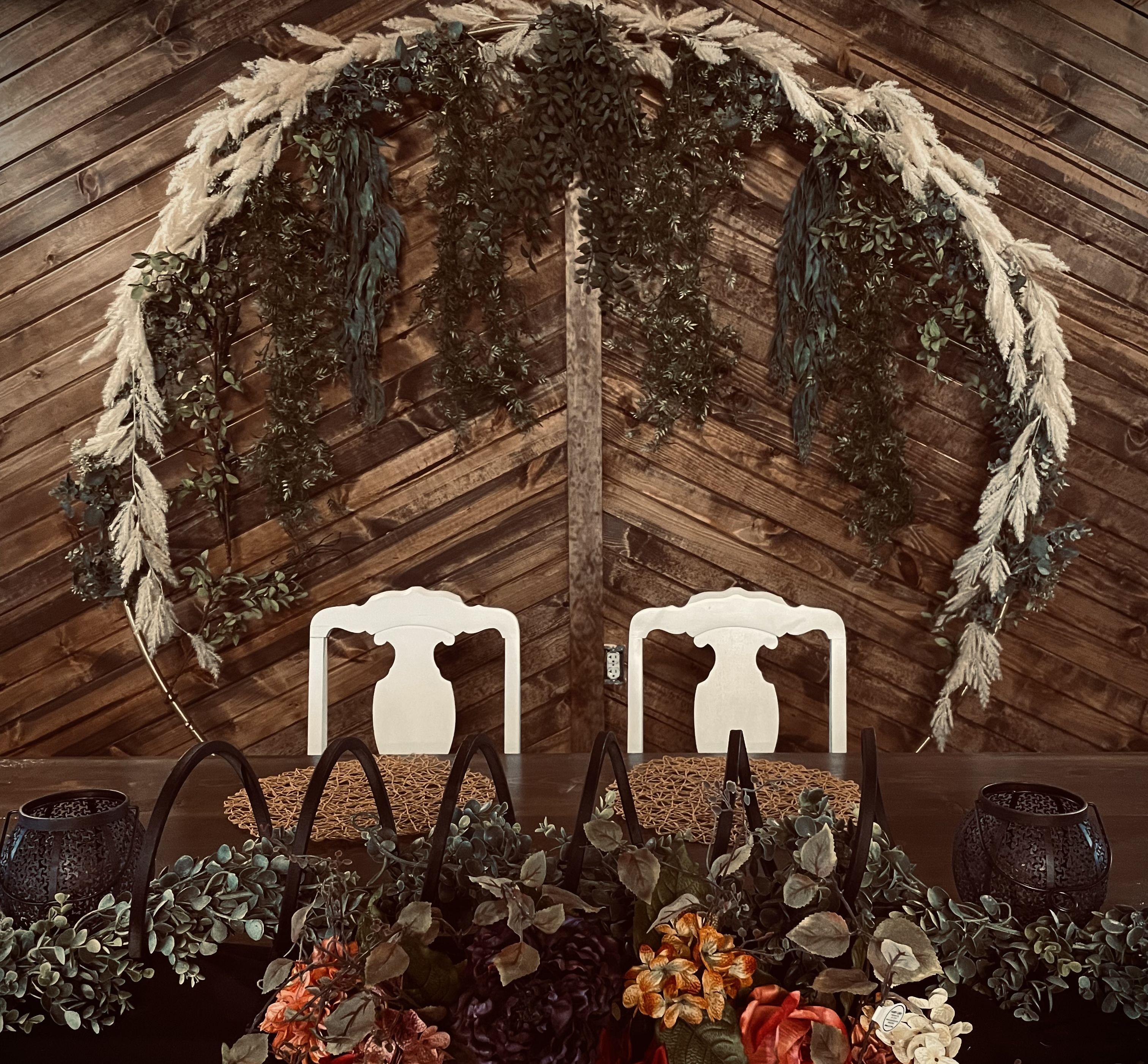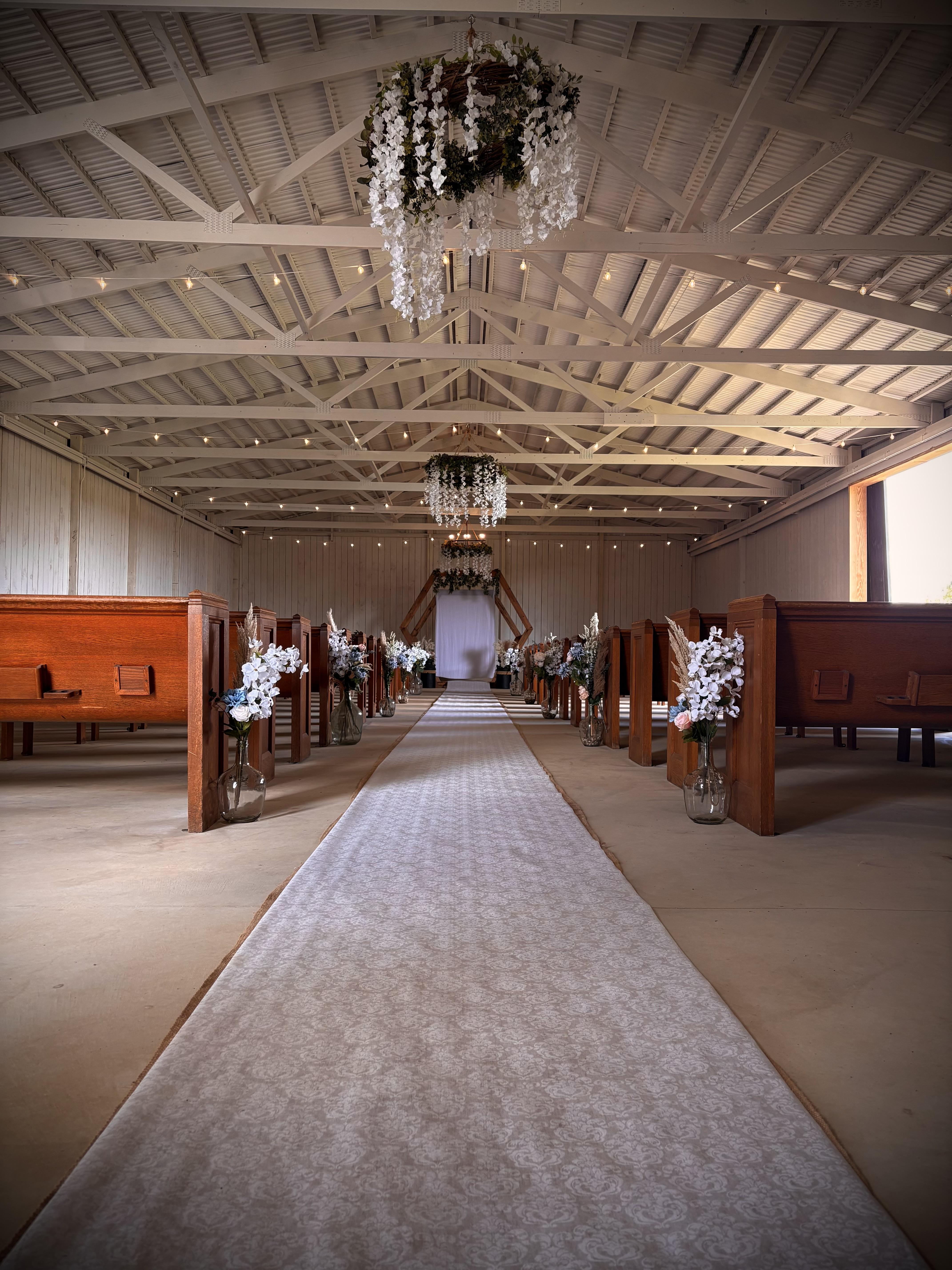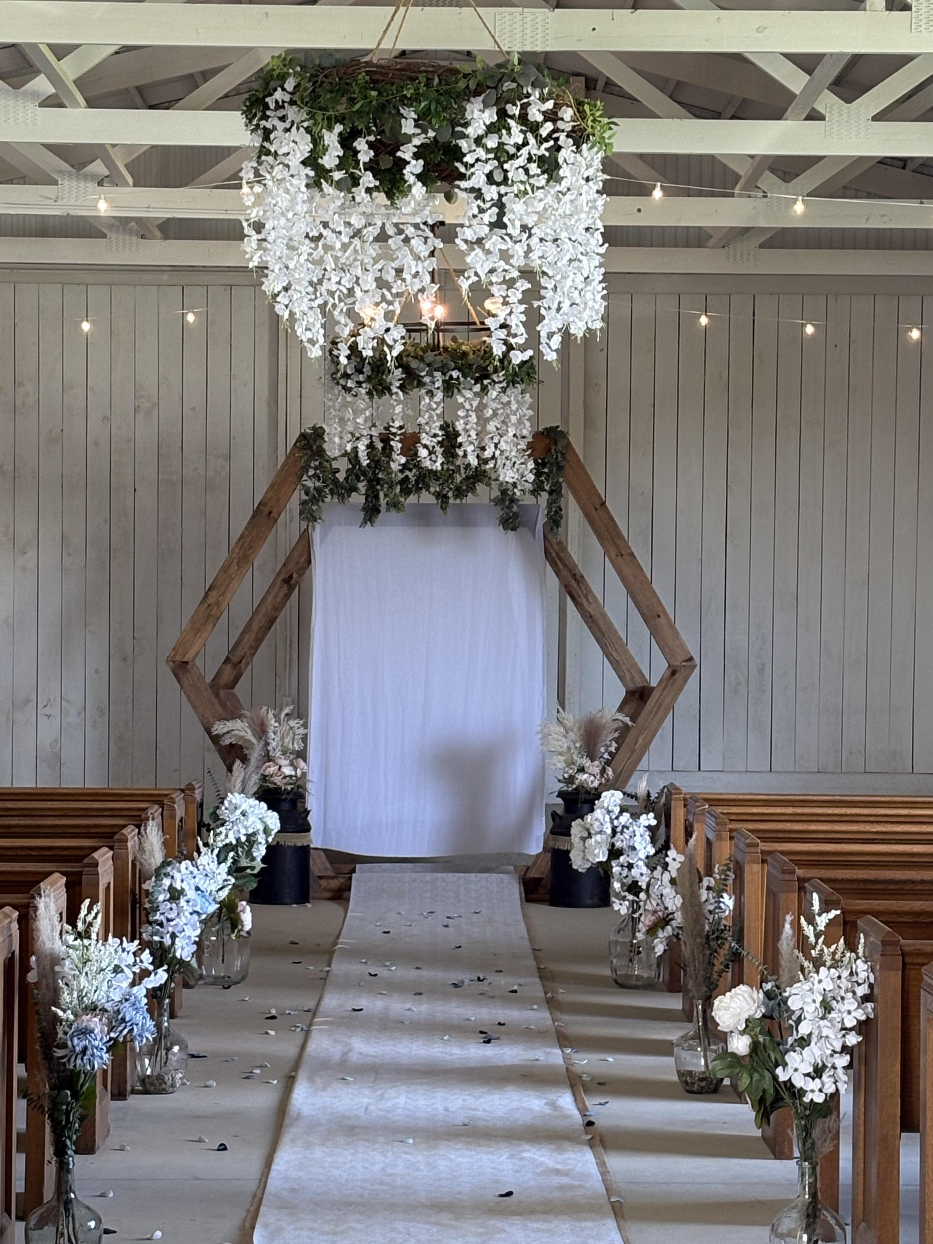-Fully customizable (provided decor optional) -26 church pews -Large aisle (runner provided) -Large double hexagon wooden arch (customizable)