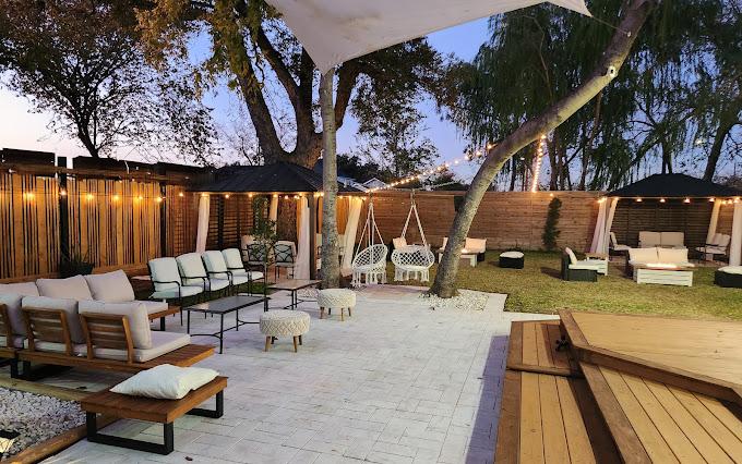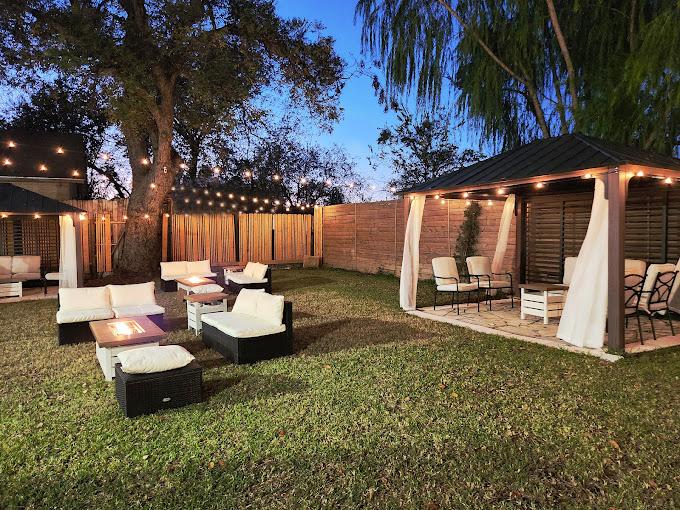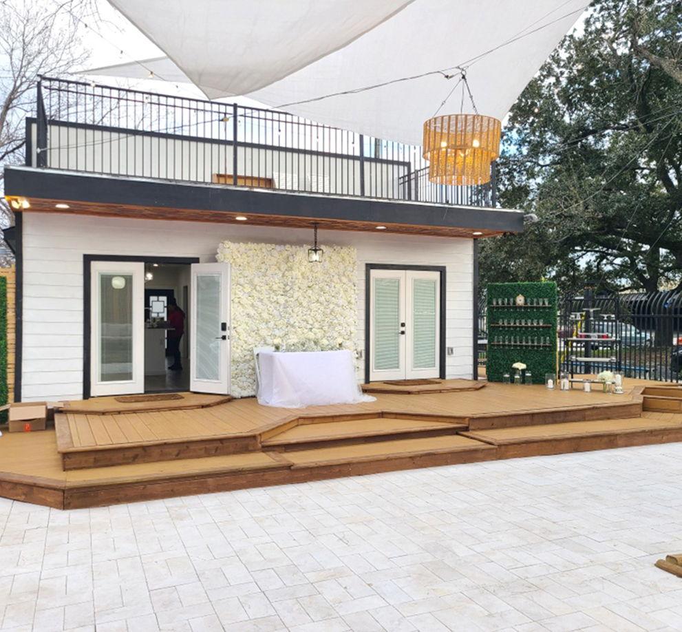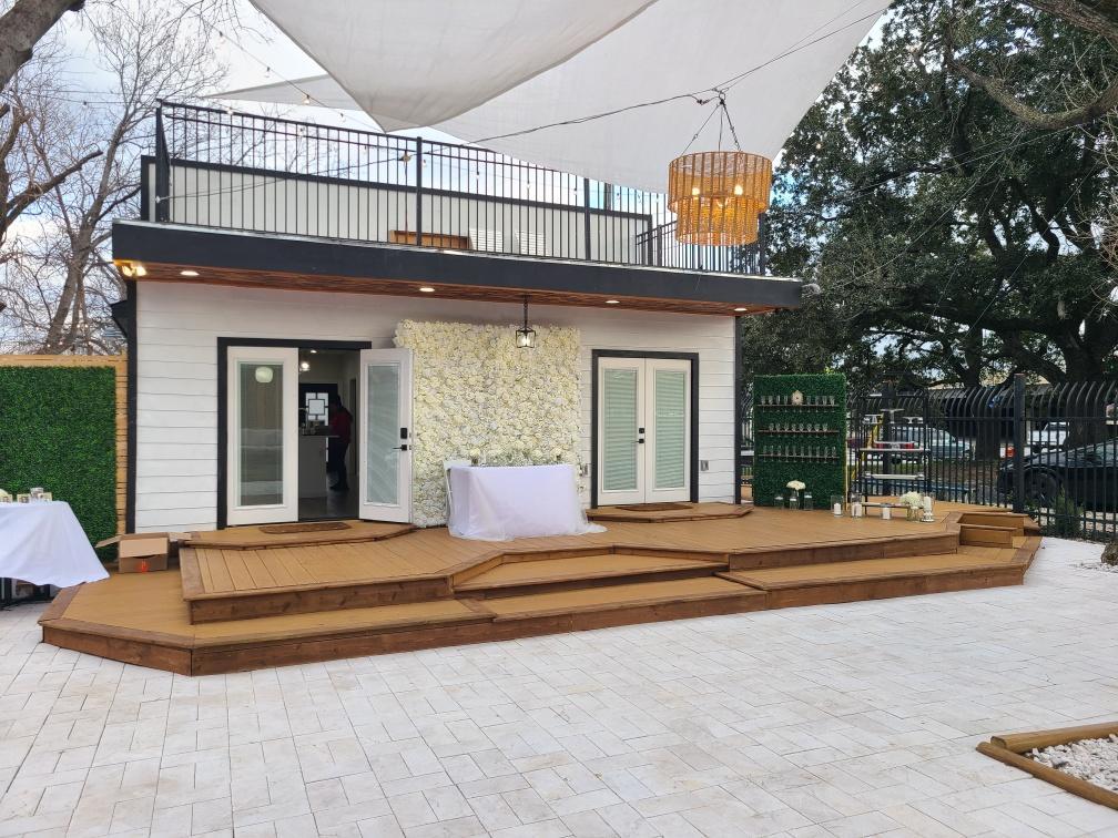 Beautiful upscale bungalow with a huge modern deck Unique outdoor mobile bar carts and food serving carts Kitchen to warm up food (microwave, refrigerator, stove, sink, oven) We don't allow cooking 2 restrooms with toilet paper, sink 2 rooms 10’x12’ 2 gazebos with beige curtains Seating for 50 people 4 round tables of 36" with 20 chairs Outdoor strings lighting 2 outdoor fans 15 free parking on-site Wifi Electricity 110V