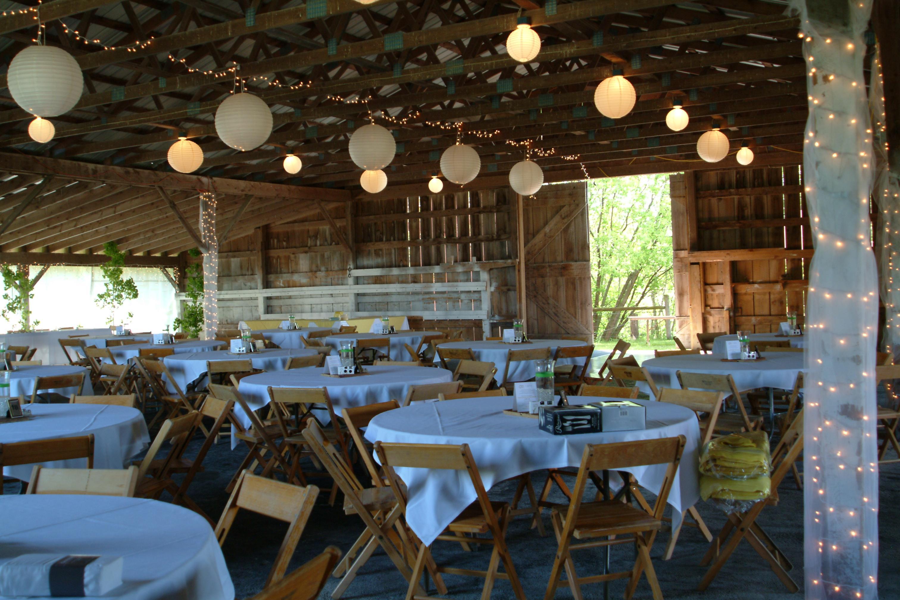 This former hay barn opens to the Forest Glen (cocktail) lawn, Haywagon end doors opening (one to the bonfire area), and the Grand entrances thru the front walk through (sunset) doors which access the wedding (game area) lawn. We are limited to one event most weekends so you won't be sharing space and an exclusive warm season venue. The lights are up for you, tables and chairs ready to be placed by your design for guests and a bar area/cocktail lawn to recieve your celebrants