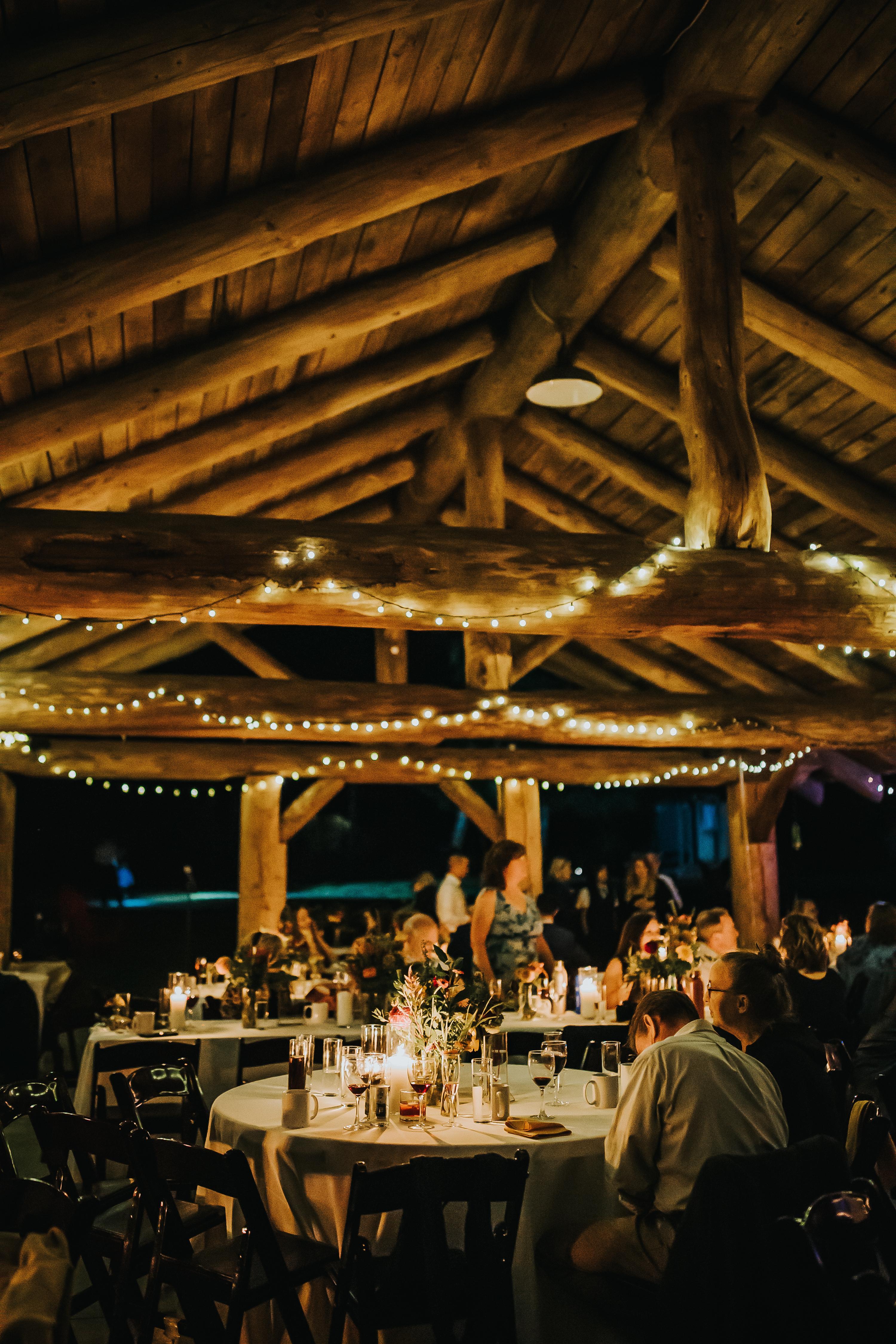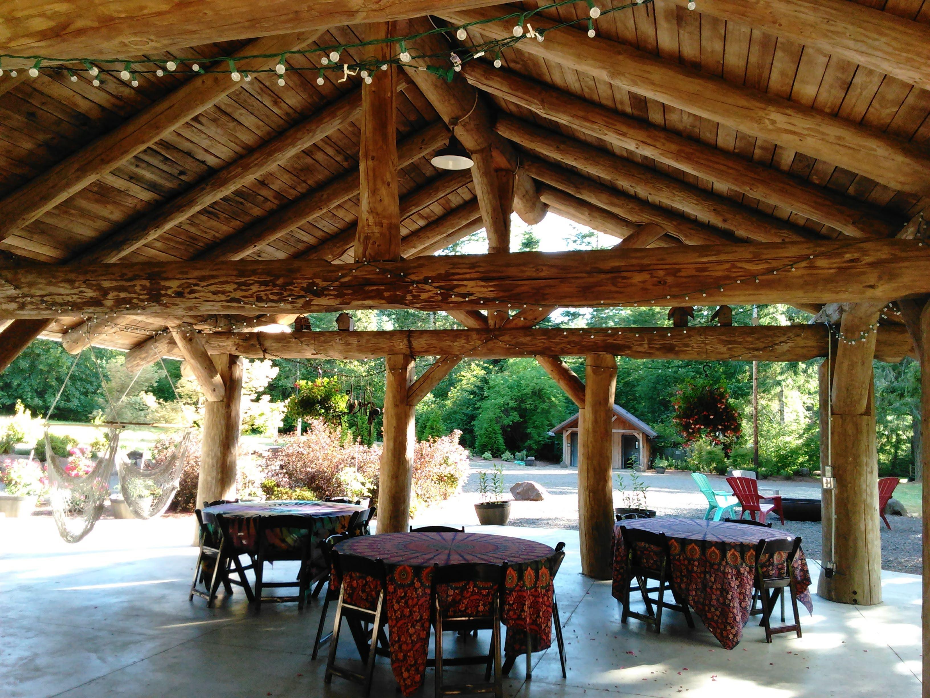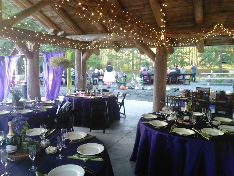 -String Lighting, 120 chairs & 13 tables, massive log buffet table, fir slab wine barrel bar, and fir slab gift table on winer barrels.