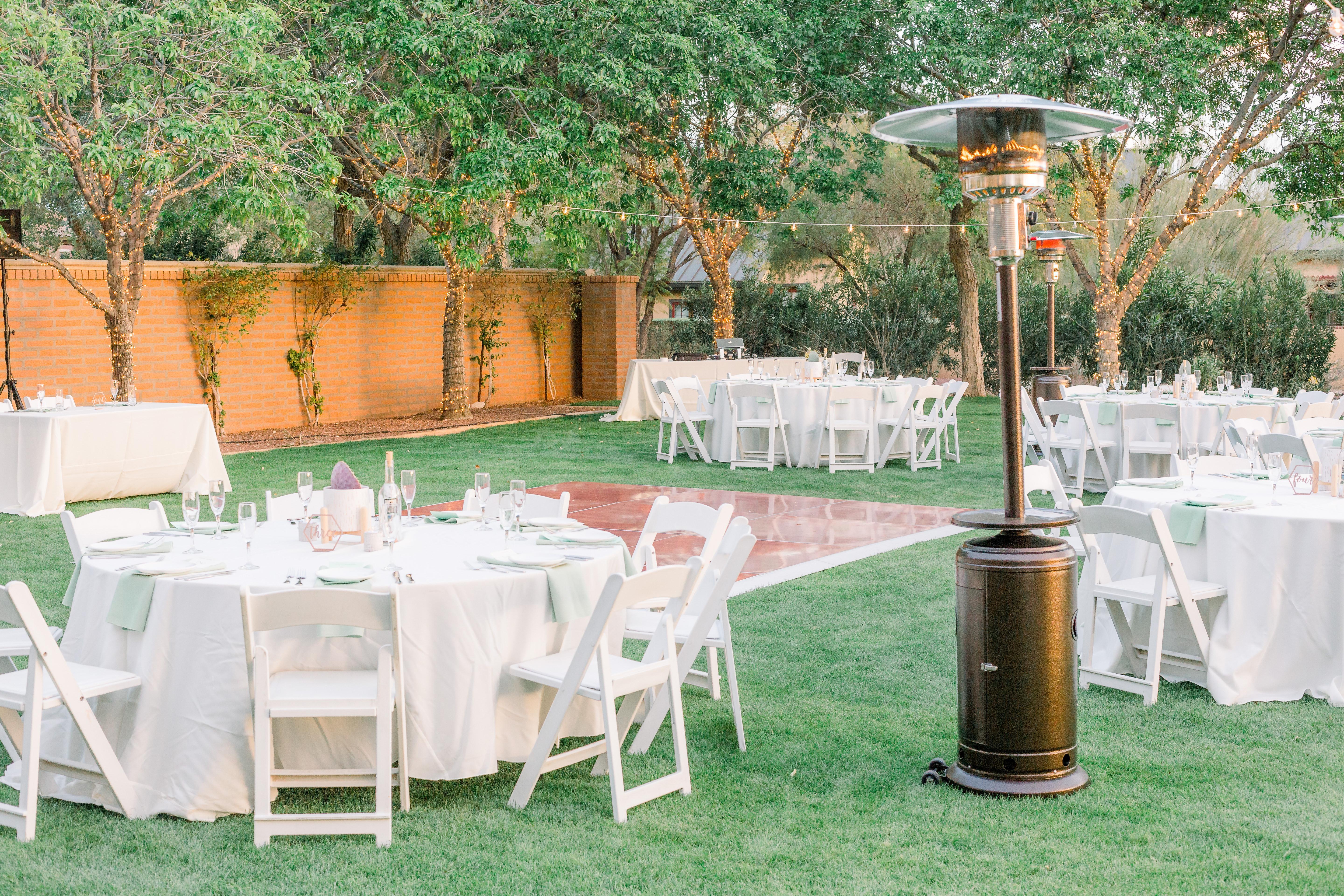 An intimate garden setting located among mature Ficus, Palo Verde and Ironwood trees with picturesque views of the White Tank Mountains. An evening wedding enjoys the added elegance of romantically lit trees.