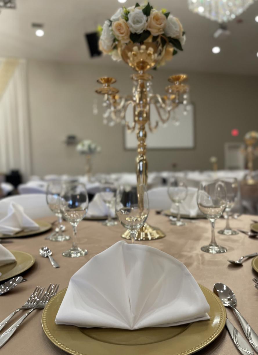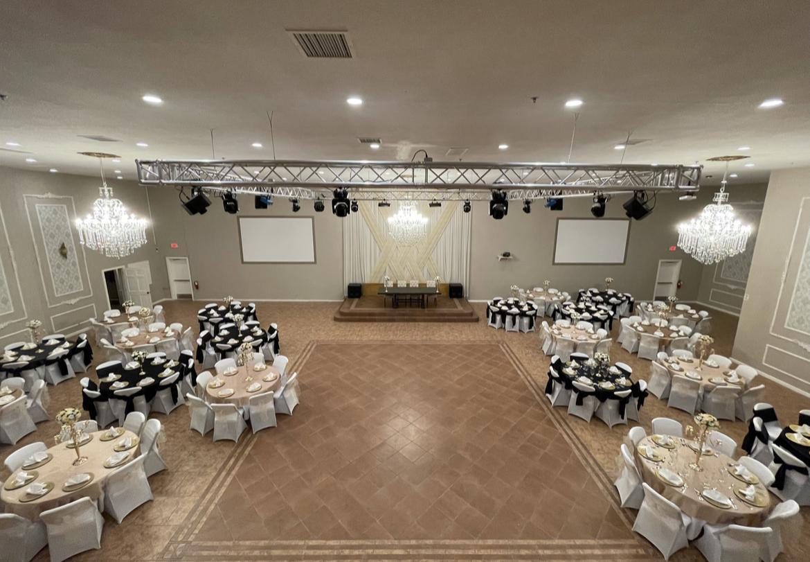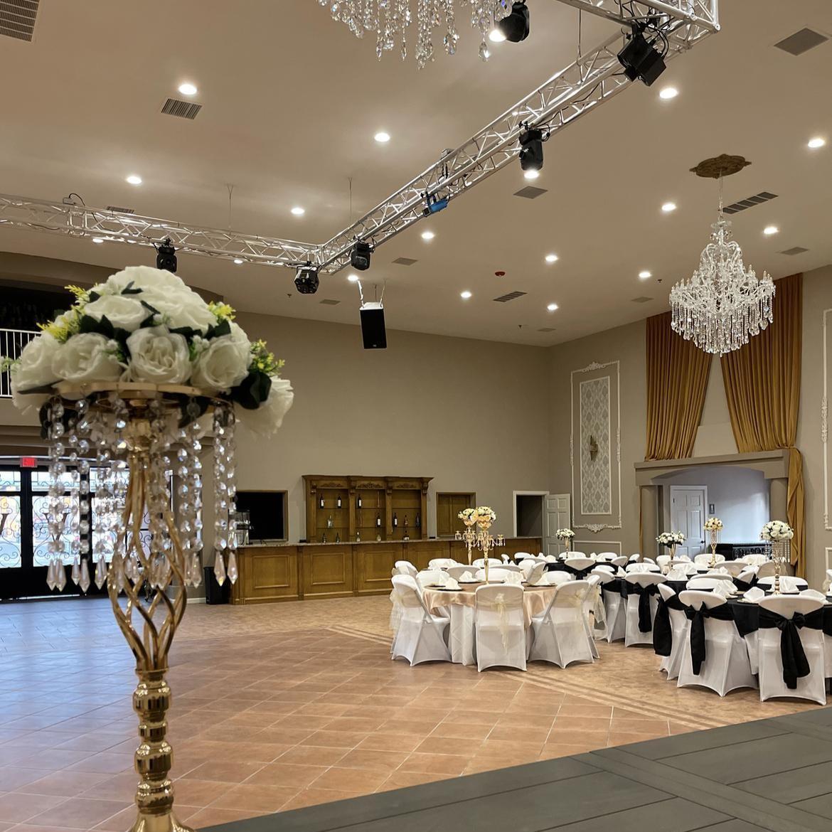 The Versalles Palace Event Center showcases a regal aesthetic setting. Its upper level features a refined bridal and groom suite, accompanied by a comfortable living room-like space. Accommodating up to 460 individuals, it caters to size-able gatherings. The private parking lot adds a touch of convenience for your guests. Offering an all-inclusive package encompassing catering, DJ, bar services, 360 Photo booth and more! We ensure a smooth and stress-free event.