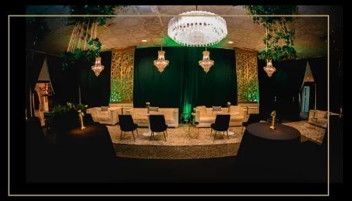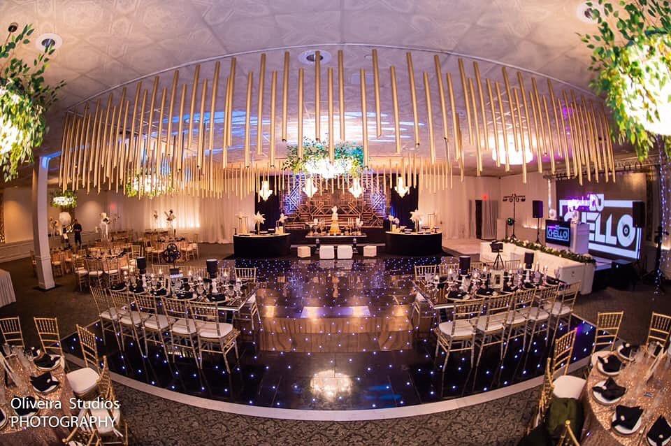 This Ballroom has access directly to the bar, gorgeous crystal chandeliers and golden decorative wood on the wall.
