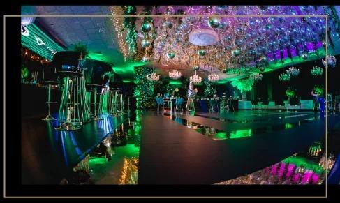Welcome to our main ballroom, featuring a spacious LED dance floor, an expansive area with a stage, a stunning large LED screen, gorgeous crystal chandeliers, and elegant golden wood detailing on the walls.