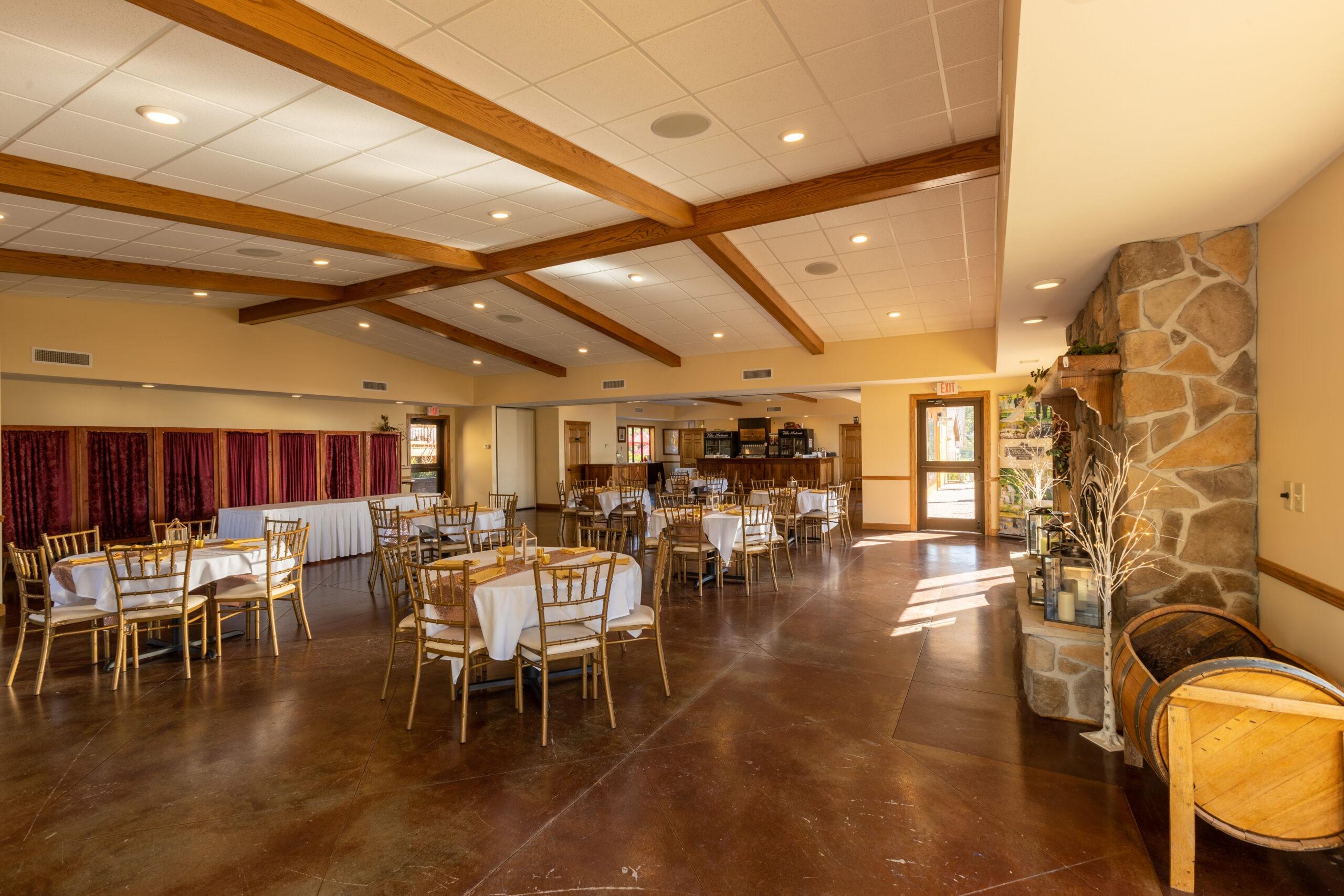 Our newest venue is the Grand Pavillion. At just over 3000 square feet it confortably seats up to 140 guests and is fully climate controlled. The Pavillion features vaulted wooden ceilings with both recessed and party lighting. Thirteen large glass doors provide unparalleled vineyard and lake views regardless of weather conditions.