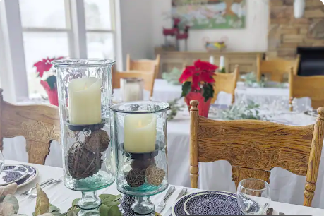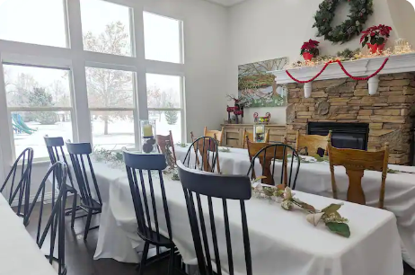 - 6 folding tables with adjustable height - Gas fireplace - Three dining and party spaces