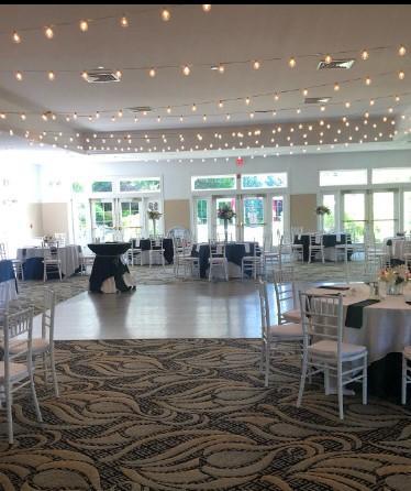 60" round tables White Chiavari Chairs with cushion Linens in white/ivory or black Garden String Lights