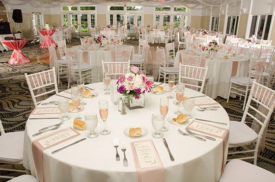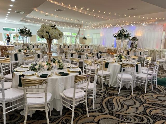 60" Round Tables White Chiavari Chairs Linens in White, Ivory or Black