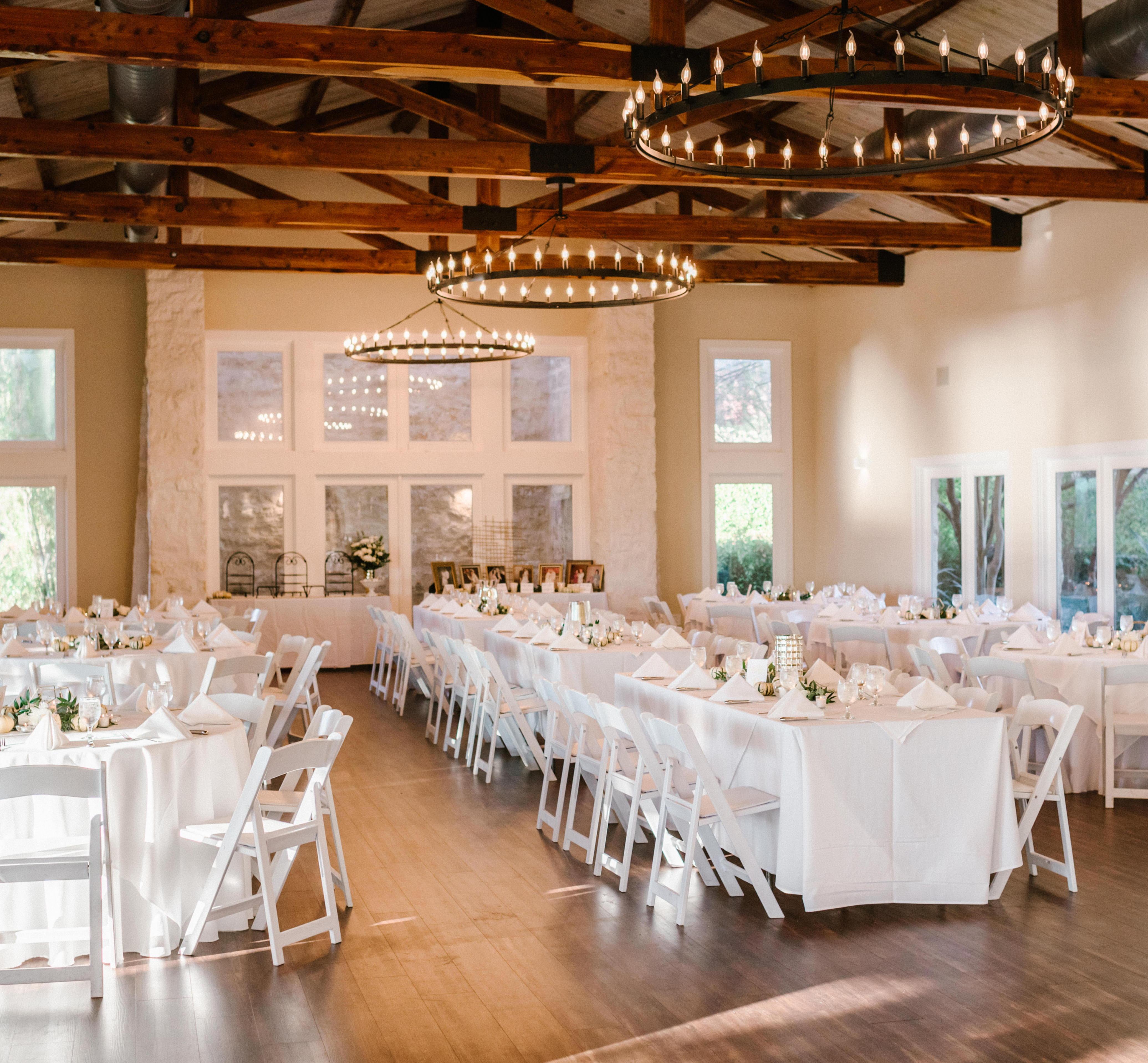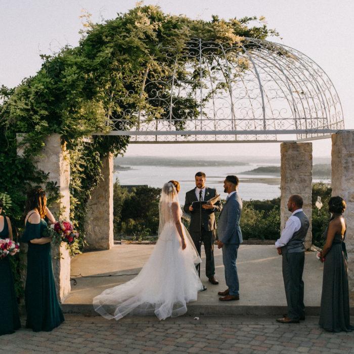 Our Gazebo + Event Center duo has a fairytale view of the beautiful Lake Travis. Our vintage Gazebo, topped with winding wisteria, offers you a private ceremony space with panoramic views of our lake sunsets. Included in this duo is our patio with lighted Live Oak tree, perfect for your cocktail reception. Our Event Center is done with dark wood floors and vaulted ceilings giving you the perfect backdrop to design the wedding of your dreams. Our Gazebo + Events Center can hold up to 299 guests.