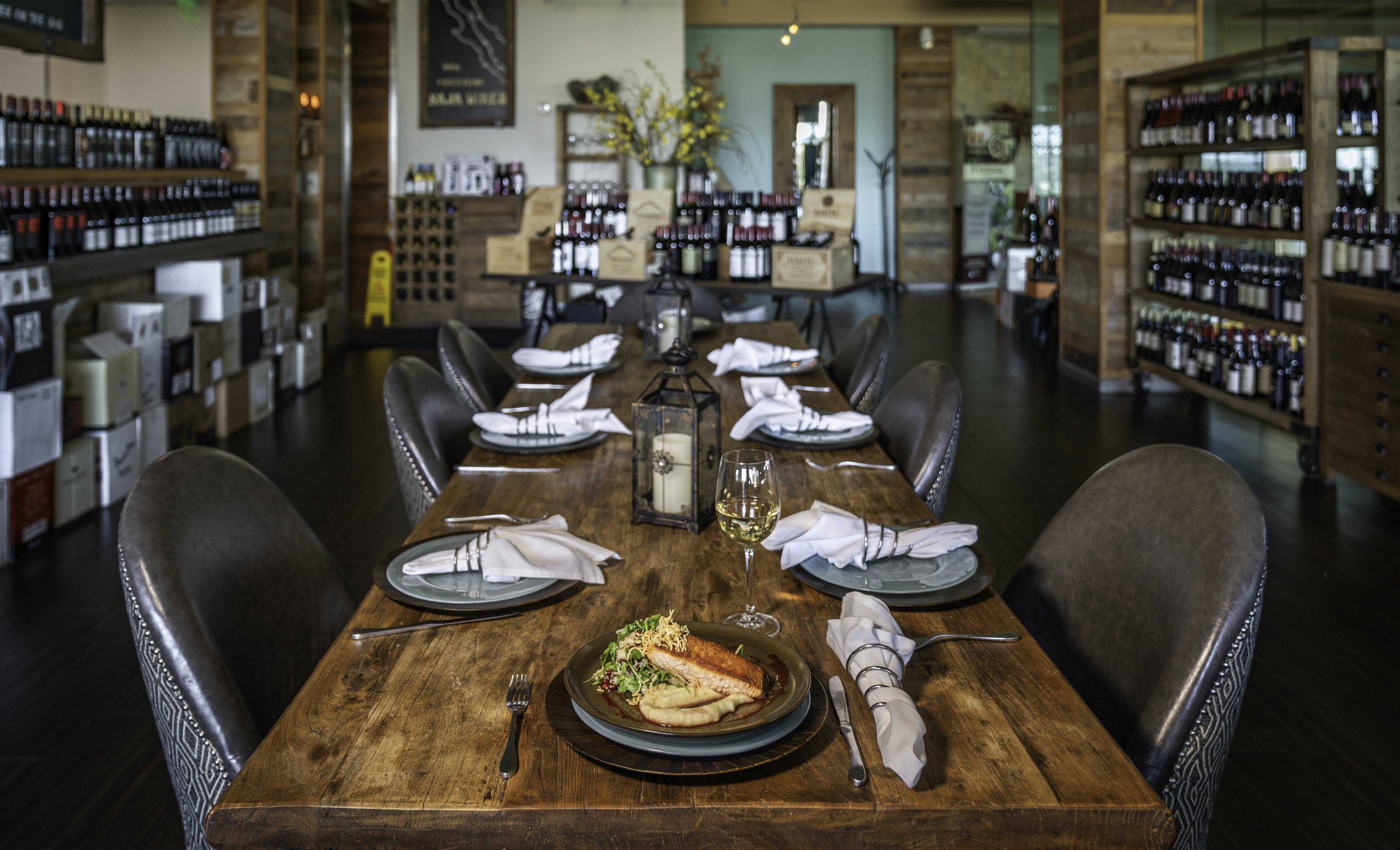 Our VIP Table offers a beautiful open-air group dining experience, perfect for wedding celebrations, rehearsal dinners, or intimate receptions. The long wooden table seats up to 24 Guests, creating a warm, communal setting surrounded by rustic wine displays. This lively yet elegant space allows your group to soak in the vibrant restaurant atmosphere while enjoying a cozy, romantic ambiance that makes every toast feel special.