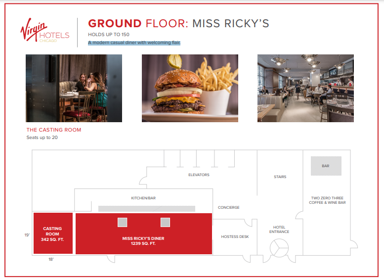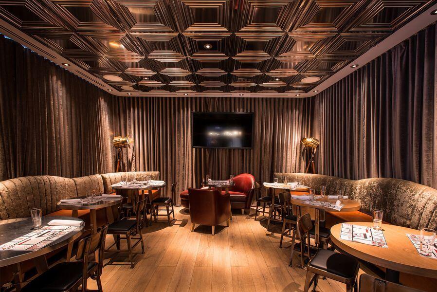 Located on the ground, Miss Ricky’s Diner offers a fun and energetic atmosphere. The Casting Room inside of the Diner offers a space for a more intimate event, complete with curtain-covered walls, velvet lounges and vintage gold stage lights.