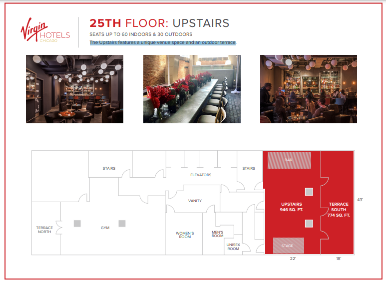 Located on the 26th floor, Cerise Rooftop allows you to discover a new point of view. With a feel reminiscent of your own London loft, space includes a fireplace, cozy furniture, private bar and wraparound deck with mesmerizing city views. Holds up to 120, indoor and out.
