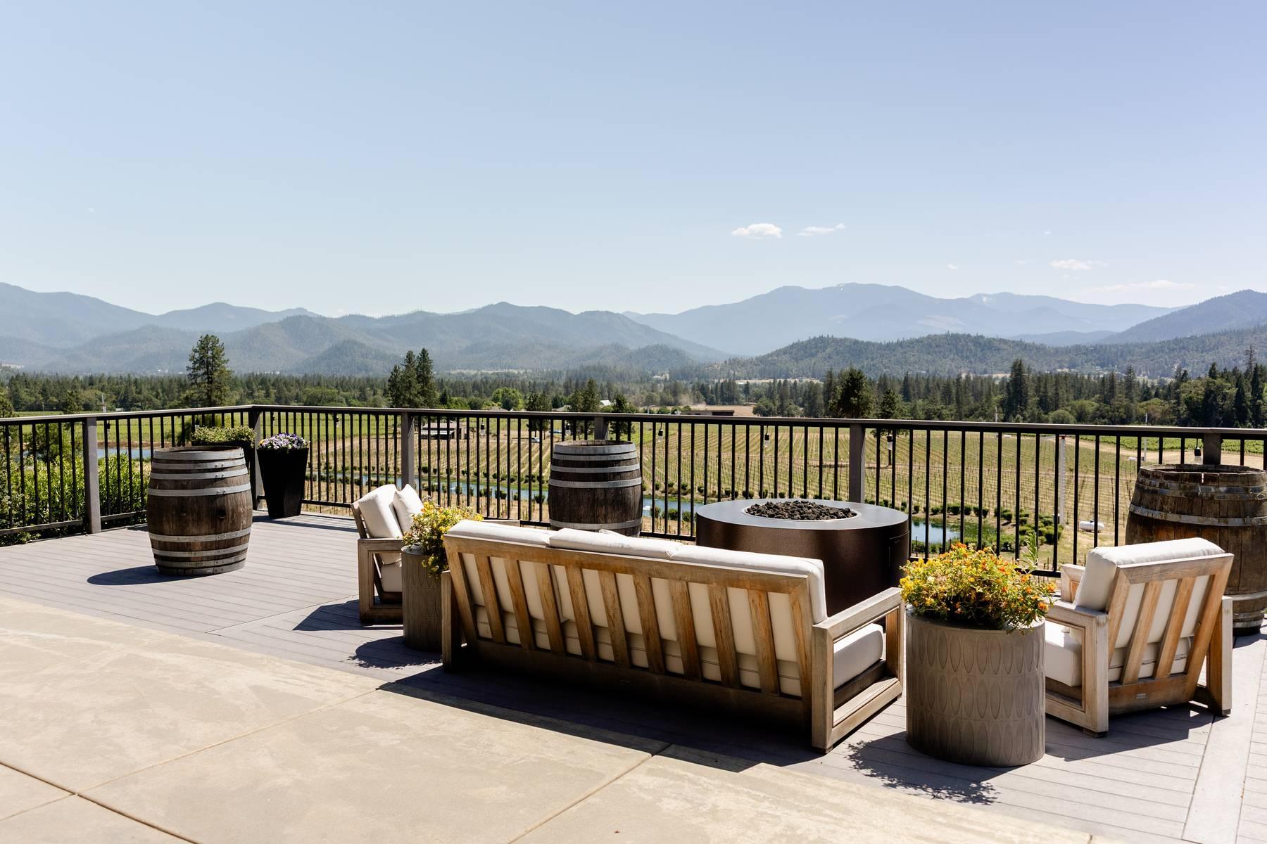 - Wireless Internet/Wi-Fi - Warm, inviting outdoor space - Romantic Edison string lighting - Panoramic vineyard, valley, mountain, water and sunset views - Partially covered for all-weather use - Cozy patio furniture with umbrellas and fire pits - Wine barrels for décor or casual gathering - Versatile layout for cocktail hours or event seating - Ideal spot for welcome tables, guest book, or gifts