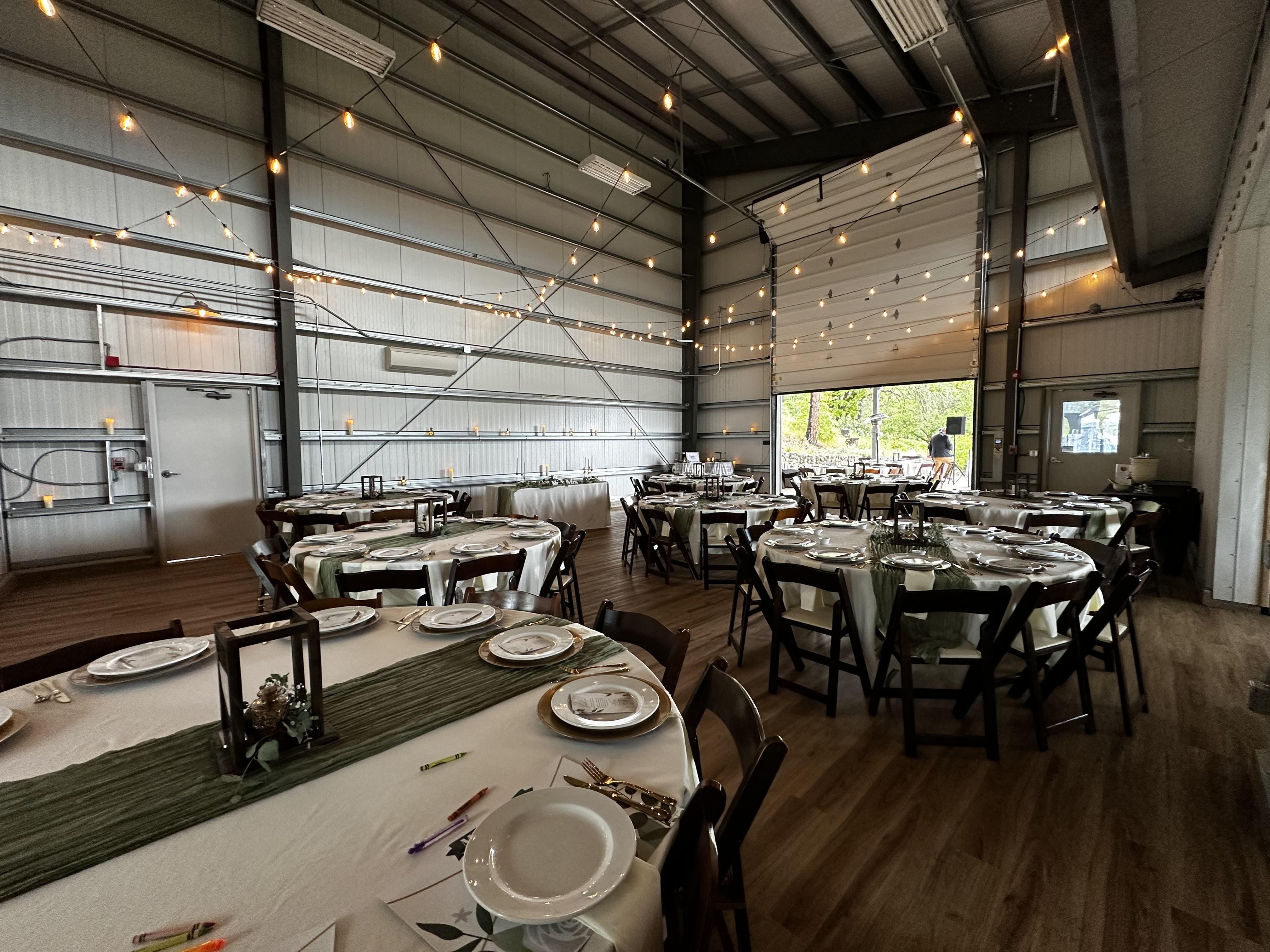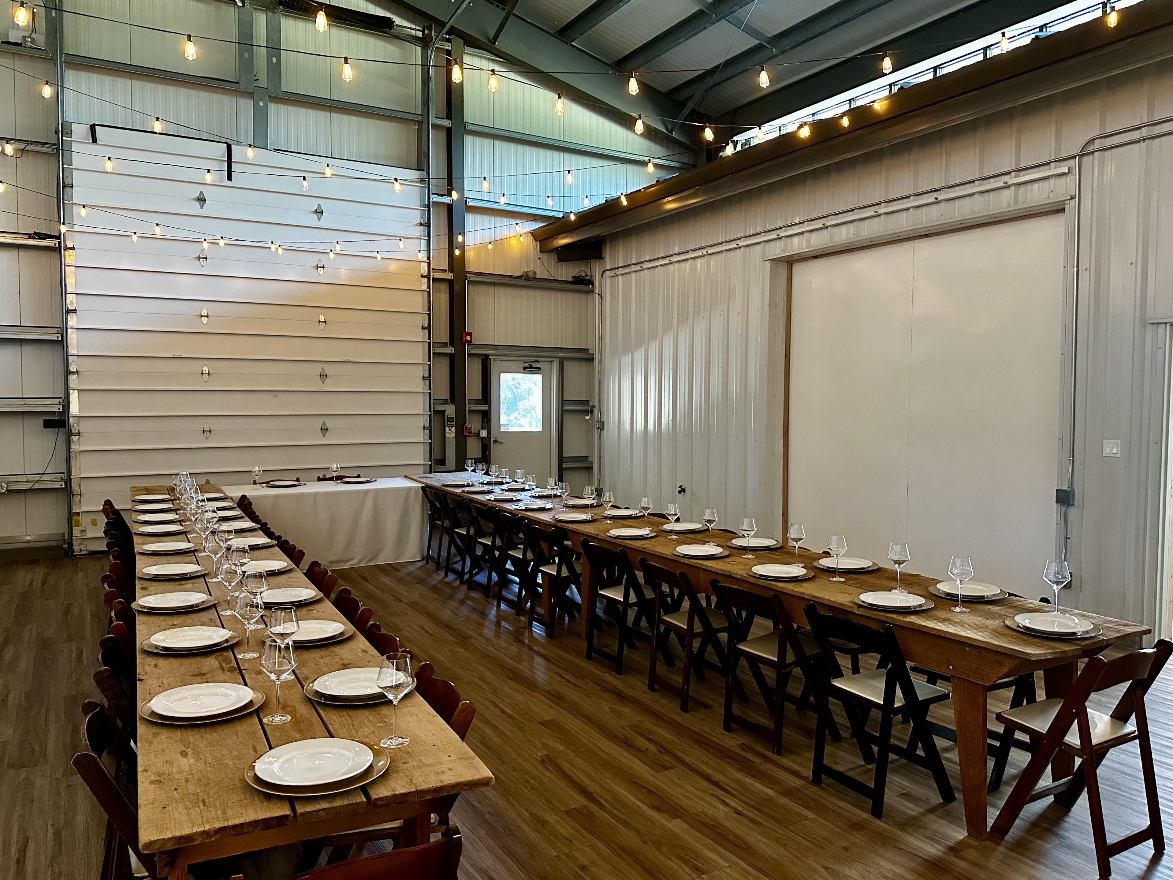 - Covered dance floor - Portable walls - Wireless Internet/Wi-Fi - Warm string lights overhead - Large garage-style door for seamless indoor-outdoor flow - Multiple electrical hookups - Scenic vineyard and mountain views - Versatile use for dancing, lounging, fire pits, or cocktail hour