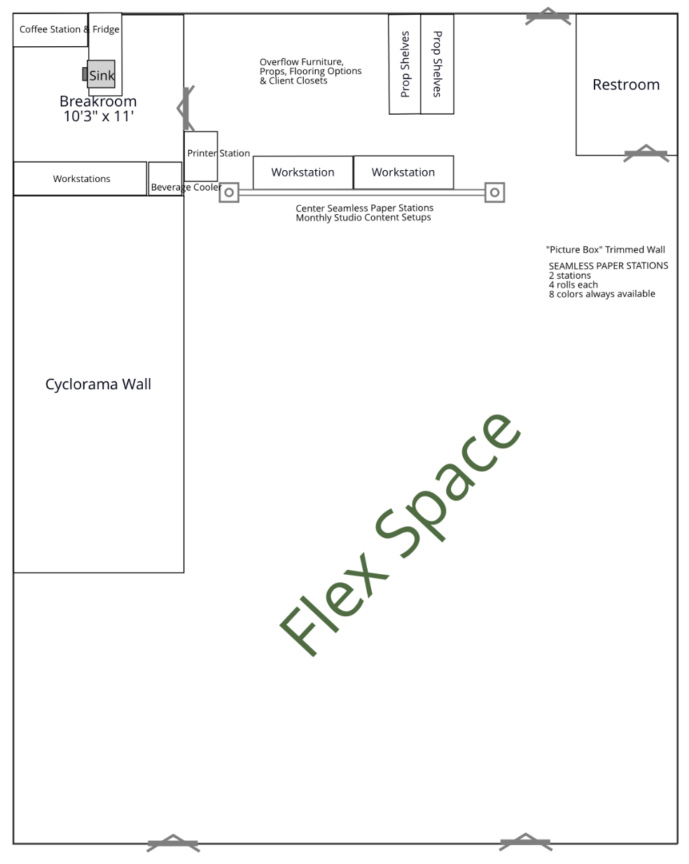 This 1,500-square-foot space features a 22-foot by 10-foot cyclorama wall, a 25-foot 'picture box' trimmed wall, and a movable arch wall.