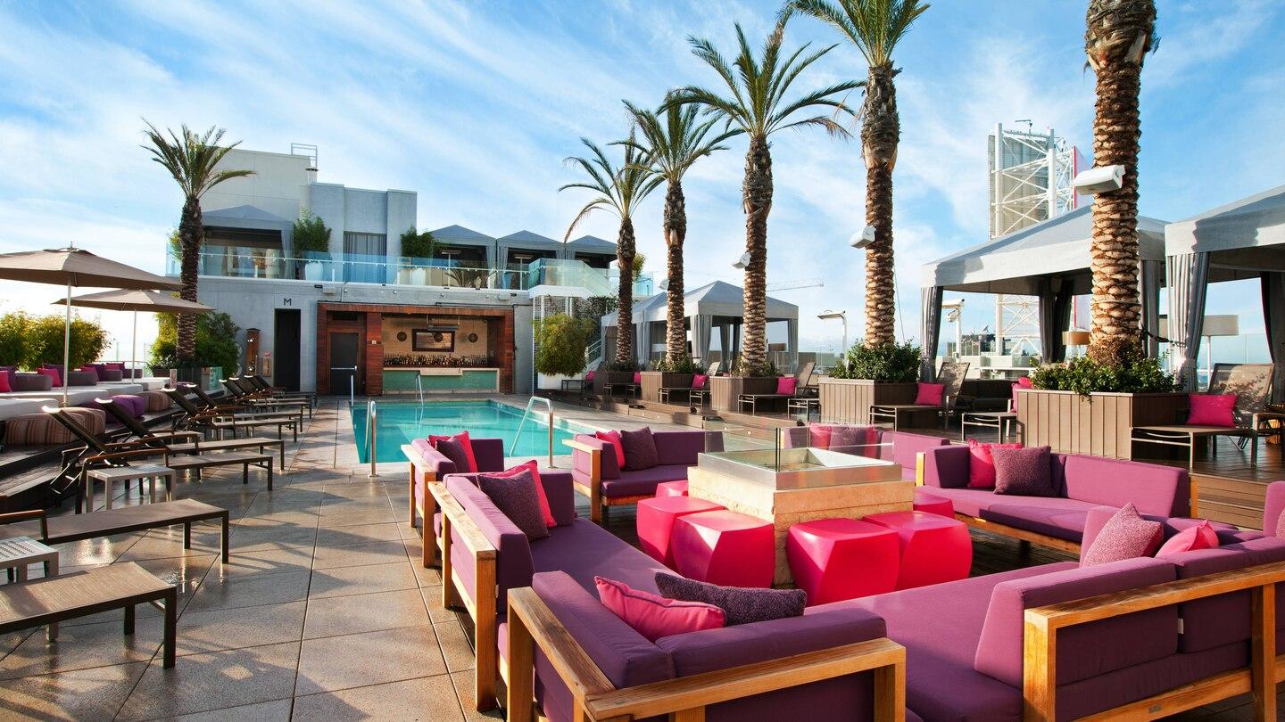 Ceremony Maximum: 130 | Cocktail Reception Maximum: 325. Beautiful pool side venue with 360 views of Hollywood. Fire pit as the central focus for the ceremony. Large projection wall for video montage and pre-installed gobos for your logo to be projected into the pool. Private cabanas and VIP deck