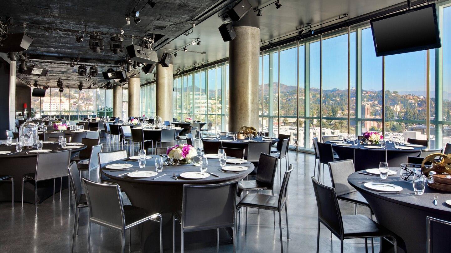 Ceremony Maximum: 400 | Reception Maximum: 250 with a dance floor. Large windows and balcony that overlook the iconic Hollywood Pantages Theatre and Capitol Records. Neutral black and white color palate, which will accommodate any color and theme. Large modern chandeliers and mirrors. Drop down projector and projection wall for video montage. Large foyer for cocktail receptions with expansive windows overlooking the Hollywood Walk of Fame