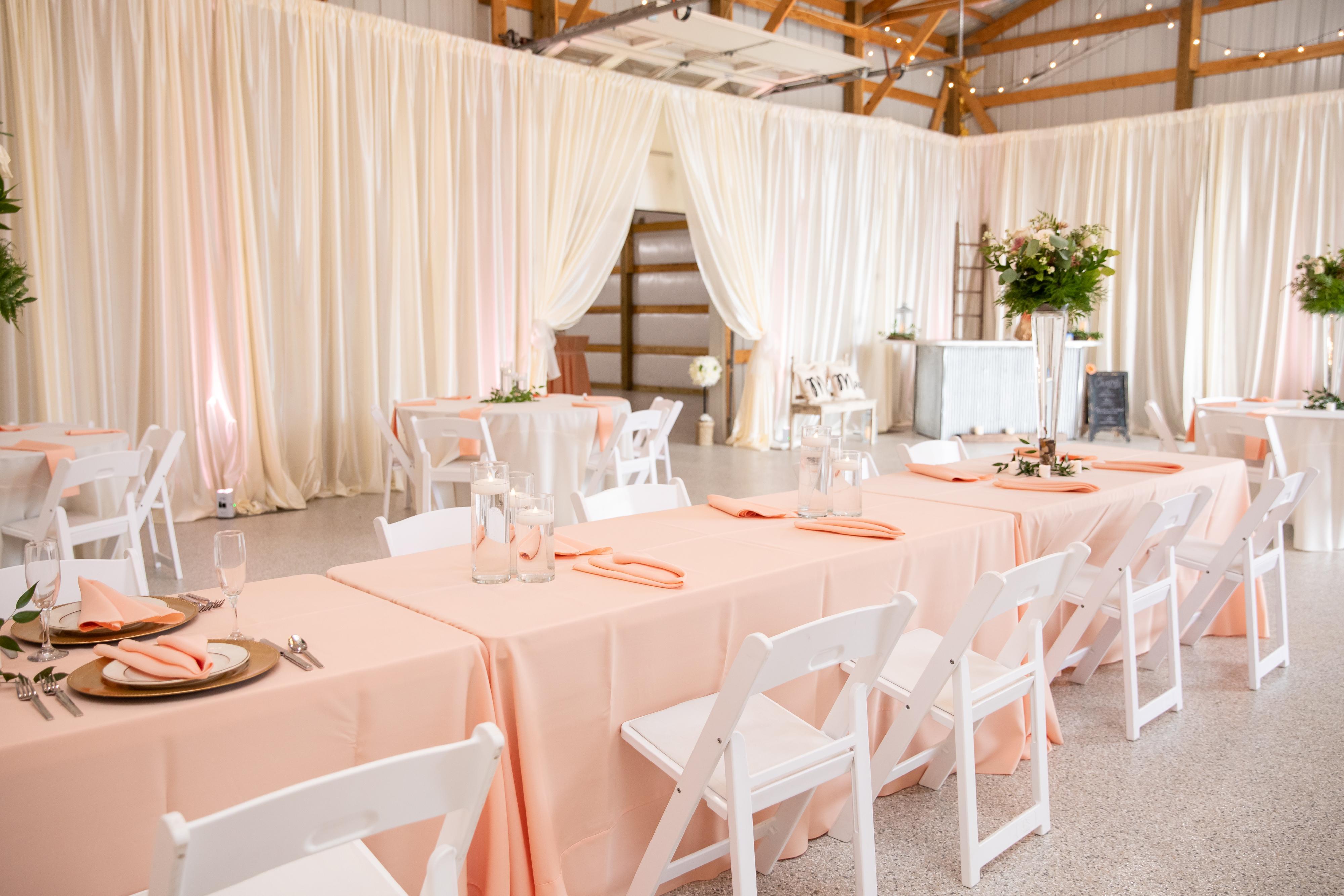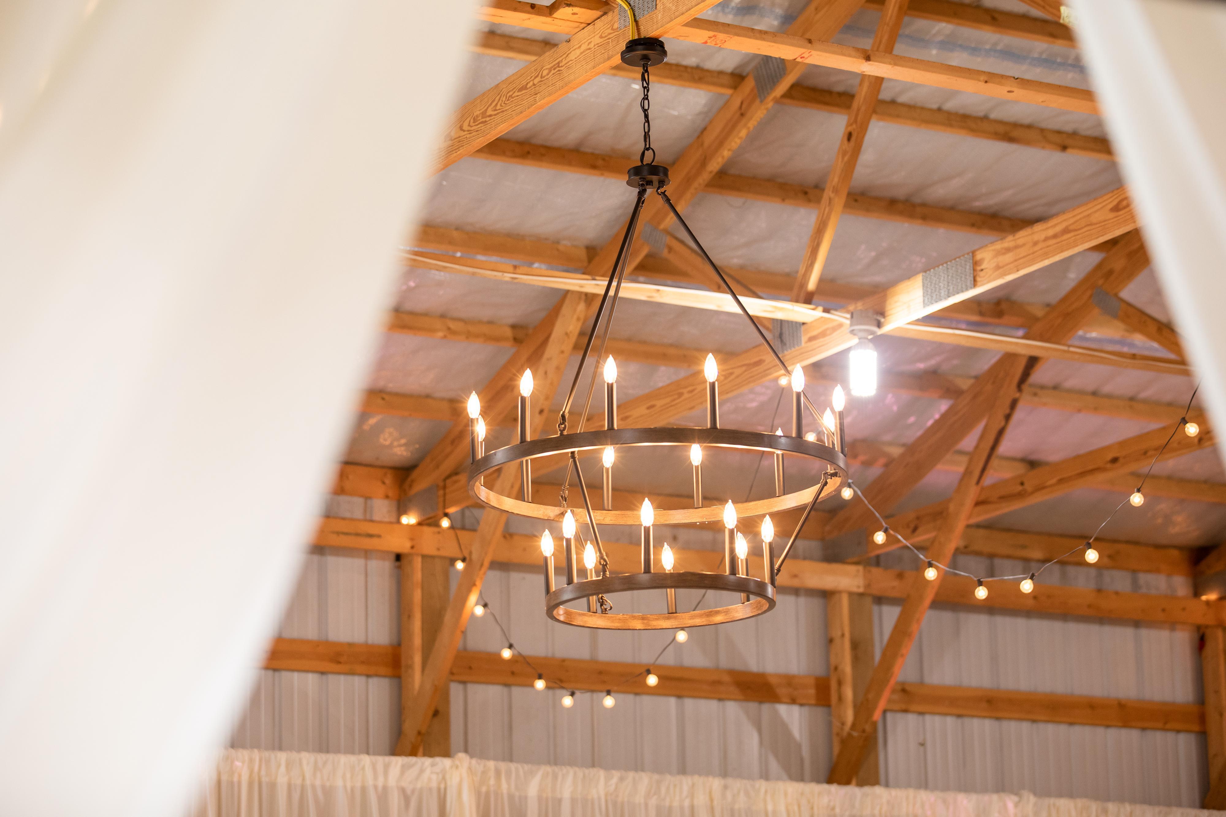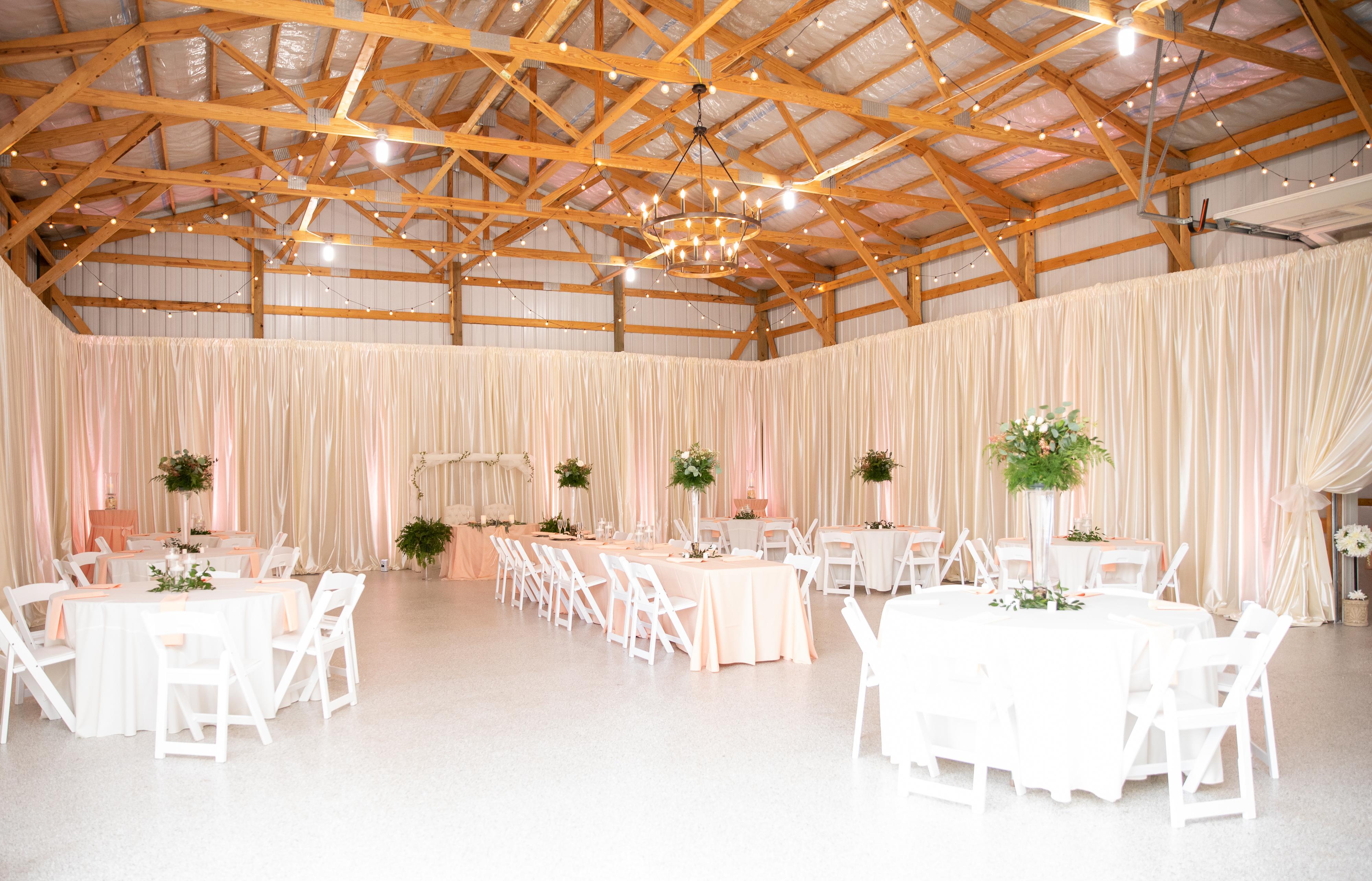 With 5k square feet of indoor space, multiple chandeliers, string lights and drapery our reception barn offers a blank canvas for any type of gathering.