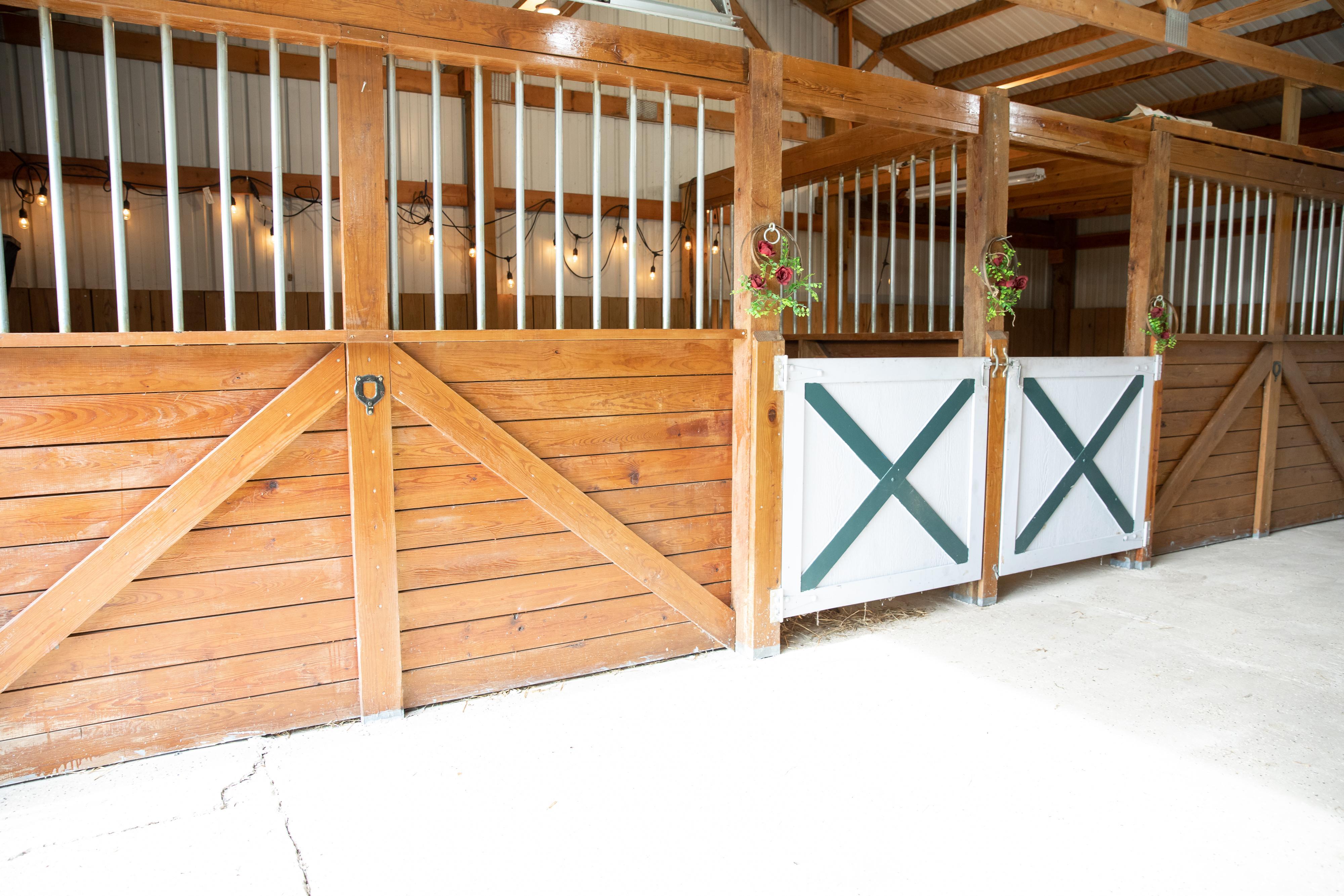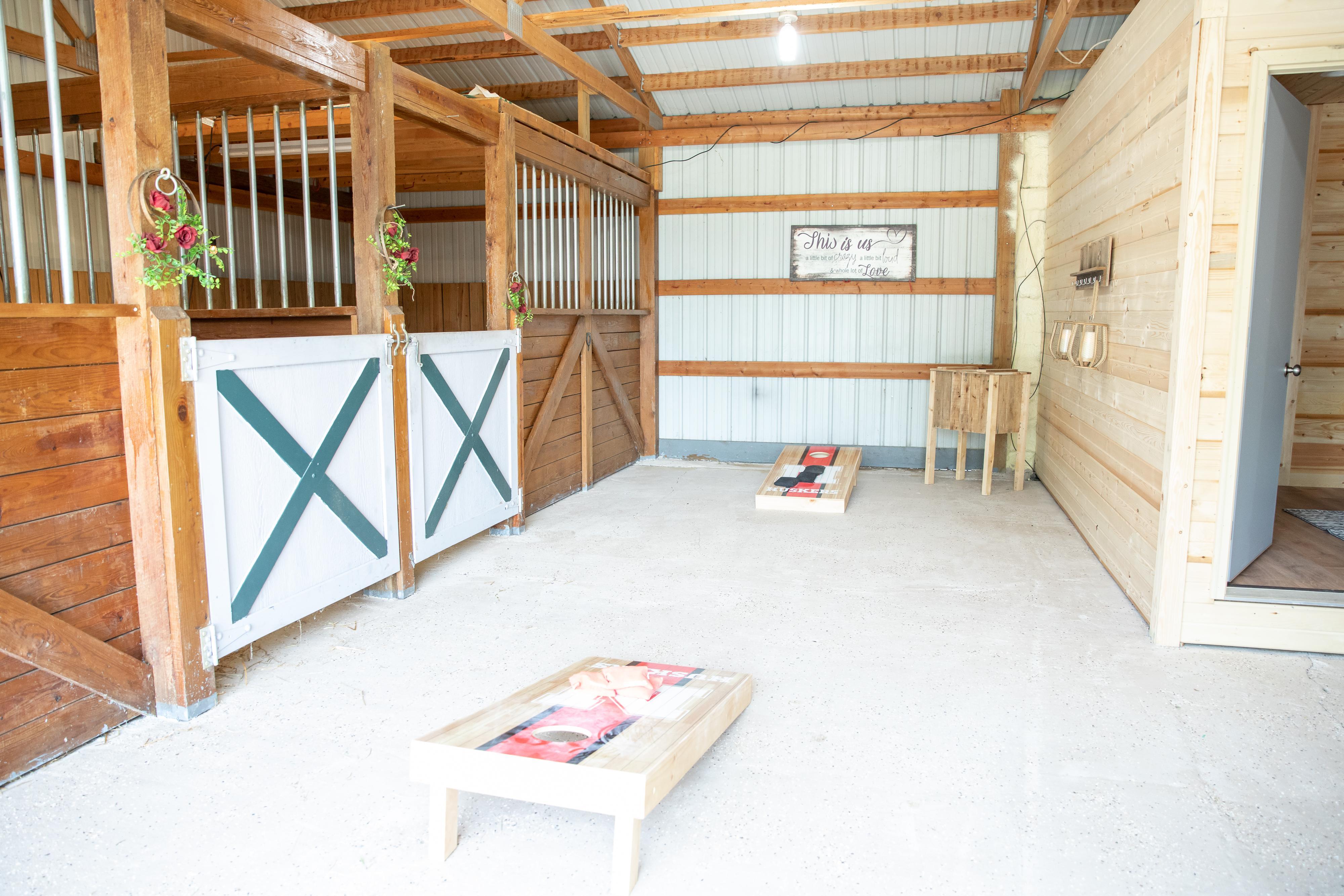 Our horse barn features three horse stalls for horses, a seating area, corn hole and more!