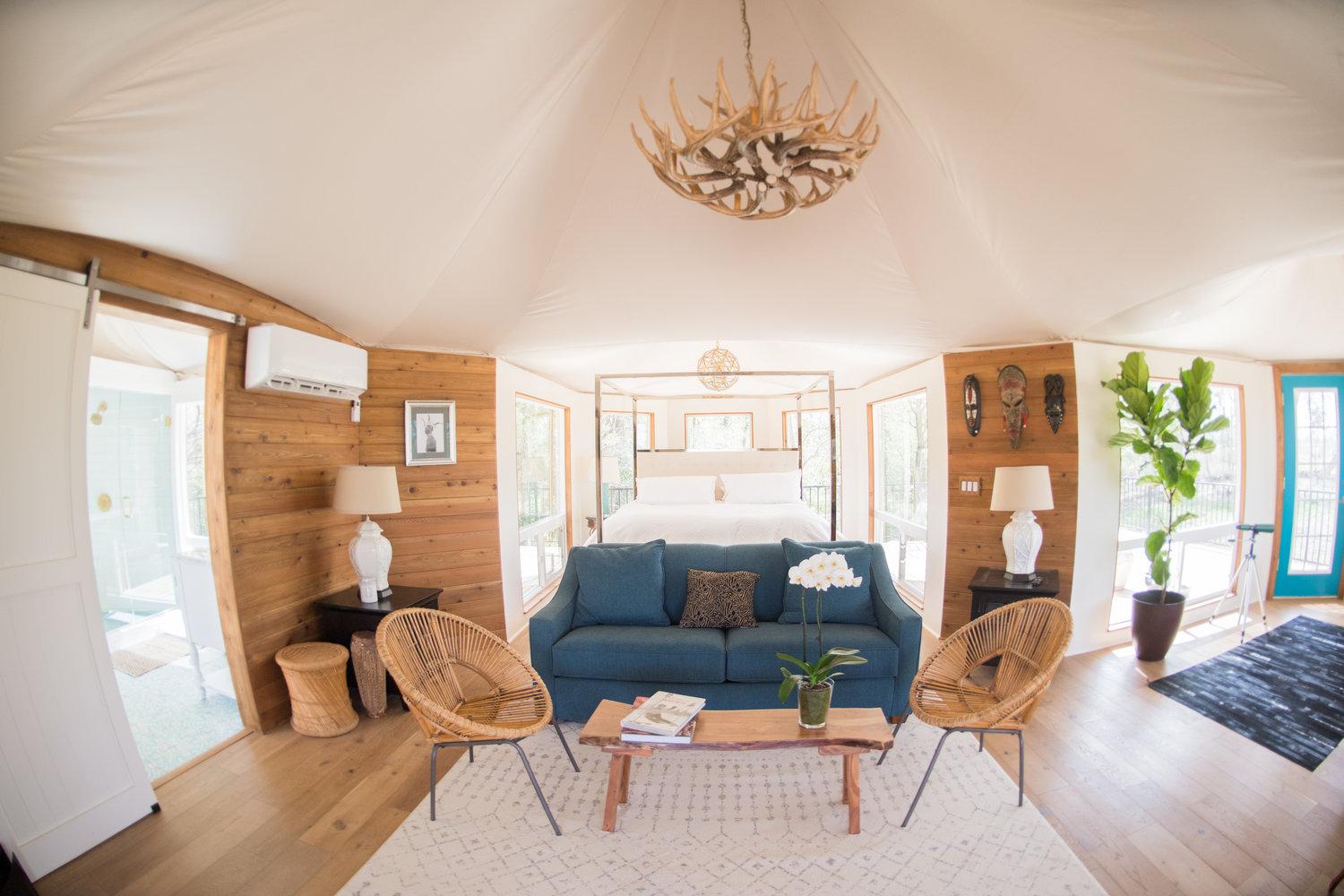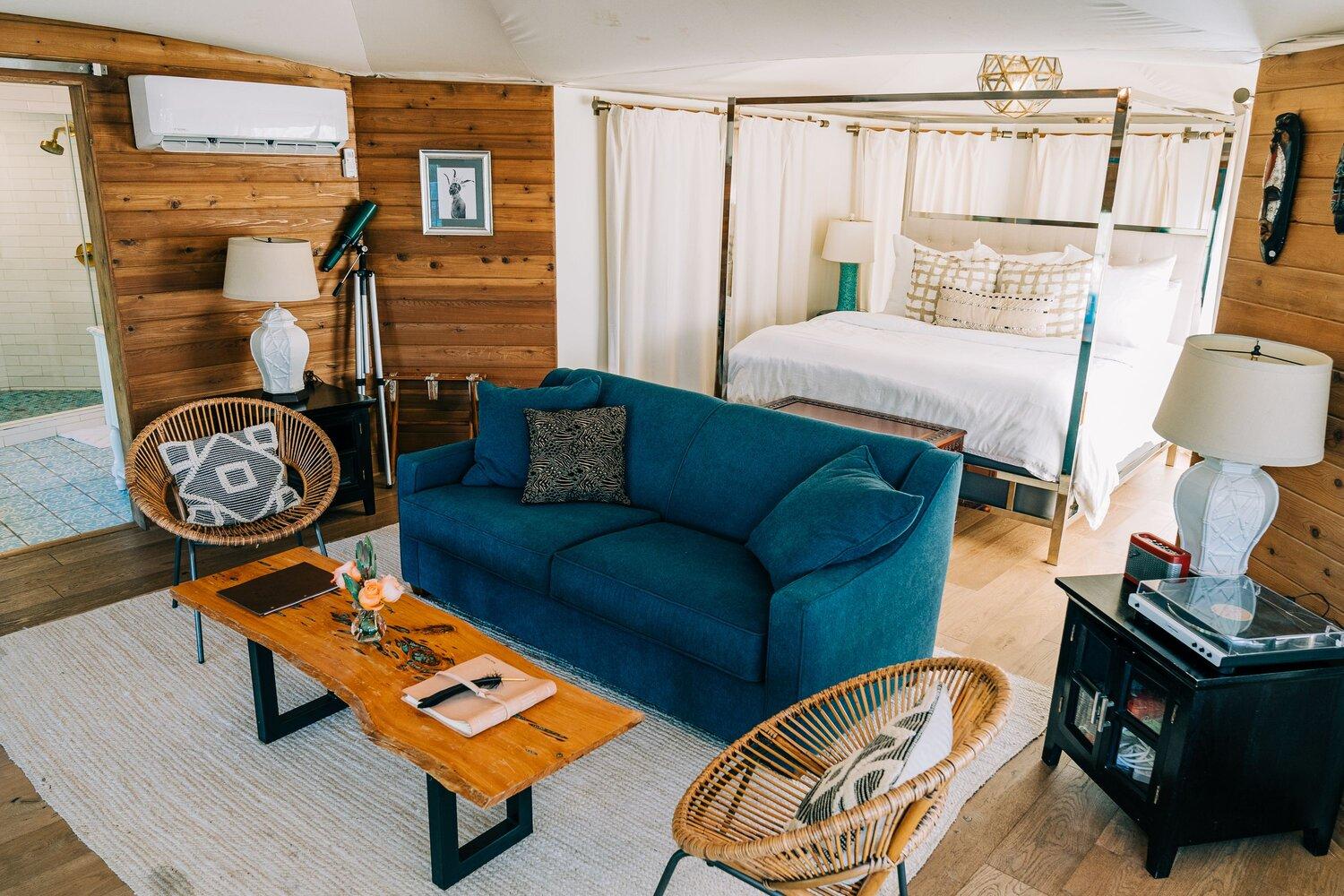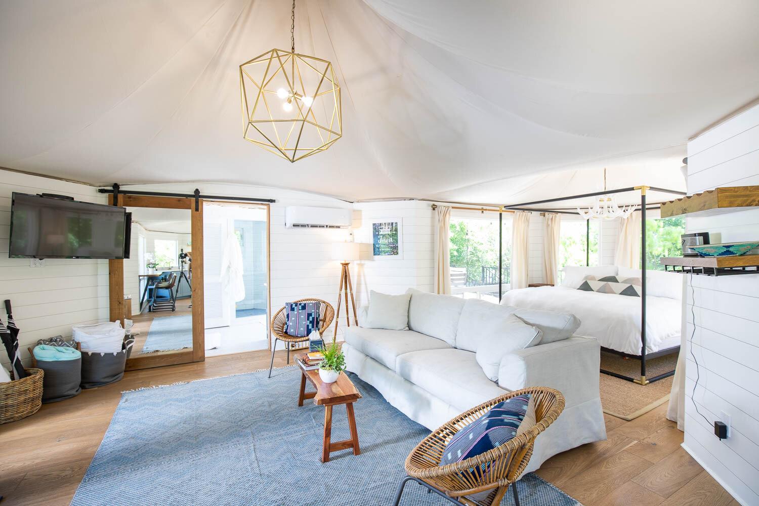 King sized bed, Queen size bed (only in the two bedroom tents), Queen sleeper sofa, Luxury linens, Air conditioning and heating, Hardwood floors, Shower, spa bath tub, and private flush toilet, Aveda Shampoo, Conditioner, Body Wash, and Soap (currently we are out of Aveda products due to COVID shortages), Kitchenette including a dining area, refrigerator/freezer, microwave, and coffee machine, Lodge cast iron, Ground Coffee, Outdoor deck, Outdoor shower, Green Egg and gas grill, Firewood and Charcoal, Lighter, Golf cart (one per tent for use during stay), Two Yeti Hondo chairs.
