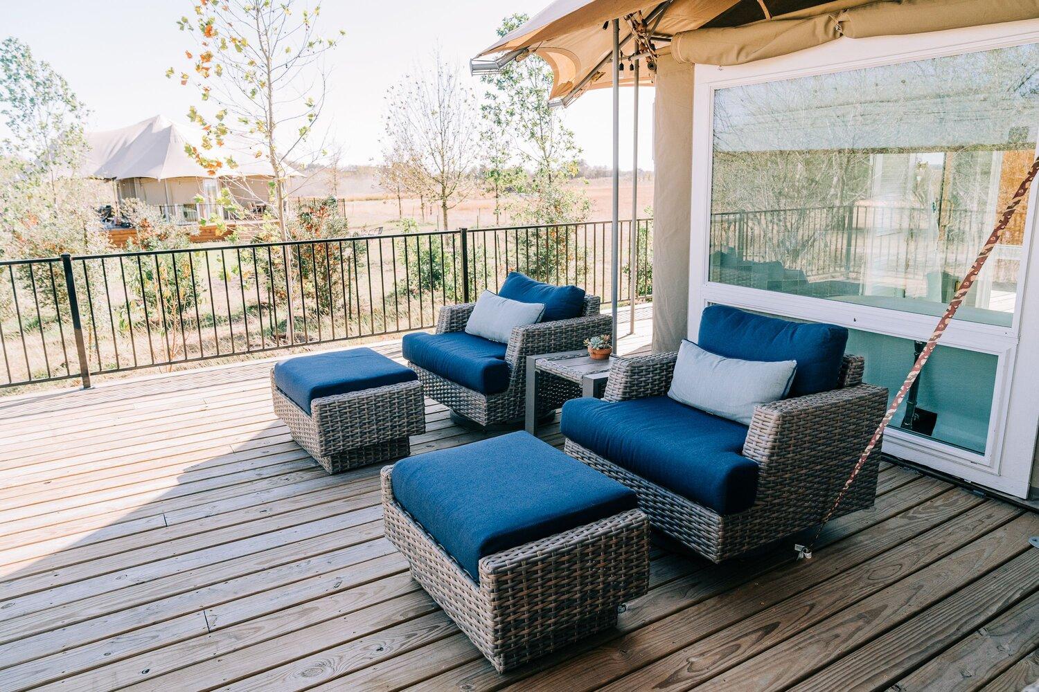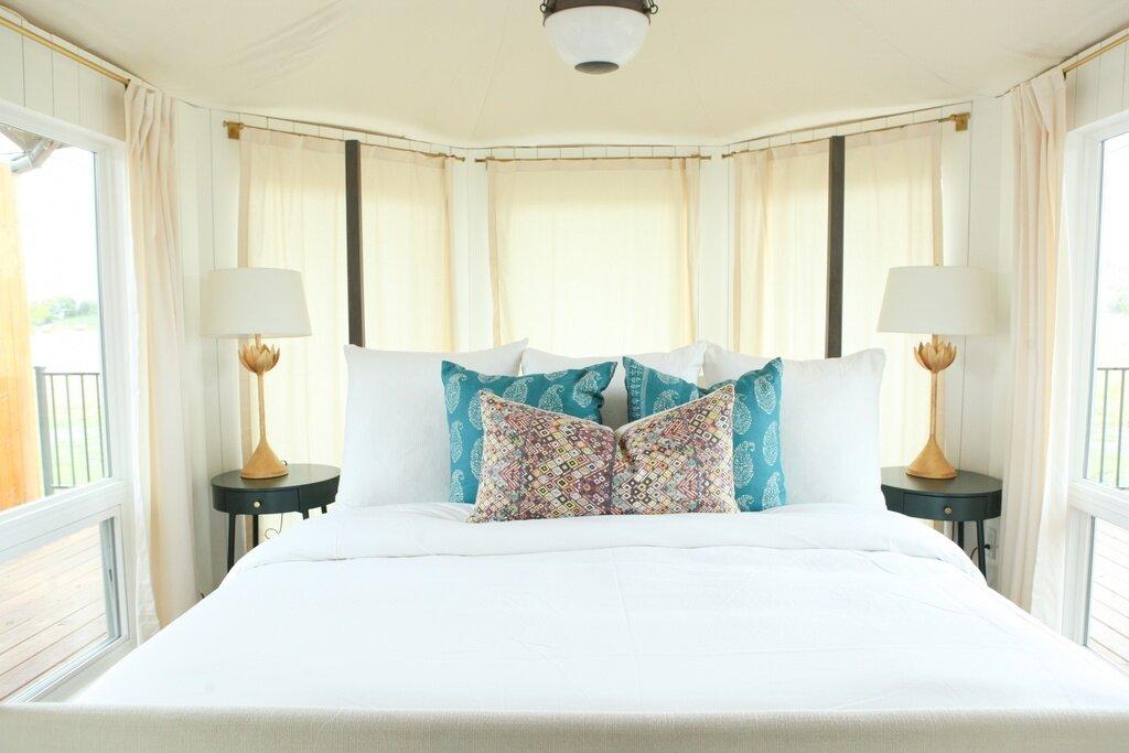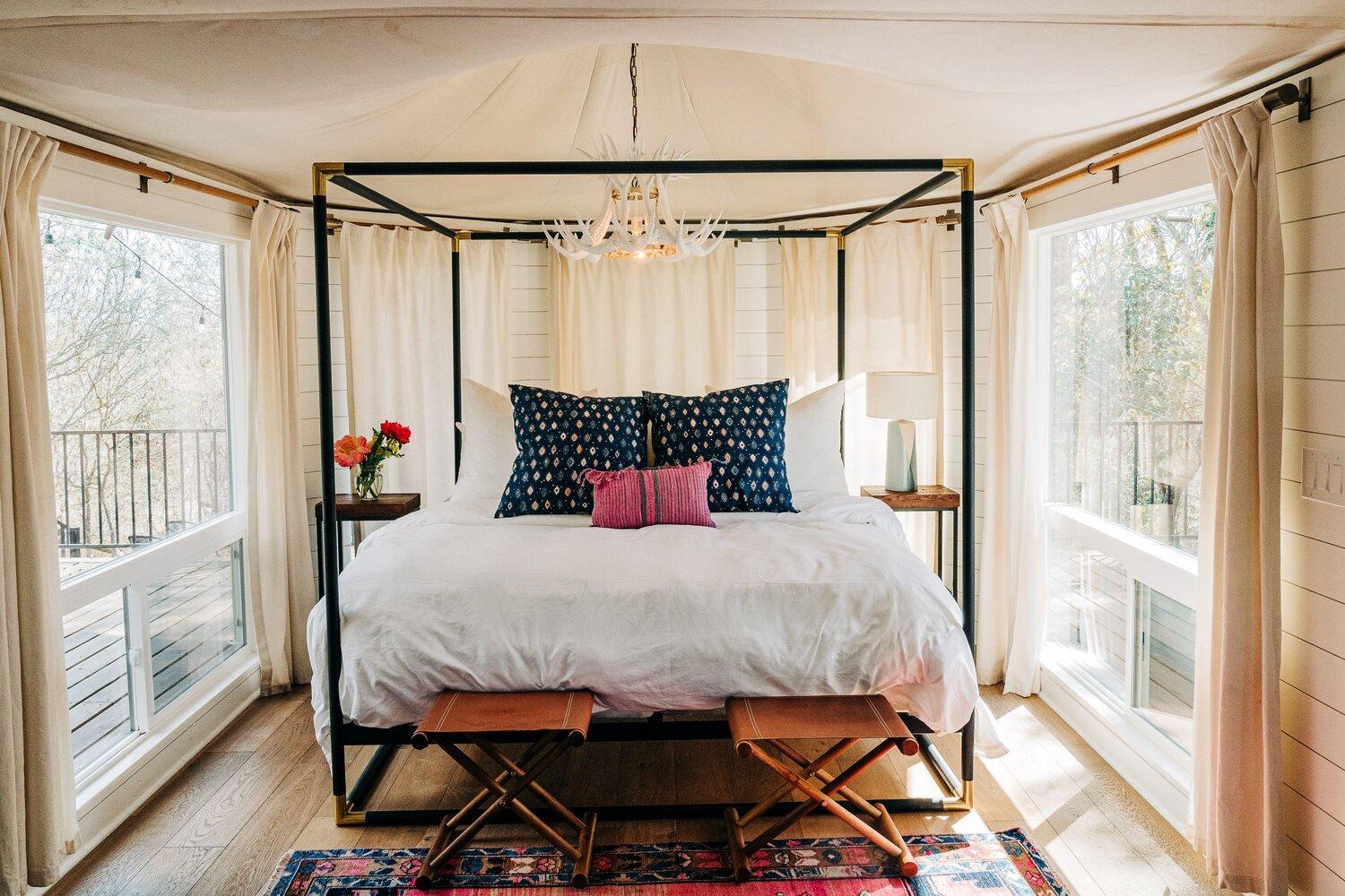 King sized bed, Queen size bed (only in the two bedroom tents), Queen sleeper sofa, Luxury linens, Air conditioning and heating, Hardwood floors, Shower, spa bath tub, and private flush toilet, Aveda Shampoo, Conditioner, Body Wash, and Soap (currently we are out of Aveda products due to COVID shortages), Kitchenette including a dining area, refrigerator/freezer, microwave, and coffee machine, Lodge cast iron, Ground Coffee, Outdoor deck, Outdoor shower, Green Egg and gas grill, Firewood and Charcoal, Lighter, Golf cart (one per tent for use during stay), Two Yeti Hondo chairs.