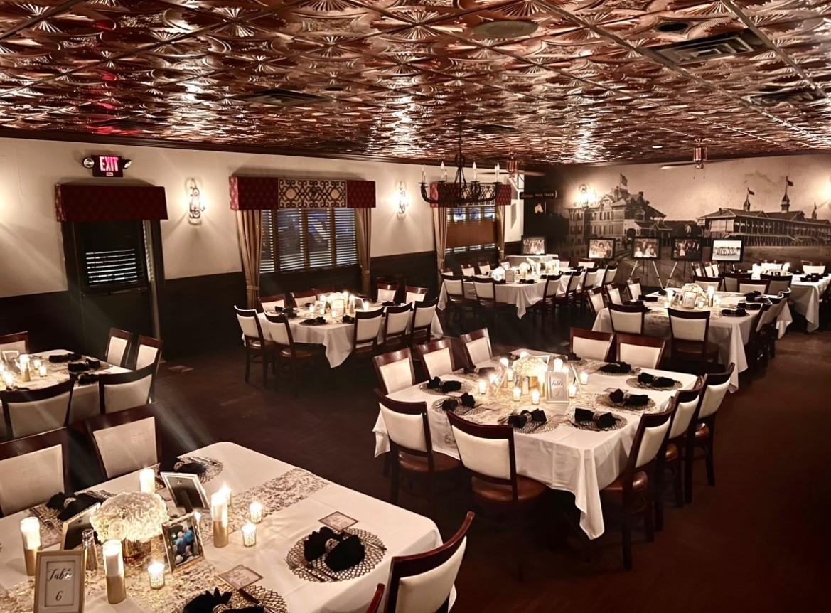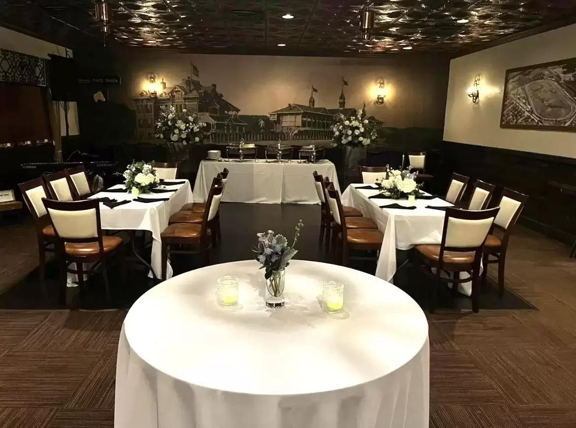 The Derby Room features copper ceiling tiles, a mural of the original Latonia Race Track, Northern Kentucky’s premier racetrack that opened in the 1800s and was open until the Great Depression; luxurious rustic décor; a dance floor; dressing spaces; and a private Jockey Bar with a large screen television and a restored 1940s Bevador cooler that stores the coldest beer in town.