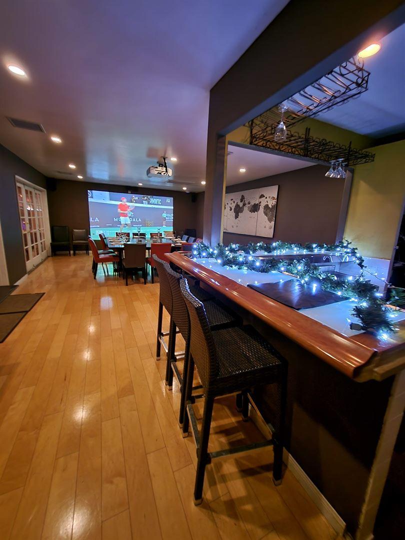 Private room right off the back of our beautiful patio. Guests can enjoy a completely private room with projector, very large screen, and built-in bar for drinks and food. Seats minimum 15 people and maximum 28 people.