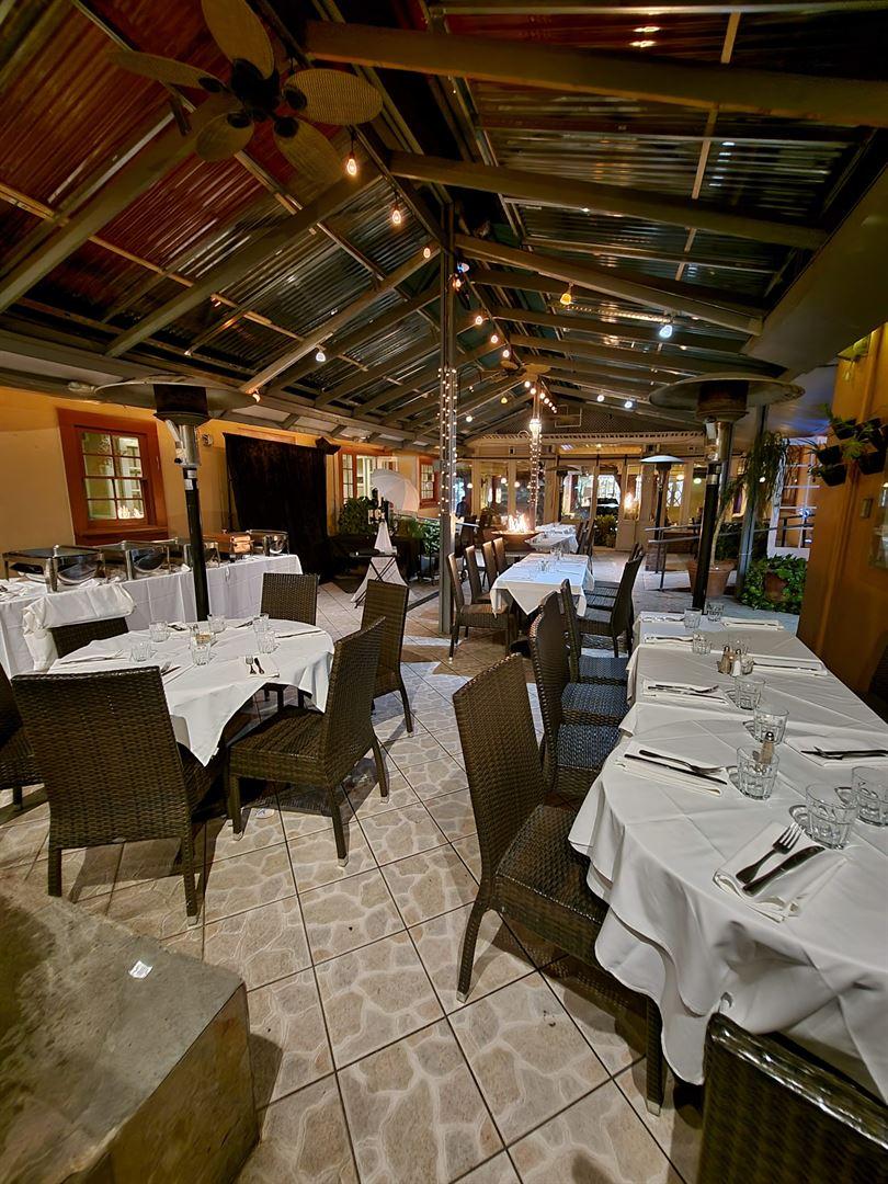 This space is the smaller of the 2 patios, surrounded by greenery, brick, a fountain and beautiful windows. We have space heaters for warmth just in case. Seats minimum 15 people and maximum 70 people.
