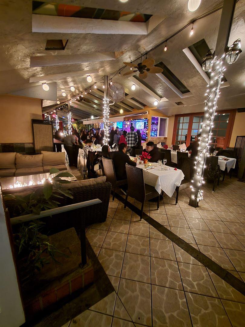 Amenities: Dance Floor, Full Bar/Lounge, Wireless Internet/Wi-Fi Atmosphere/Decor: Lounge vibes in patio space with windows that open/close on the ceiling, french doors surrounding the walls, and lots of greenery, and natural textures. Special Features: Several fire fire pits, a fountain, couches, lounge seating, a stage, mood lighting, french doors, and full bar.