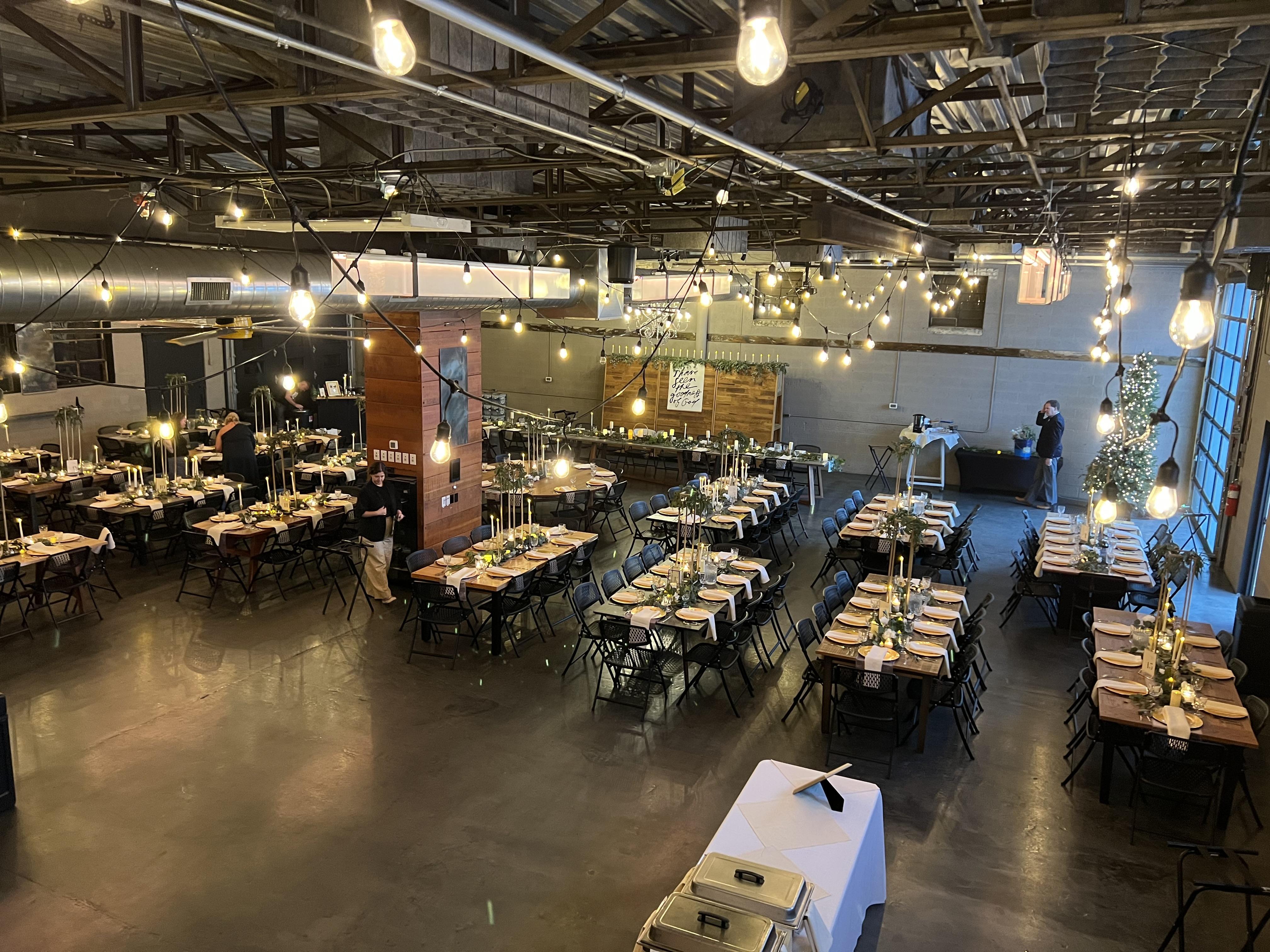 Our 4,000 square-foot indoor and 2,200 square-foot outdoor spaces provide flexibility to fit your vision and celebrate. Featuring hand-crafted tables, each is unique and locally made. With high ceilings and market lights throughout, opening the 14' glass garage door allows guests to enjoy both settings seamlessly.