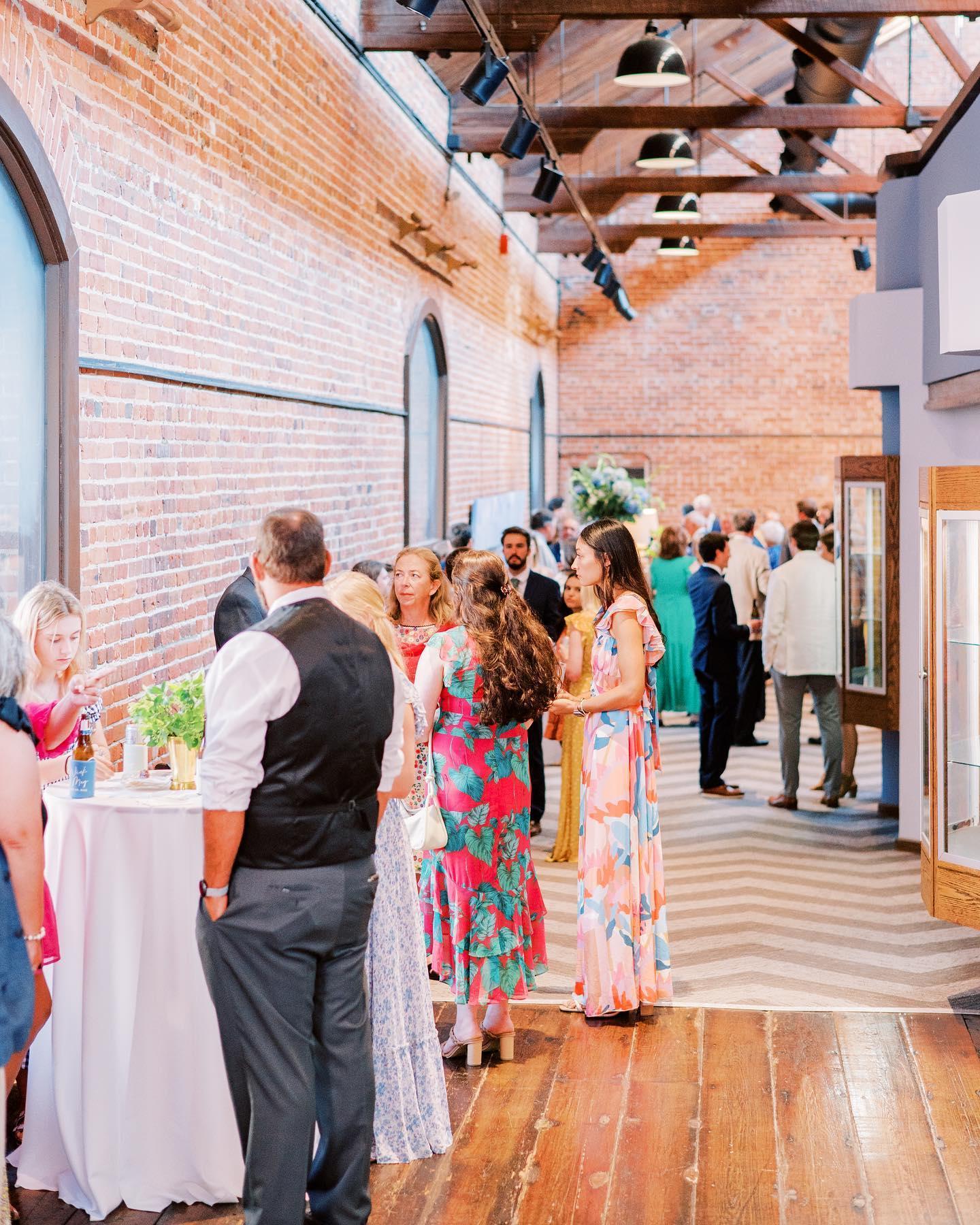 Located in the heart of downtown Washington, NC, the Washington Civic Center is a sophisticated waterfront wedding venue. This spacious facility features 14,000 square feet of event space that can be used for all your wedding weekend activities. Formerly a train depot, the vaulted ceilings and exposed beams combine to make the space feel rustic and elegant. Hardwood floors offer a refined platform for the newlyweds to have a memorable first dance. The dark tones of wood and exposed brick help to create a warm and cozy experience. The Washington Civic Center has plenty of room for over 200 guests. The venue offers a two-day package for weddings which opens up endless opportunities for a personalized celebration. Make sure to ask about our Something Borrowed room that contains greenery, table décor, signage, and plenty of other decorations that our clients can use at no extra charge.