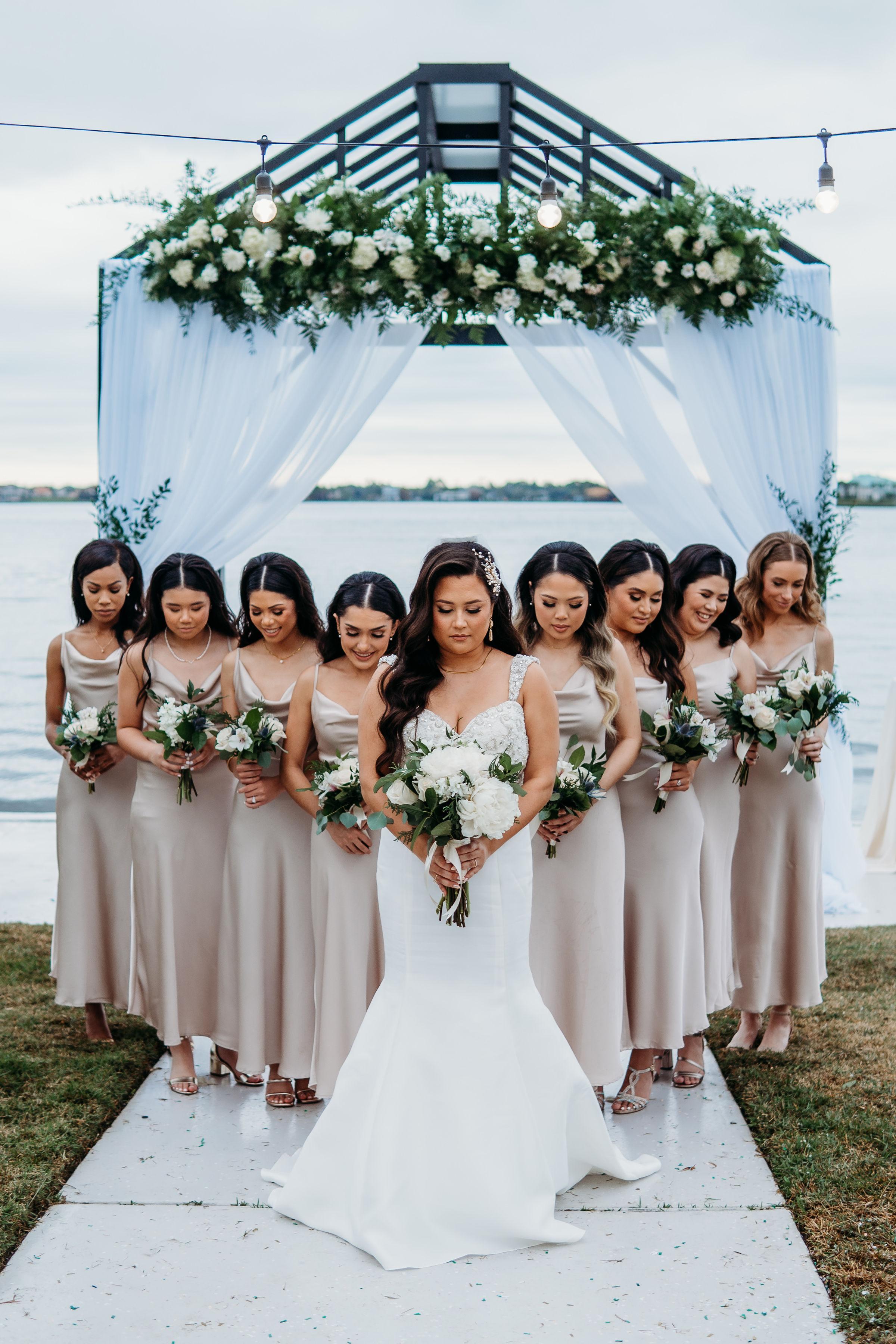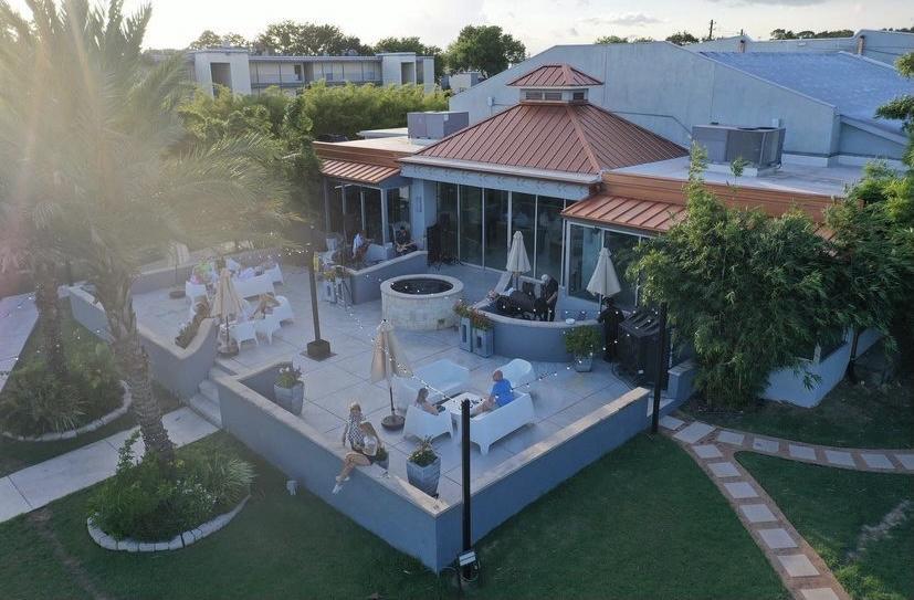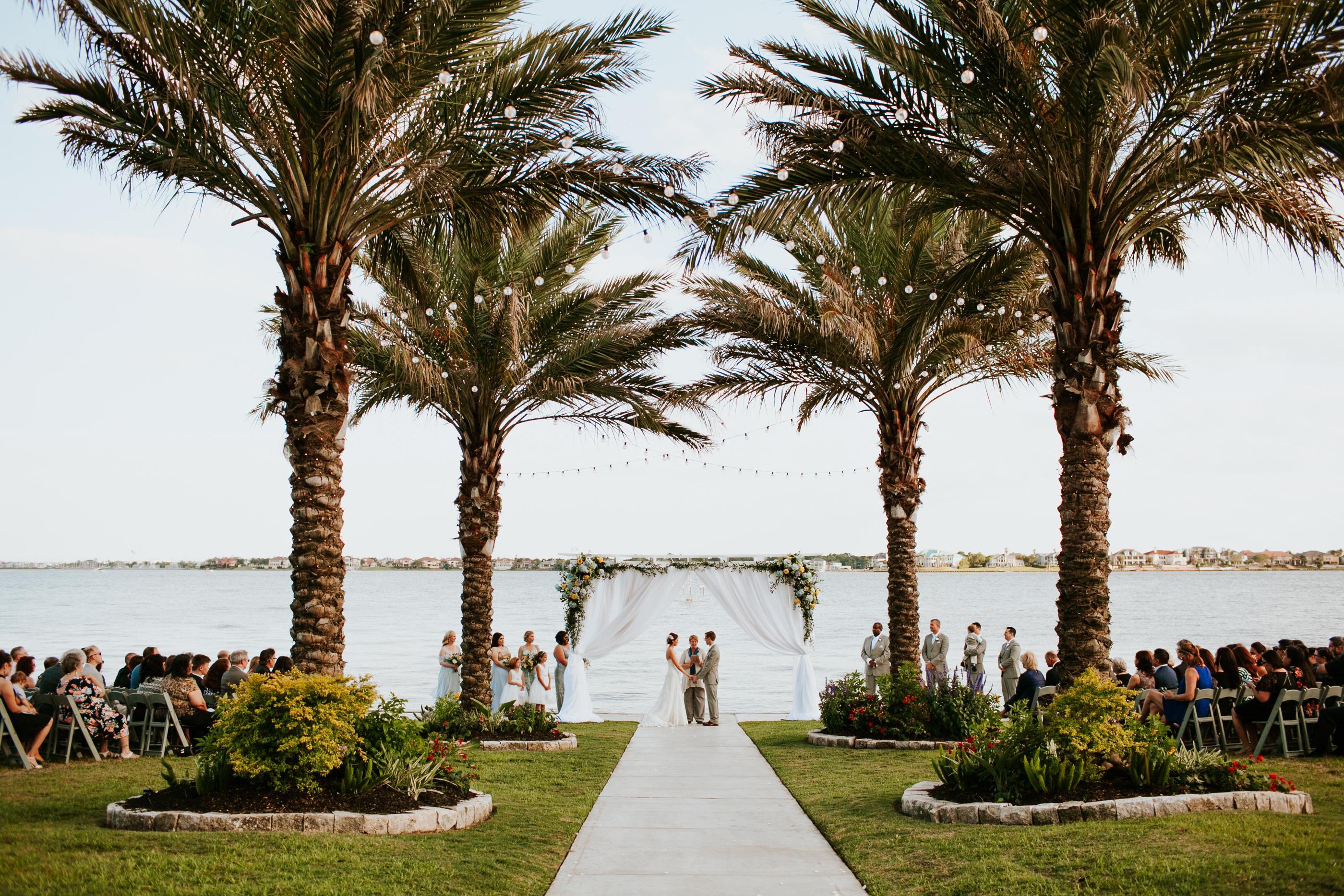 7,000 sq ft of elegance with views of the water wherever you are. With massive doors leading outside, a grand chandelier, & a view of Clear Lake, The Ballroom gives all the drama. Adjacent, our Chandelier Room feels just as open with floor-to-ceiling windows & a panoramic waterfront view. Walk out to an outdoor space with canopy lights over sleek marble flooring. The Patio transforms well from cocktail hour to private wedding ceremony with a custom-built arbor & an unforgettable palm tree aisle.