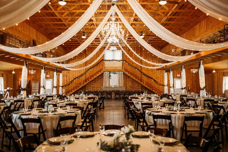Weatherington Woods is an enchanting and picturesque wedding venue in Zanesville, Ohio. This versatile space provides the perfect setting for weddings of all styles, whether it's an intimate, rustic gathering of your nearest and dearest or an elegant black-tie affair. The venue's warm, all-wood interior, high ceilings, exposed beams, and dramatic double staircase create a welcoming ambiance for a truly bespoke celebration.