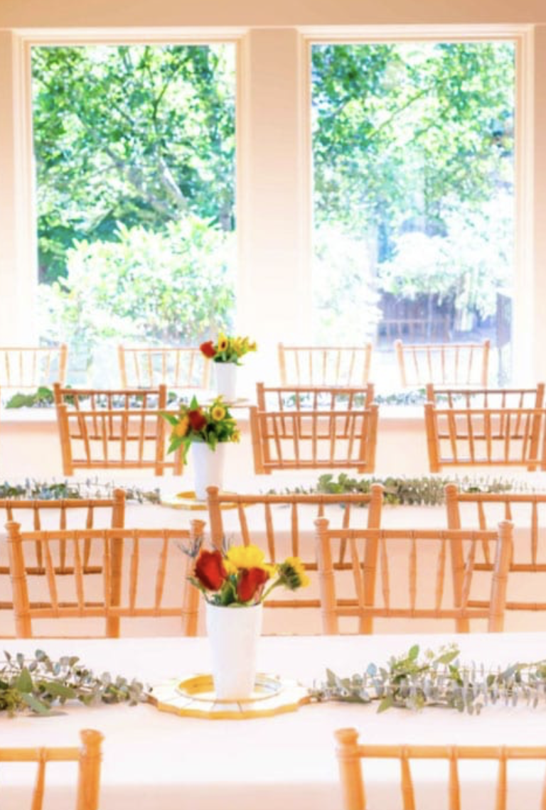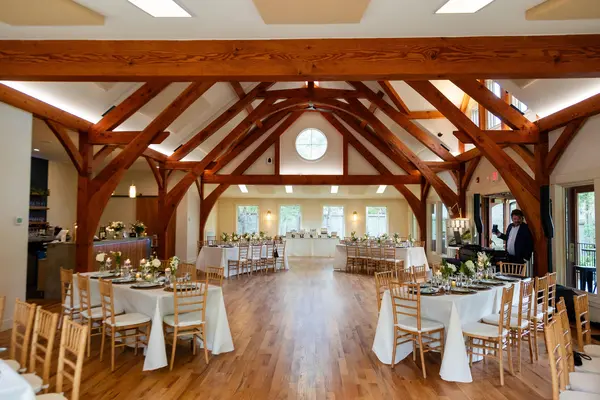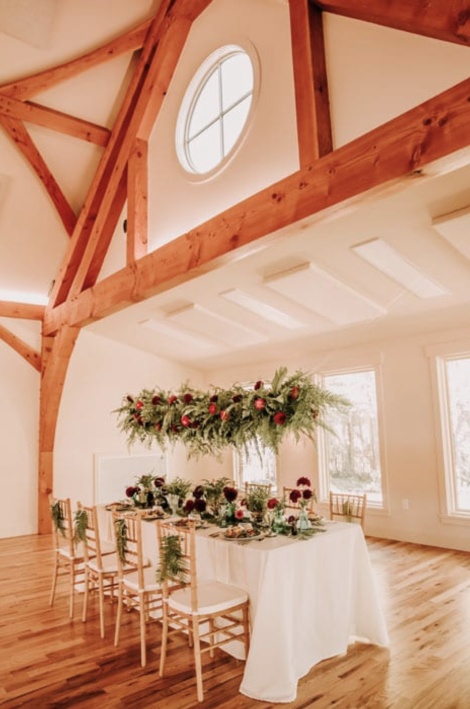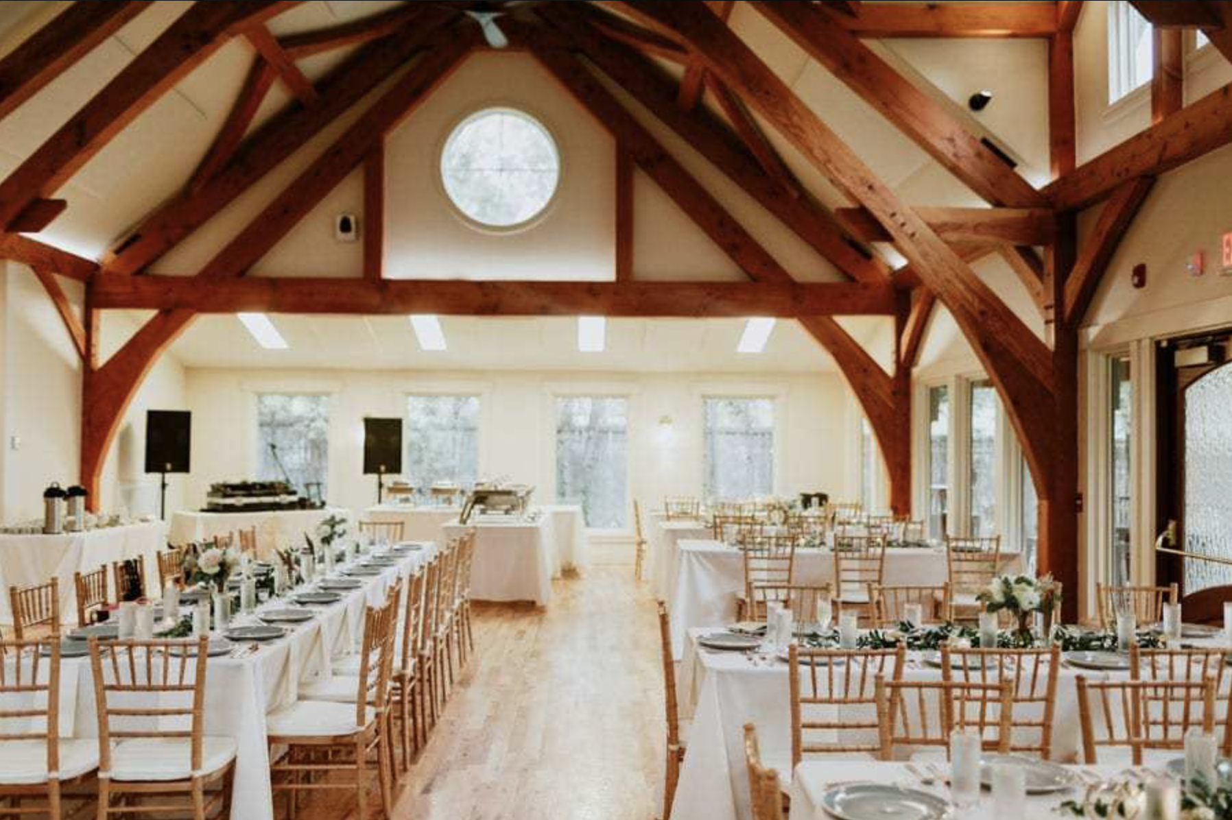 Our main hall features: - Stunning timber framing surrounded by large garden windows bringing nature indoors. - Adjustable lighting available to balance your mood and atmosphere as your event proceeds. - Tables, chairs, high tops. - Fully equipped bar, glassware, craft beverage services available. -Fully equipped catering kitchen, farm to table sustainably source menu.