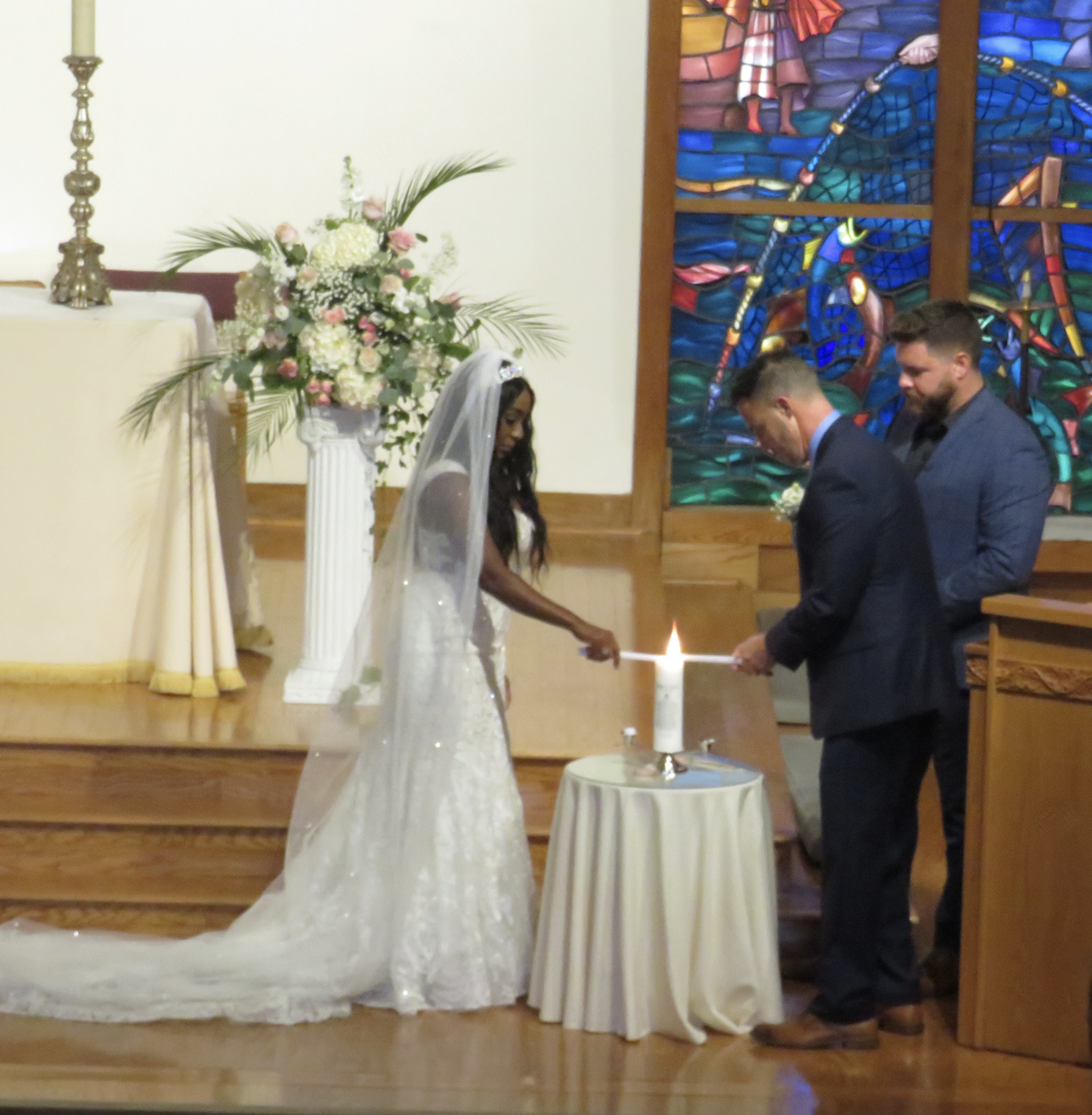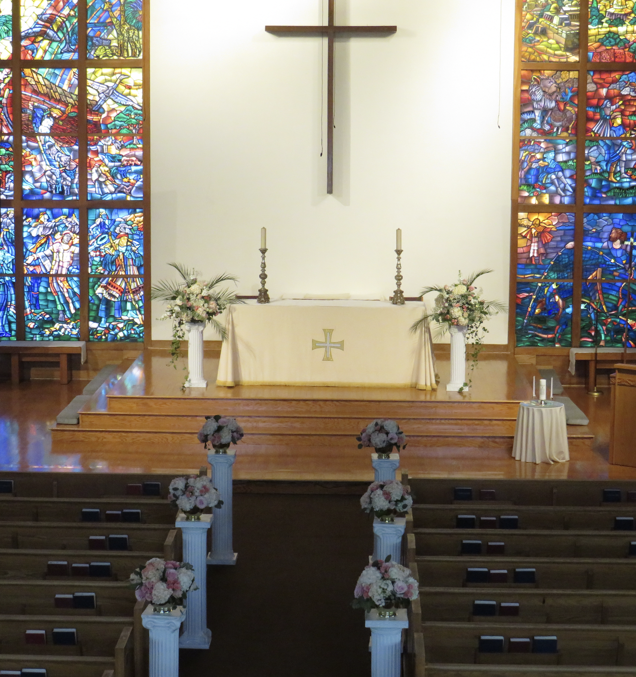 Warm, welcoming church setting. Roman columns for floral arrangements. Chapel consultant to assist with all aspects of wedding planning.