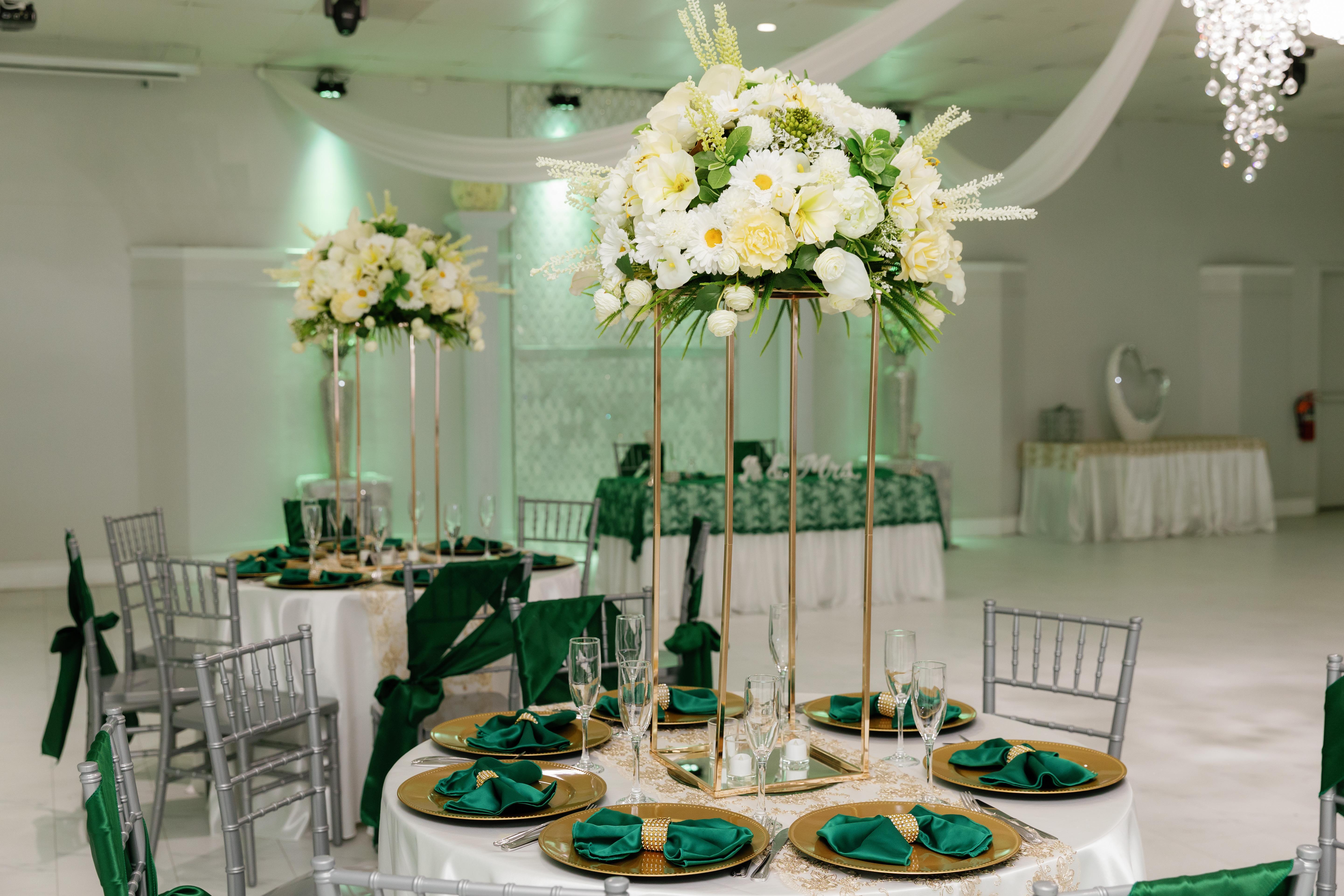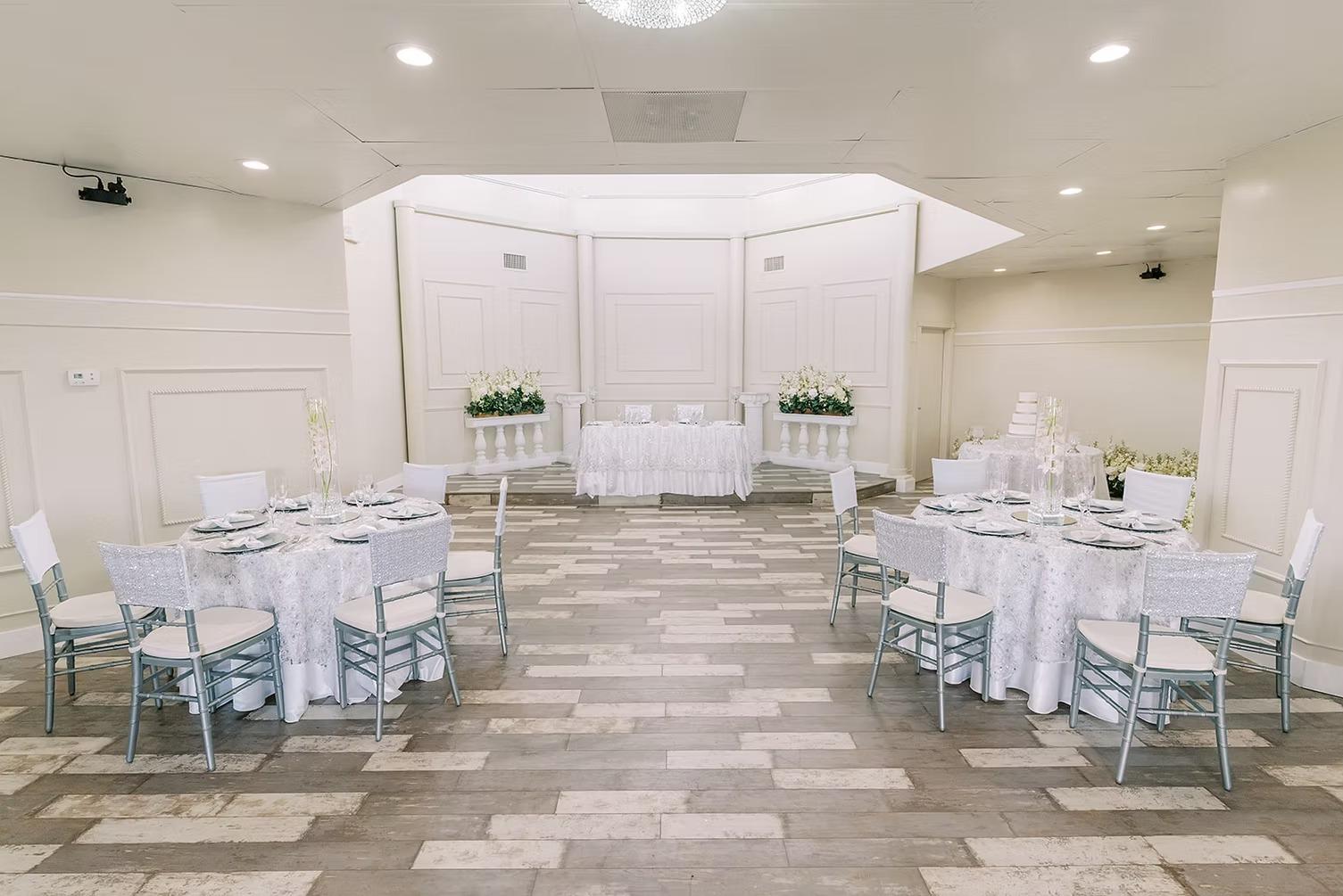 Happily Ever After Wedding Package up to 50 people Four Bouquets & Boutonnieres Ceremony 100 Photos Bride’s Room and Separate Groom’s Room Day of Event Coordinator Room up-lighting Silver Chiavari Chairs Table Setting: Linen, with choice of napkin accent color Centerpieces Sweetheart Table DJ/MC Three-Tiered Wedding Cake Licensed Bartender & Serving Staff Full Open Bar: ages 21yrs and over Iced Tea & Coffee $6800 +10% Gratuity +NV 8.375% sales tax