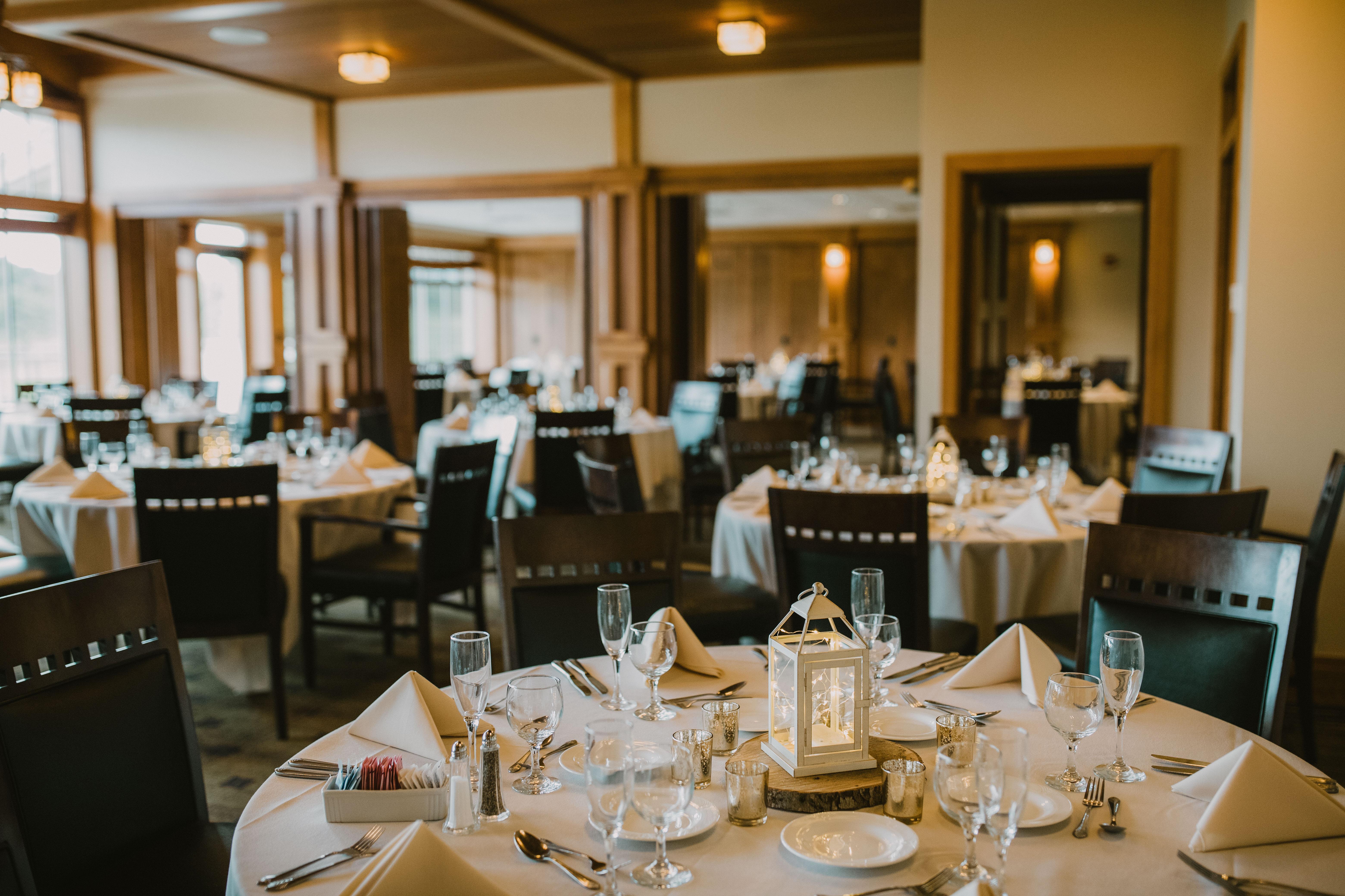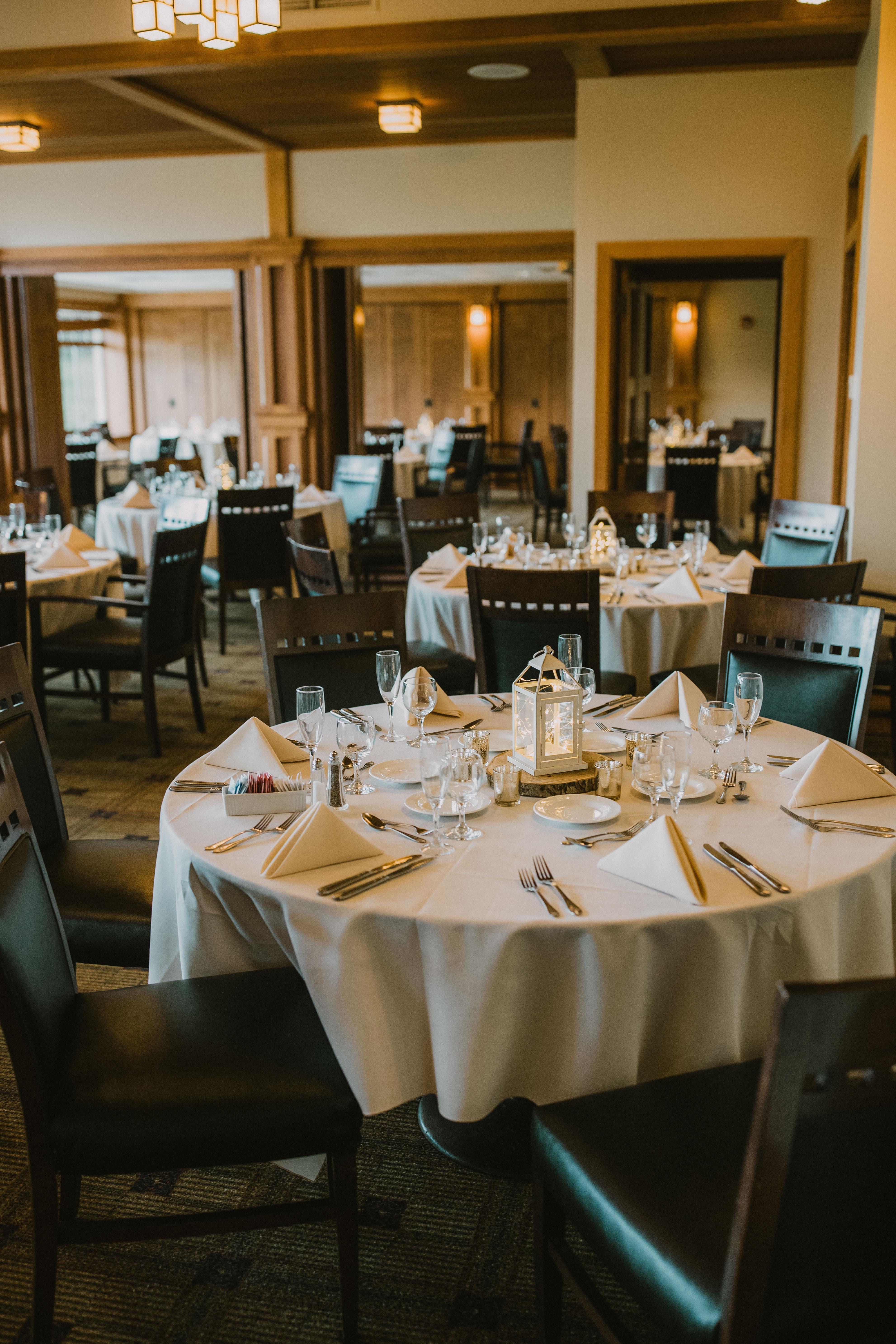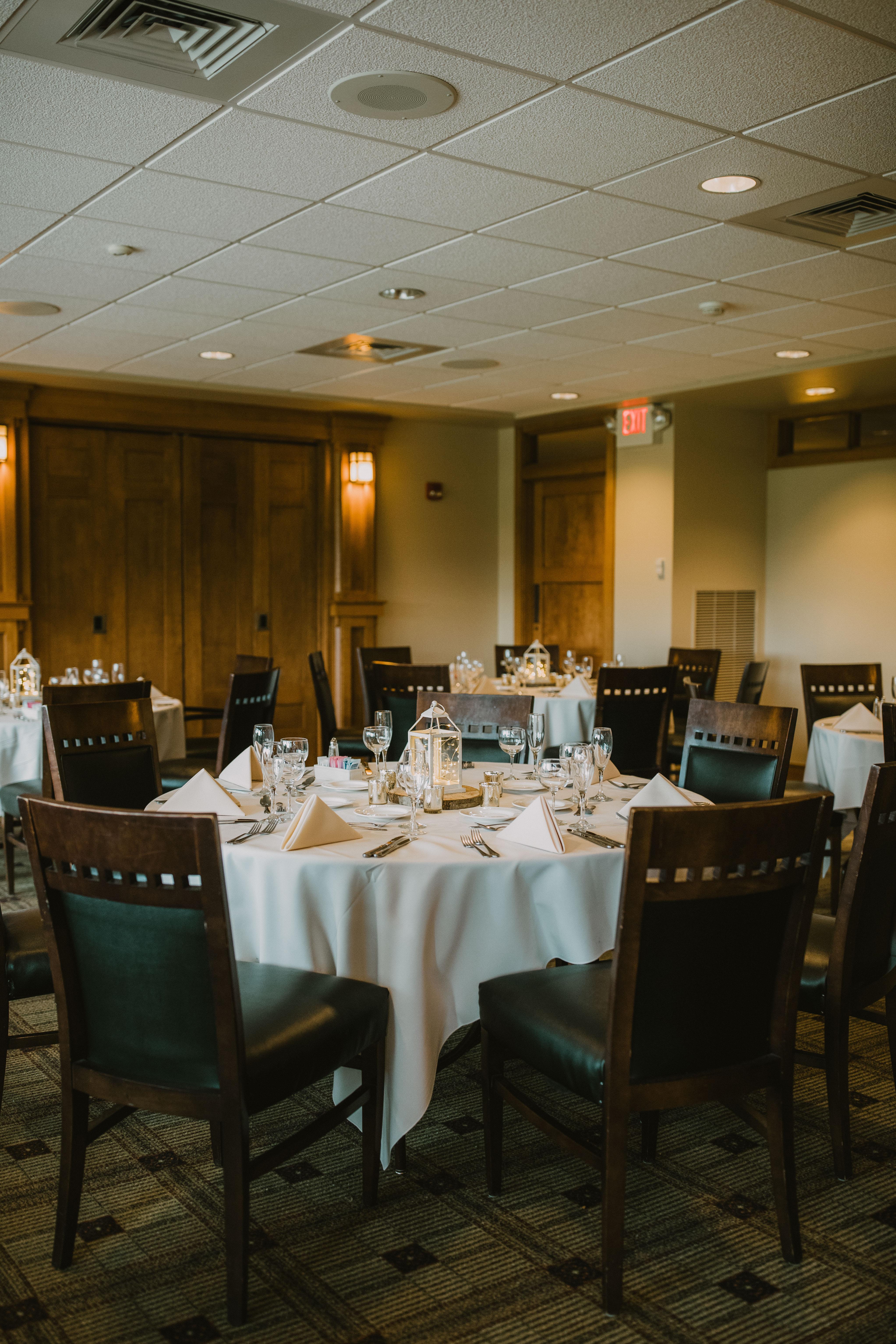 The Main Dining Room is our largest dining room, and it is suitable for casual and formal dining, and seats up to 90. The Main Dining Room is used most often in combination with the Lakeview and Langford Room for wedding receptions for a seating capacity of 250. This room is also perfect for large parties, conferences, and meetings. One side of this room features a wall of windows that overlooks the golf course.