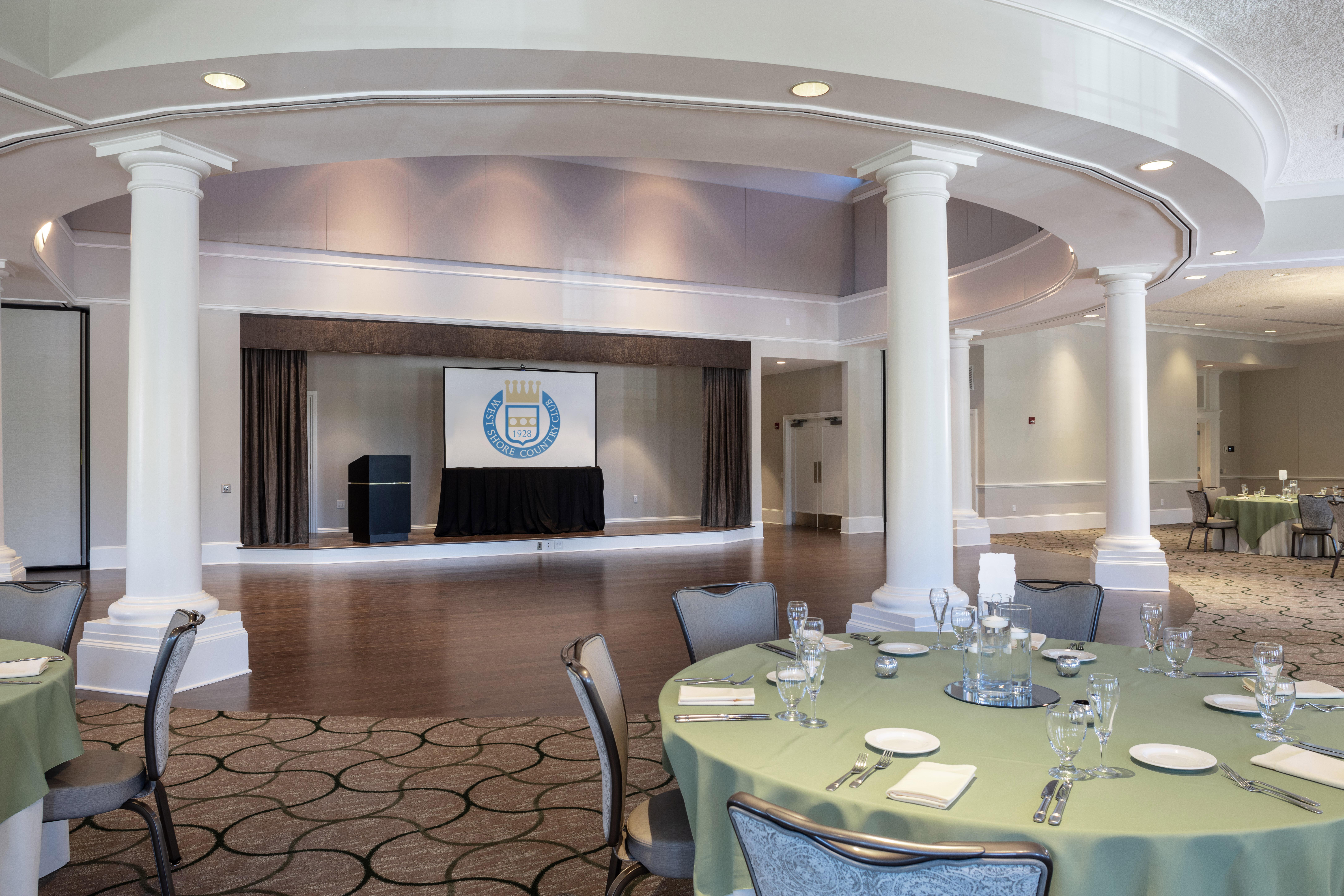 Our distinctive and newly renovated Ballroom provides a classic setting for the most elegant of wedding receptions. Our large stage overlooks a similar semi-circle, hardwood dance floor that draws a spotlight to some of the most traditional moments of your wedding day and the crowd once the dance party begins.