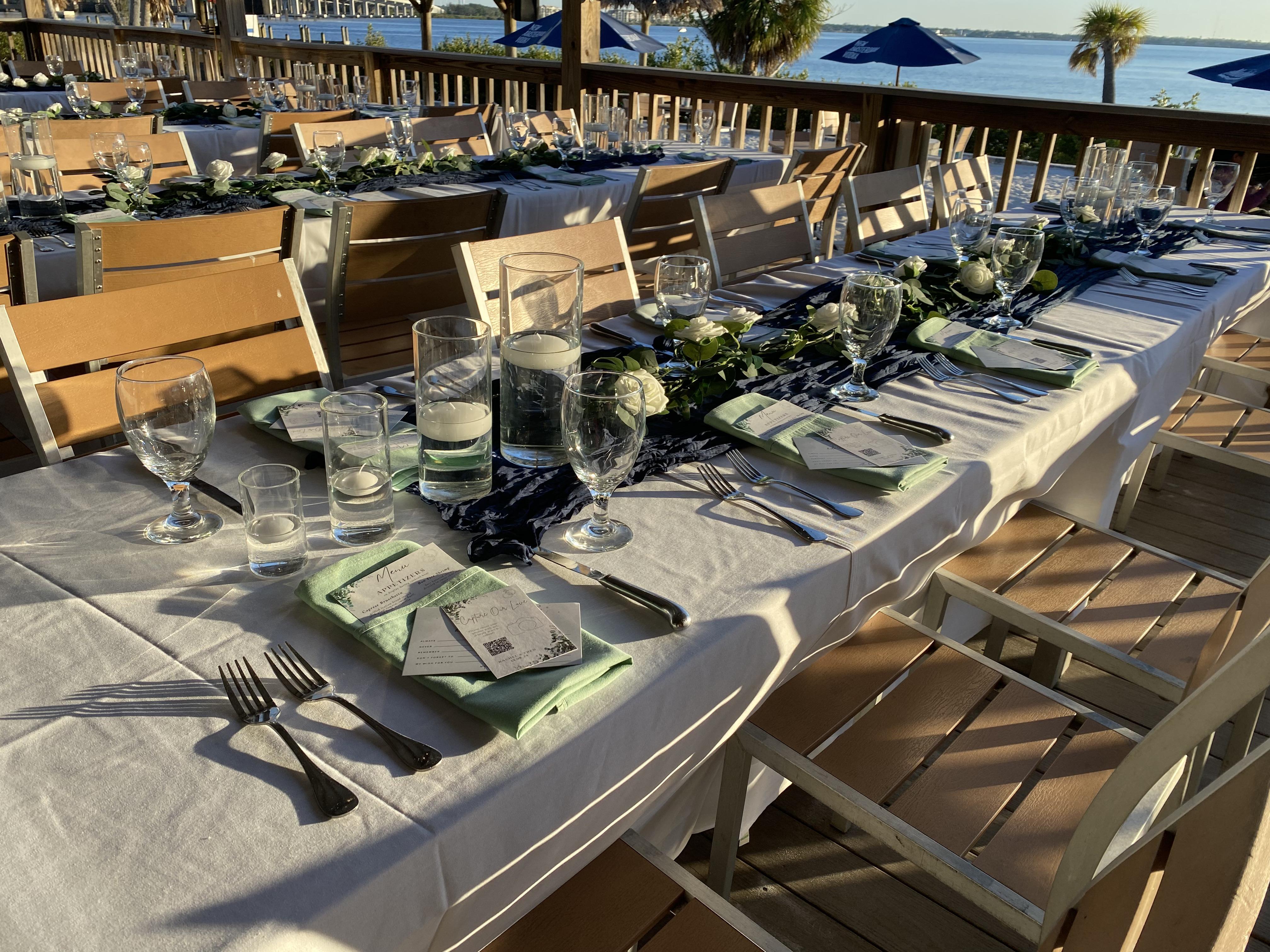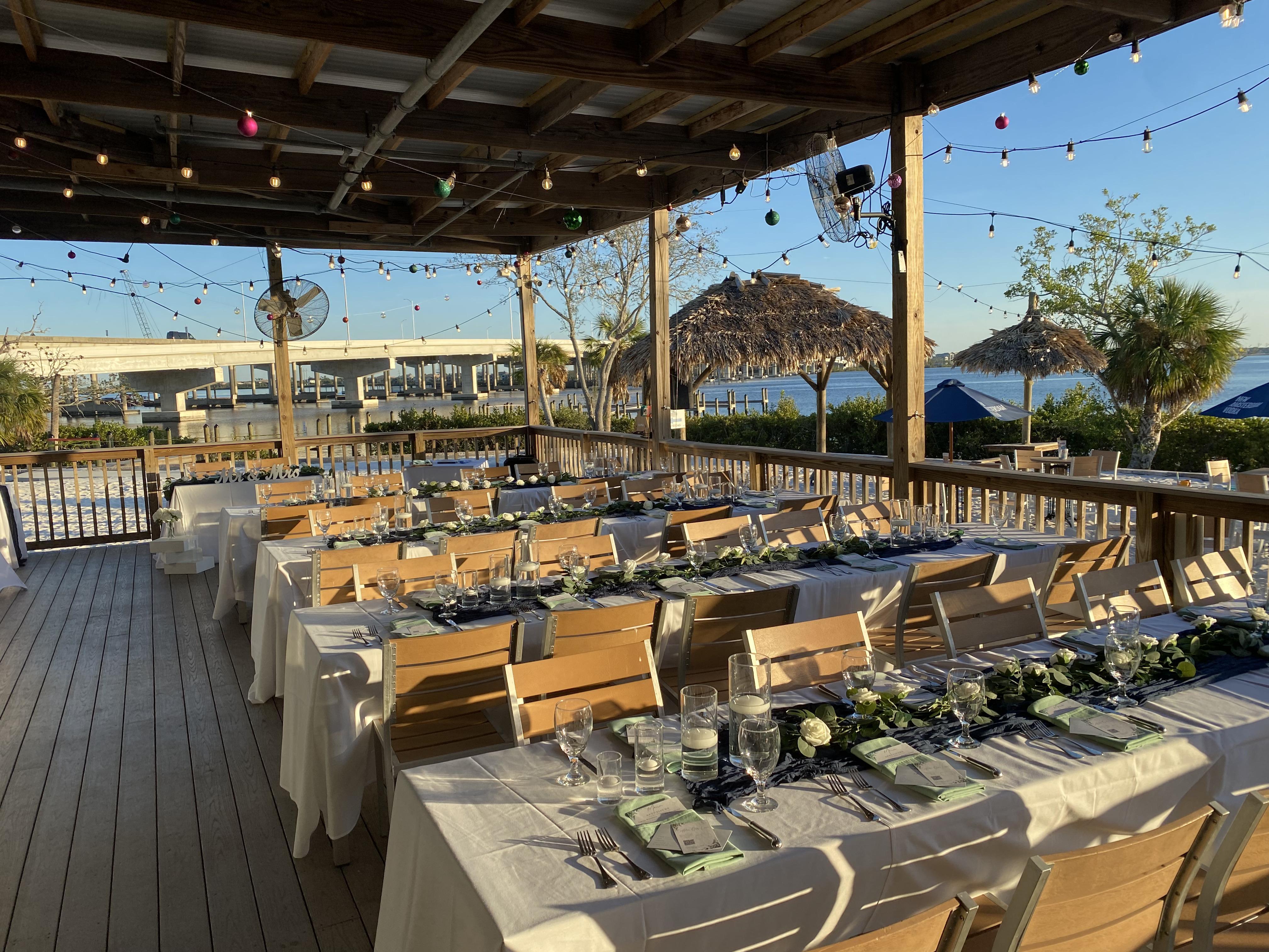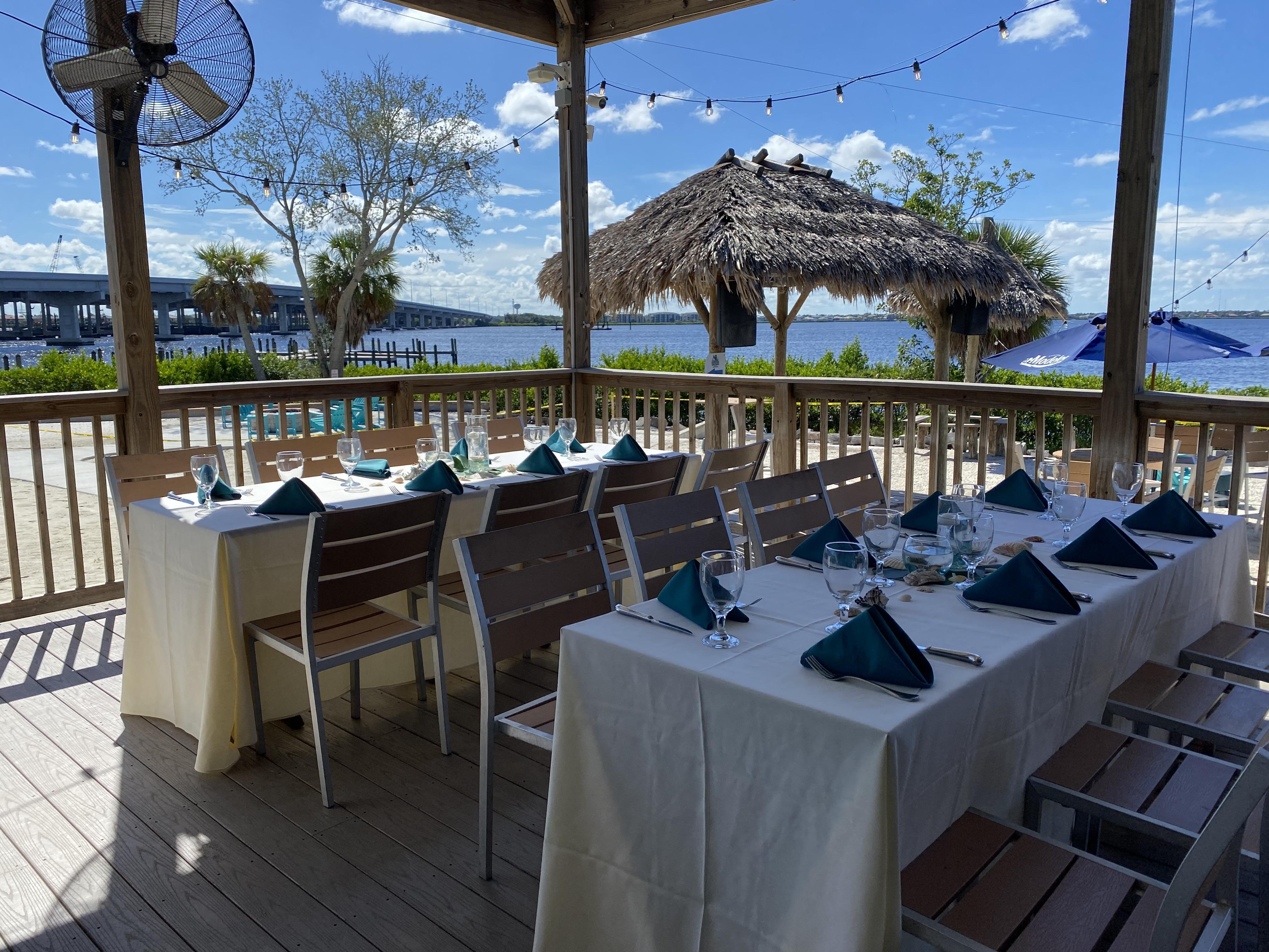Celebrate island-style on our Covered Deck, where river breezes, glowing sunsets, and waterfront views set the tone for a perfect coastal gathering. Overlooking the Manatee River, this open-air space is ideal for seated dinners, rehearsal parties, and receptions—offering shade, style, and laid-back tropical charm for your next unforgettable event.