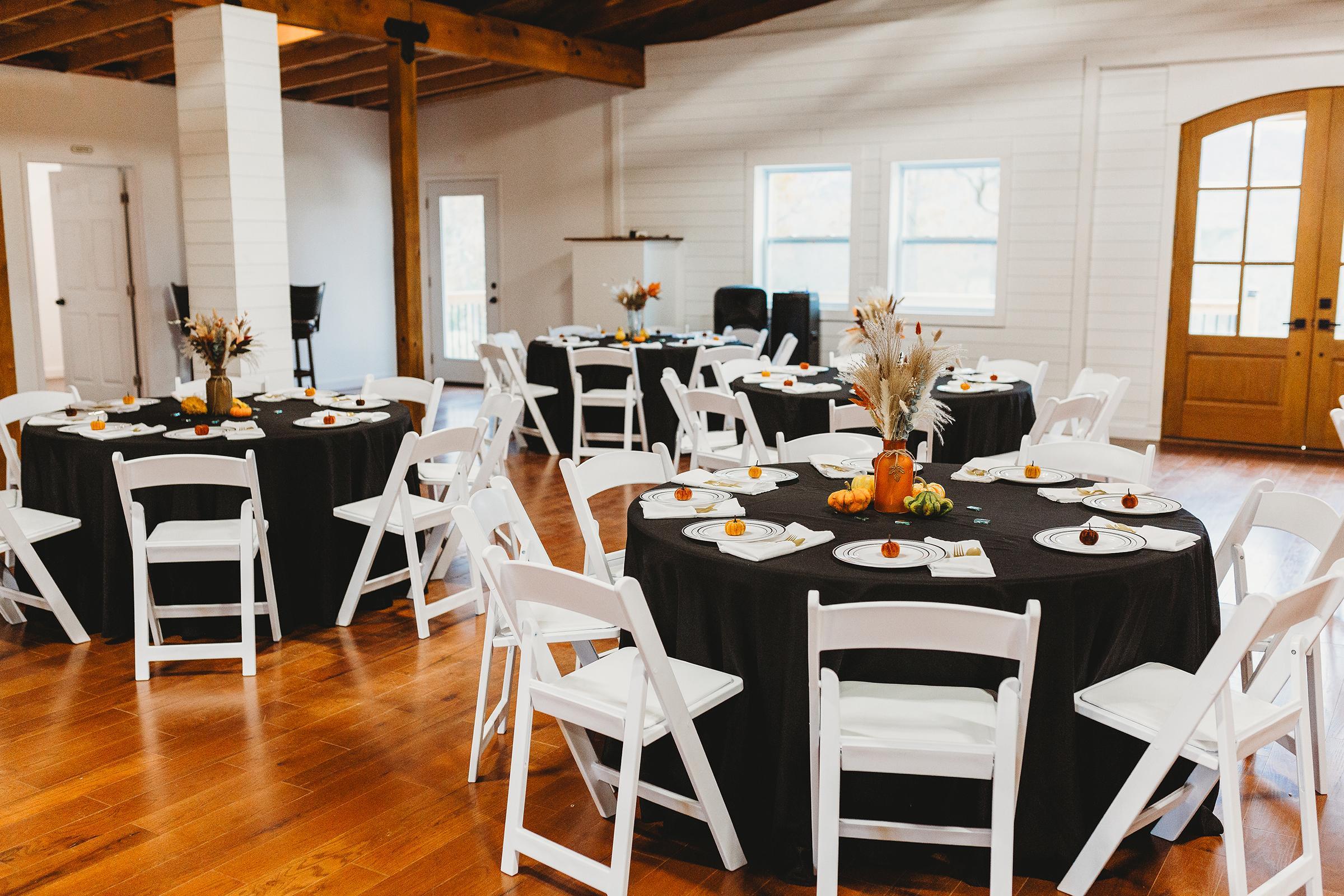 Round tables & chairs for 200, lighting customization, disco lighting, sound system with mic, heating and AC.