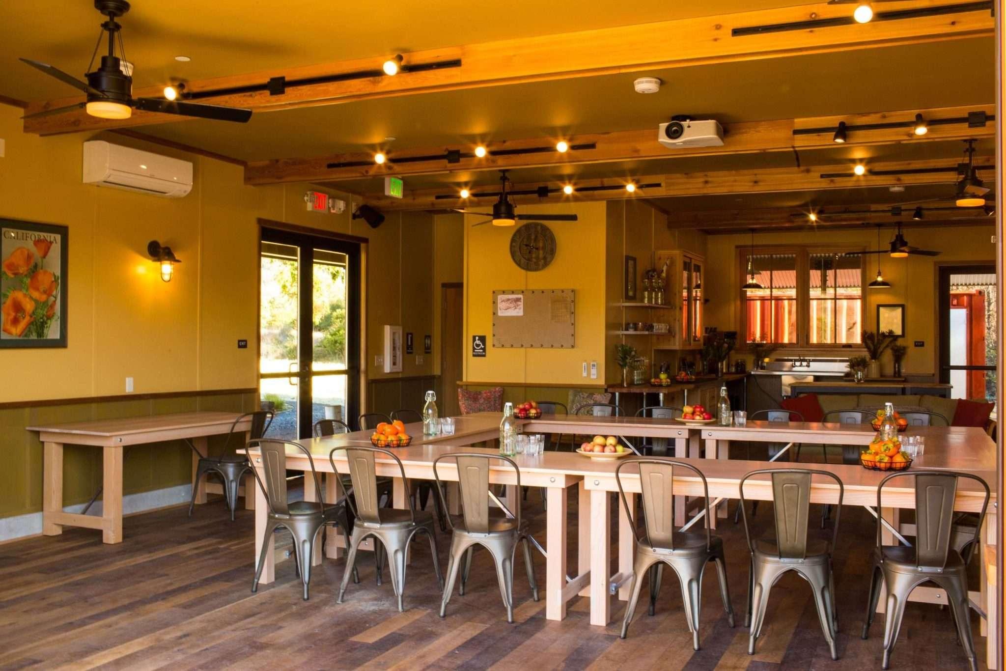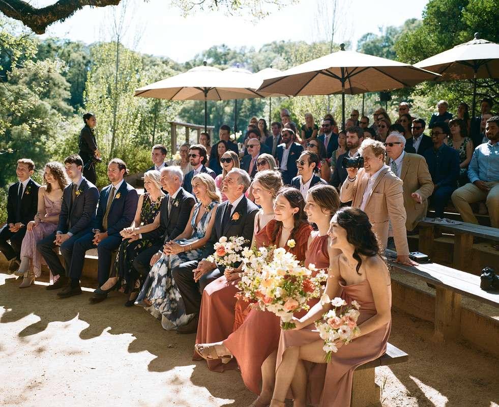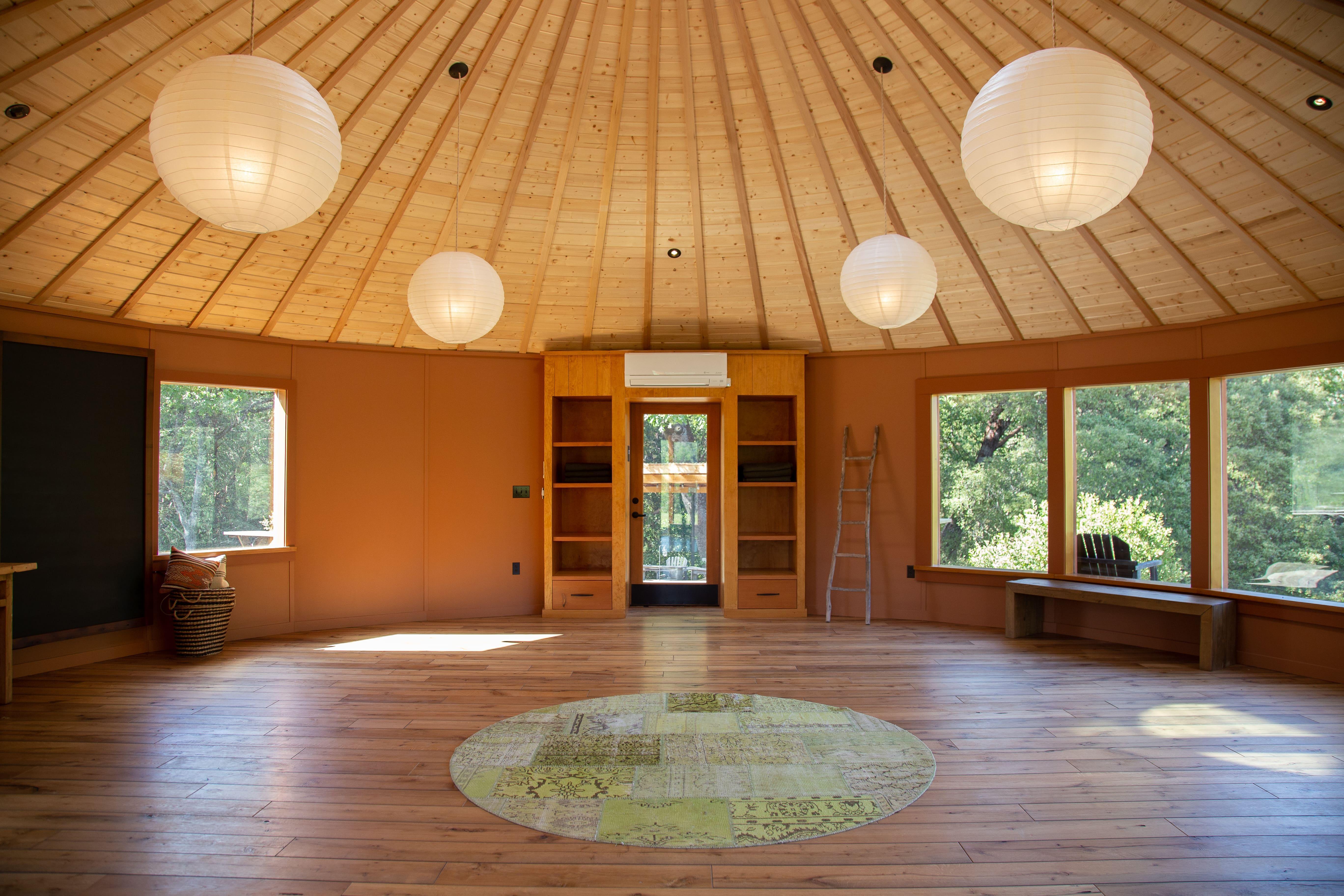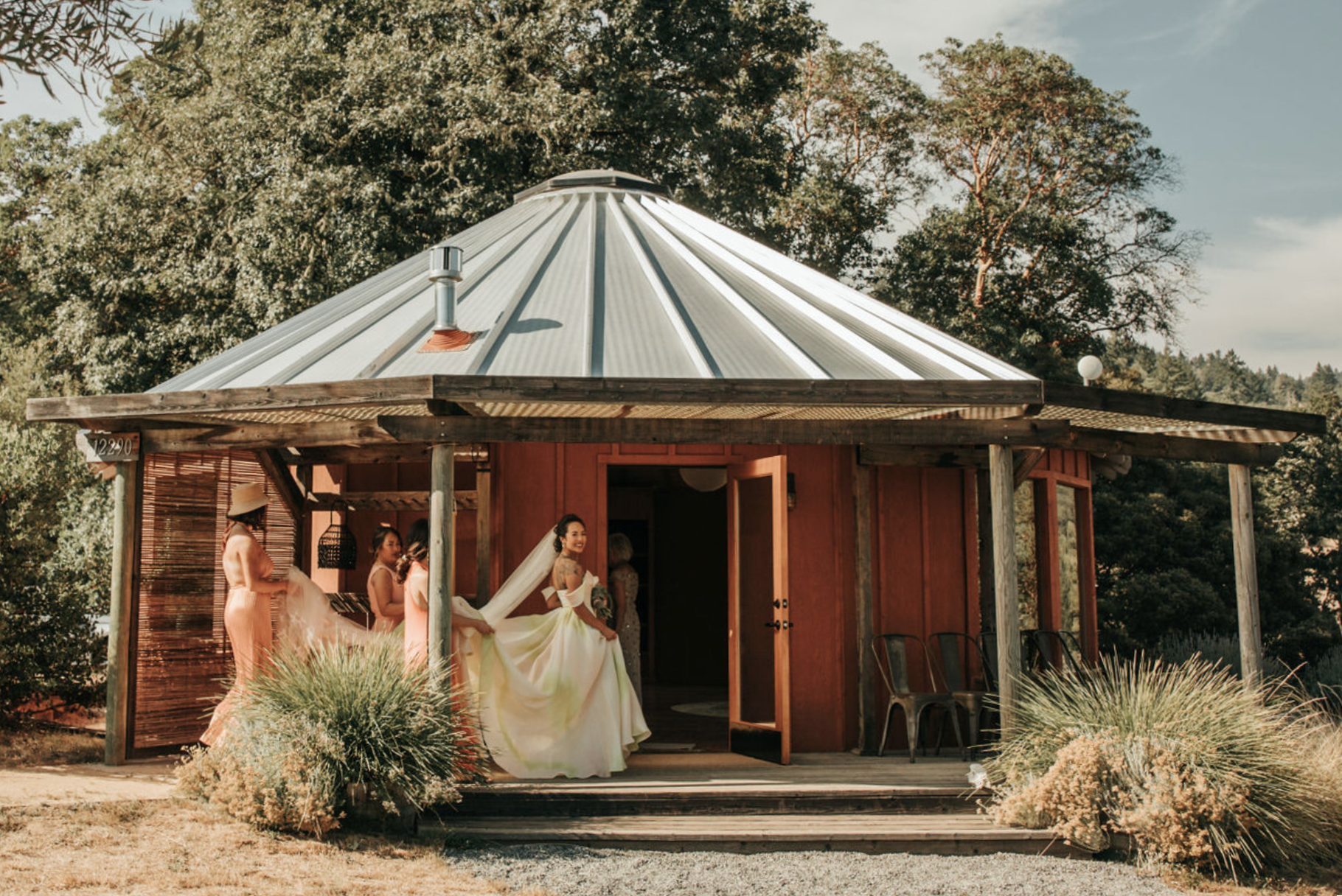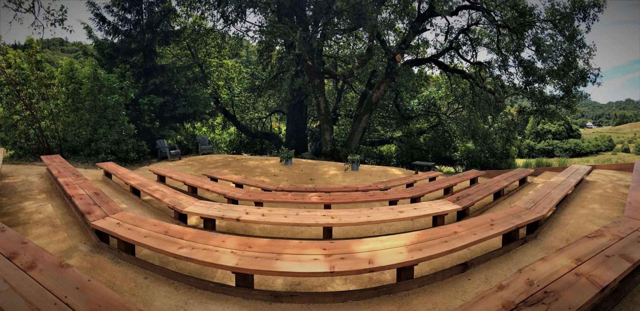 Our outdoor Amphitheater seats up to 150 under the shade of entwined madrone and oak trees. The nearby Madrone Yurt offers an air-conditioned retreat space with panoramic valley views, an ideal spot for group gatherings or for the wedding party and family to gather before the ceremony.