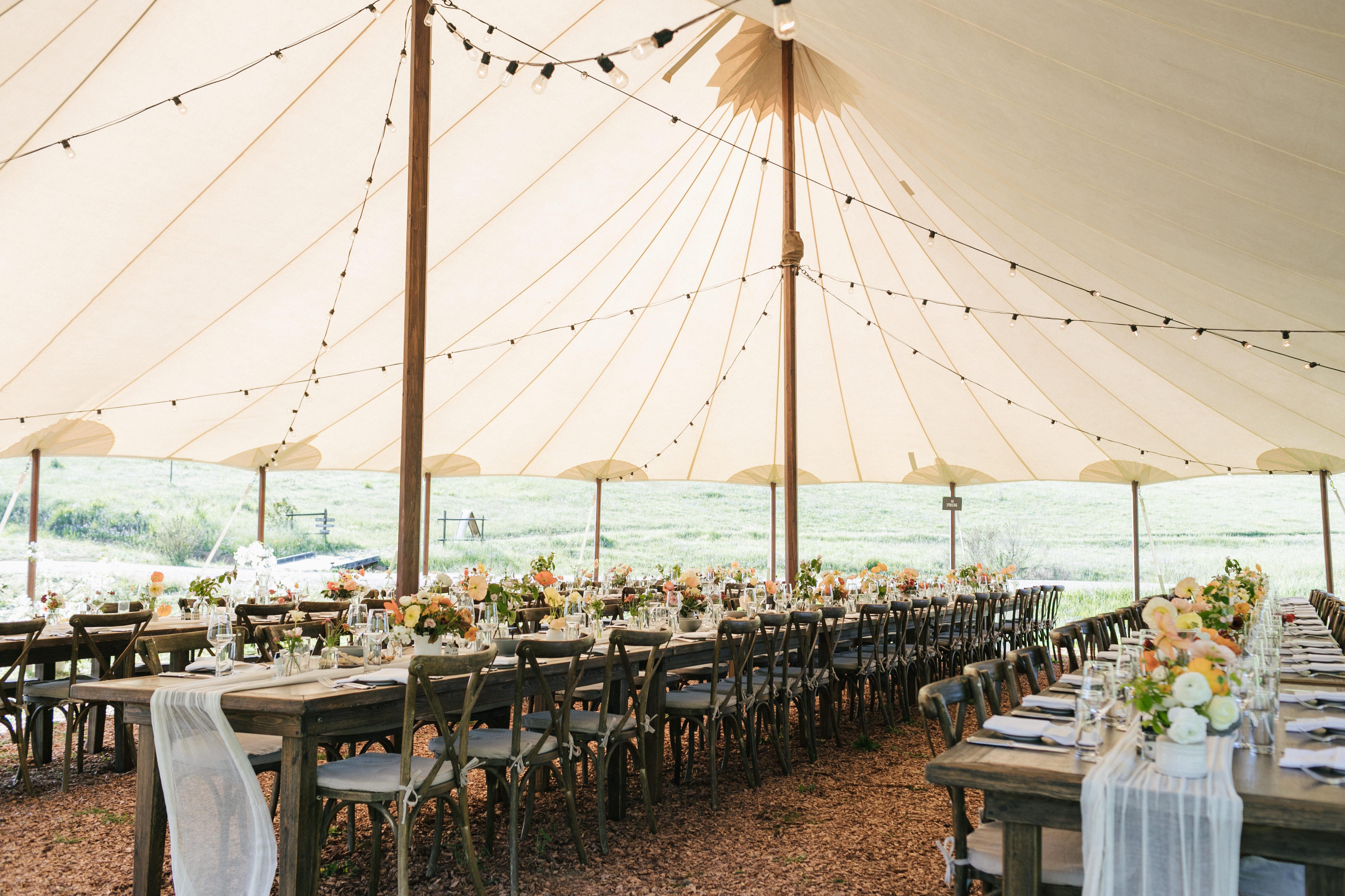 Our tent accommodates up to 150 people for dining, with lower seating capacity if the dance floor is incorporated. It Includes dimmable bistro lighting and a power source for music and toasts. The majestic tent’s side flaps are beautifully designed to comfortably protect guests from the elements while retaining expansive views of the valley.