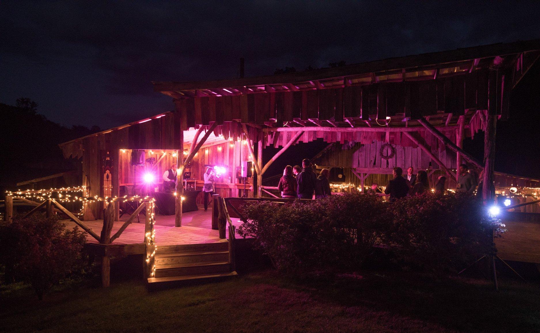Our large event barn is complete with a bar and stage for musical entertainment. The barn can seat up to 80-100 people and is equipped with electricity, water, and bathrooms. Event tents, ceremony chairs, farm tables, and wooden benches are also available for rent. If you need more space for guest seating, rent a tent and set it up next to the barn. There is no limit on how many people you can have on the property.