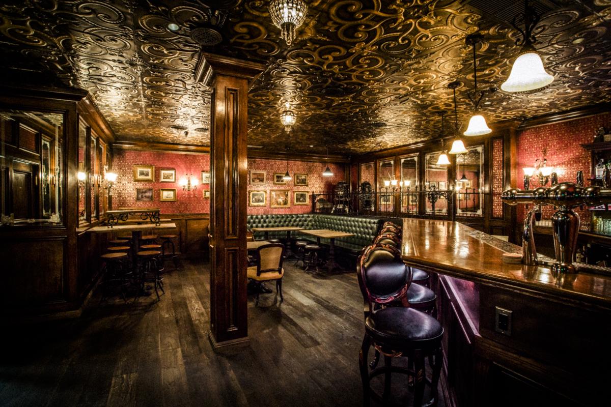 Ornate etched mirrors, gilded light fixtures, shiny glass beads all add great warmth and charm to the space. Our wood paneling and custom made wallpaper complete the look with an ostentatious gilded bar. Directly across from the beautiful bar are three red velvet banquettes for seating. scattered seating throughout are perfect for cocktail style events.